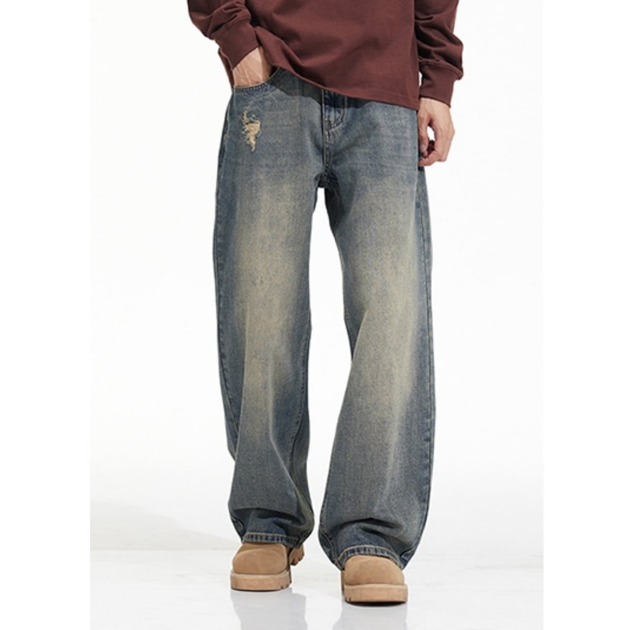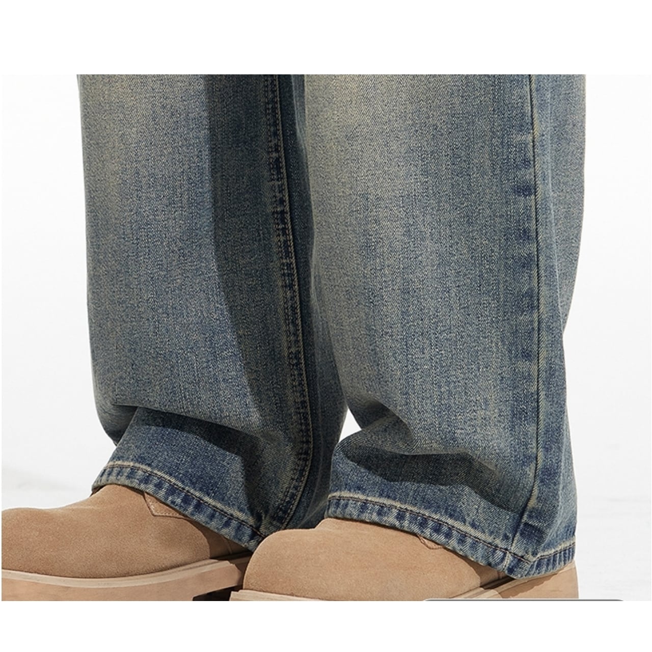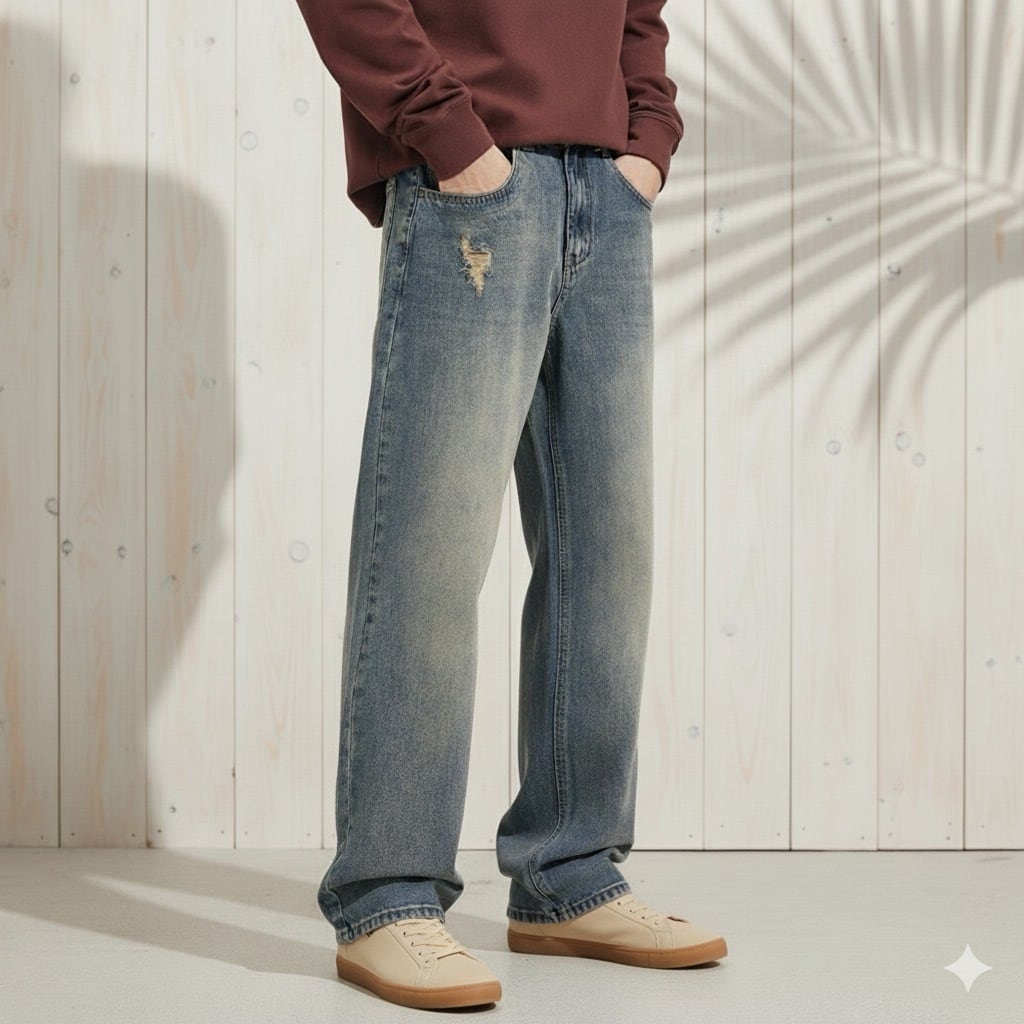 ゆったりとしたワイドレッグシルエットが特徴のデニムパンツ