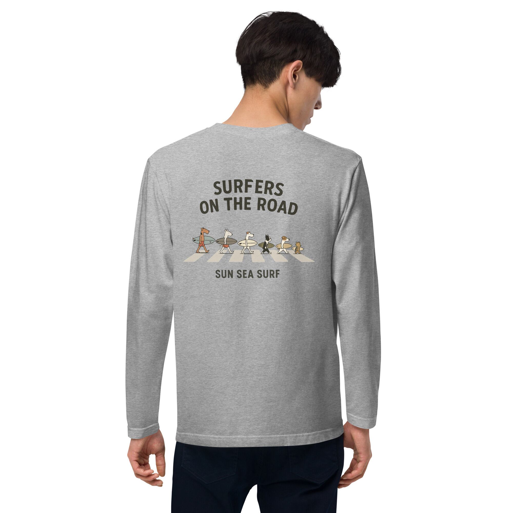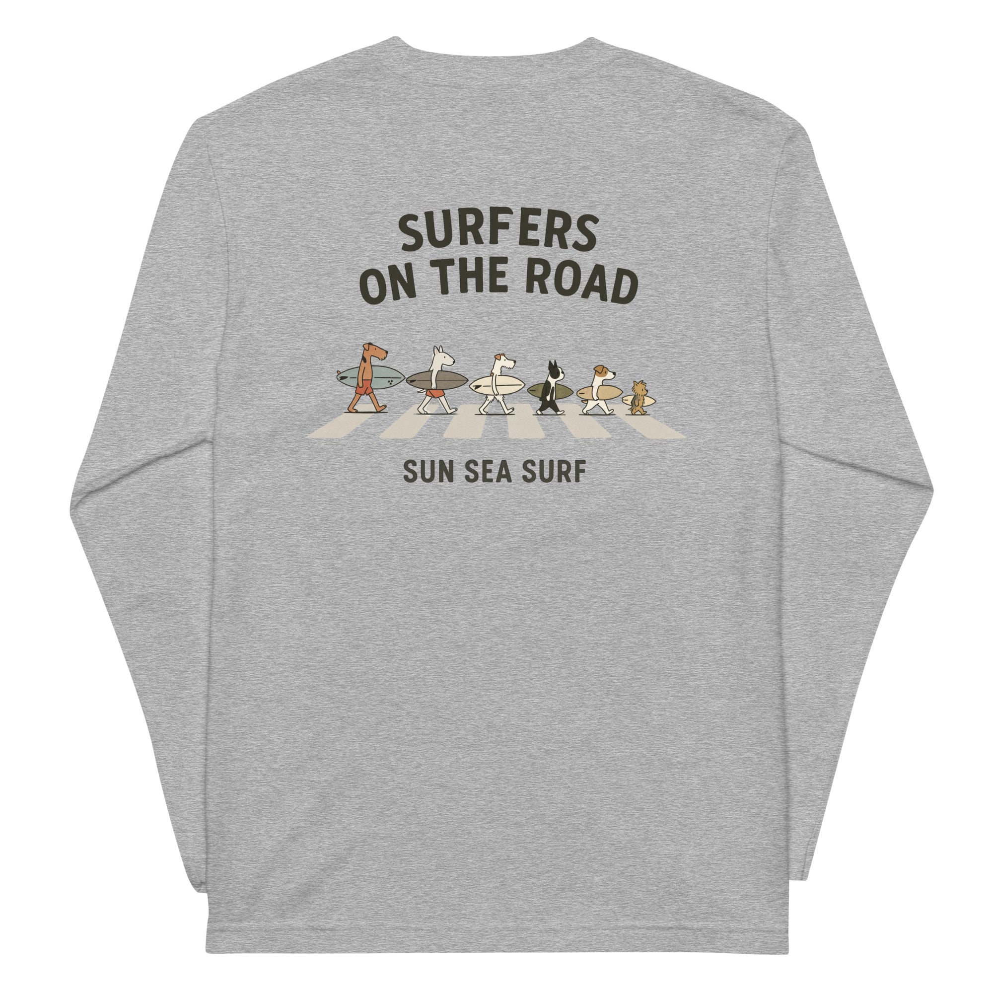 サーフボードを抱えたテリアたちが横断歩道を行進するユニークなデザイン