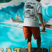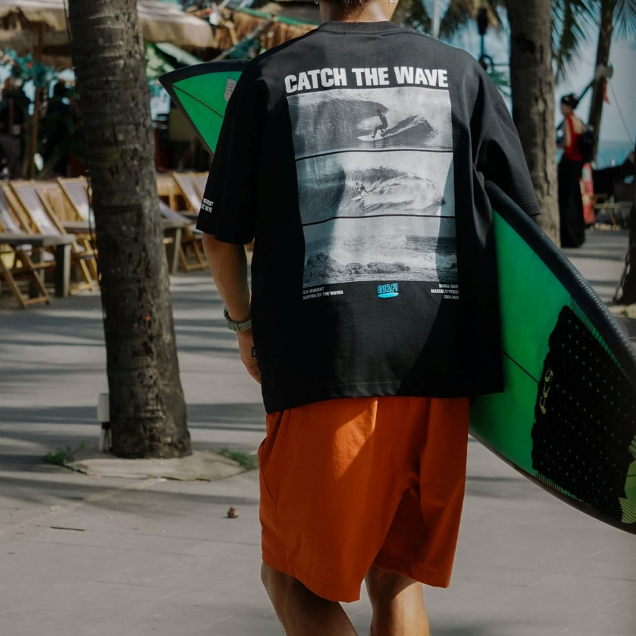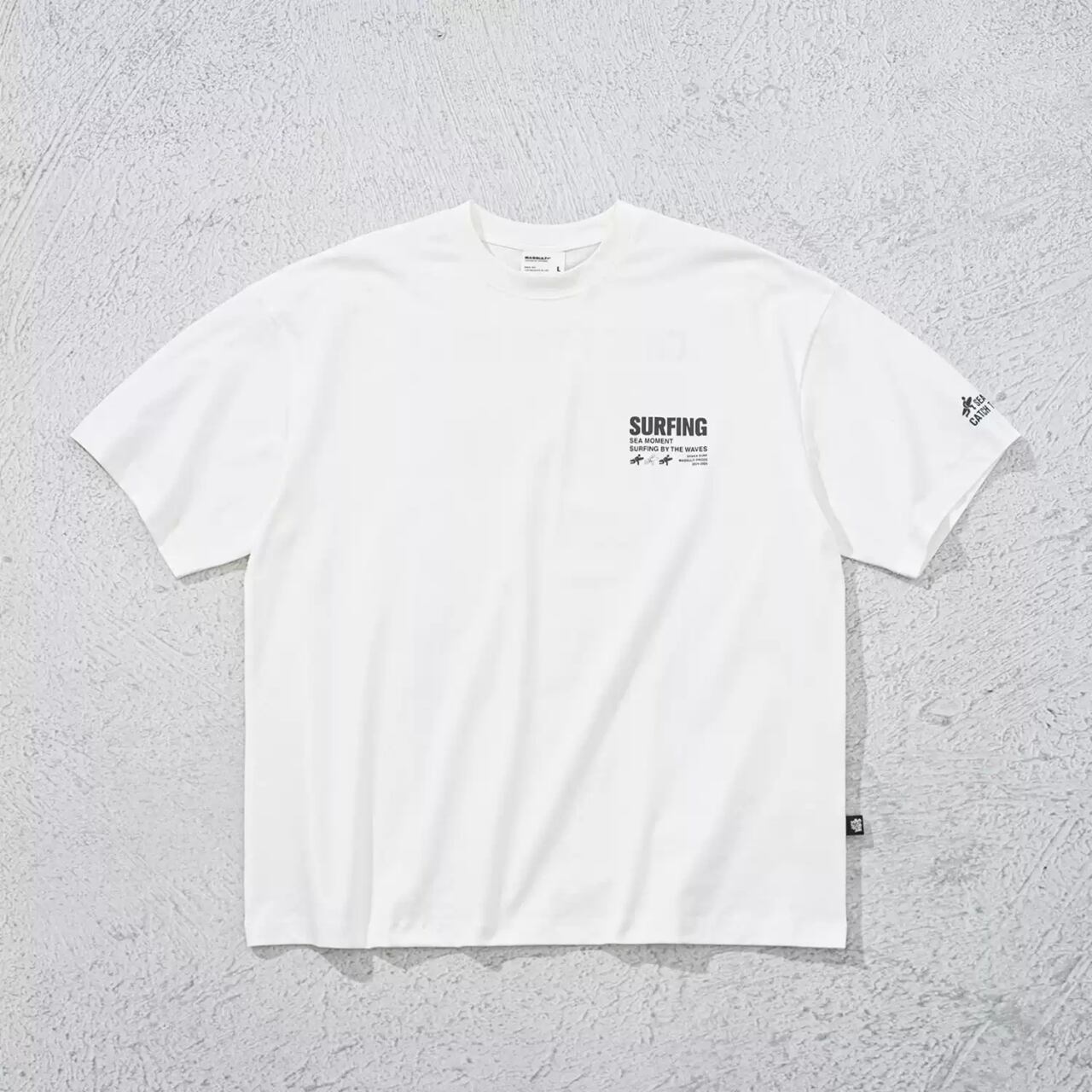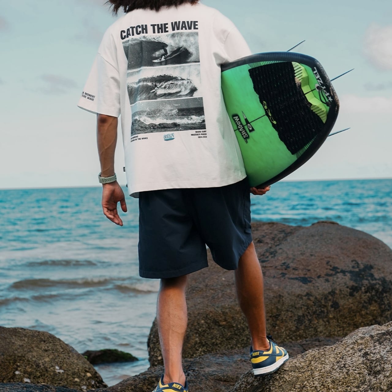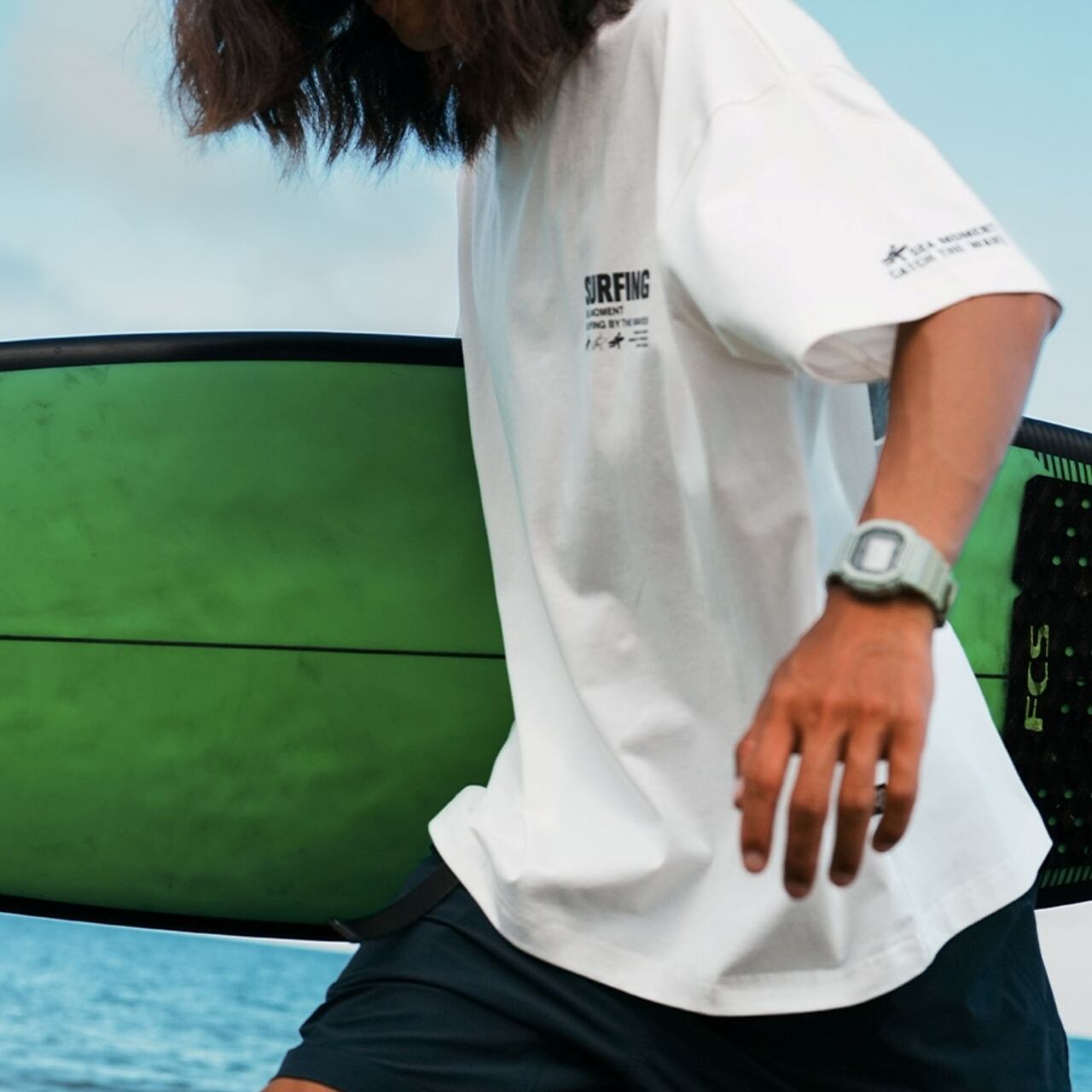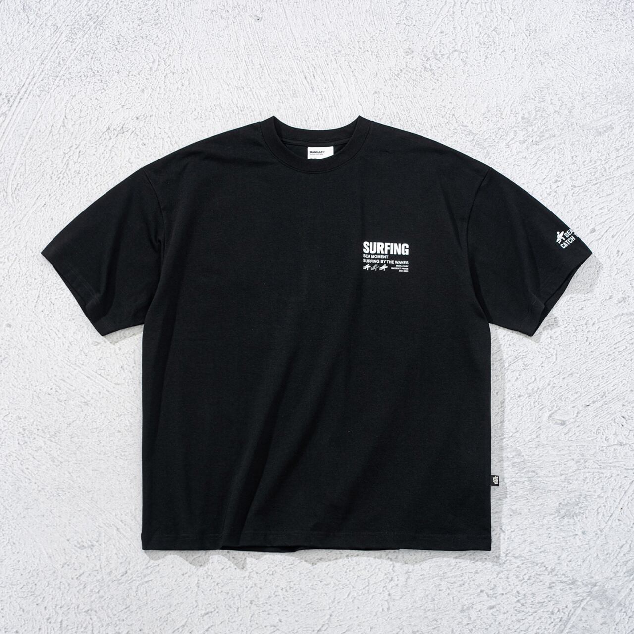 背中一面に、波に乗るサーファーの躍動感あふれるモノクロ写真がプリントされたTシャツ