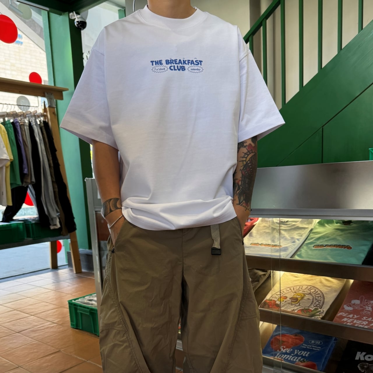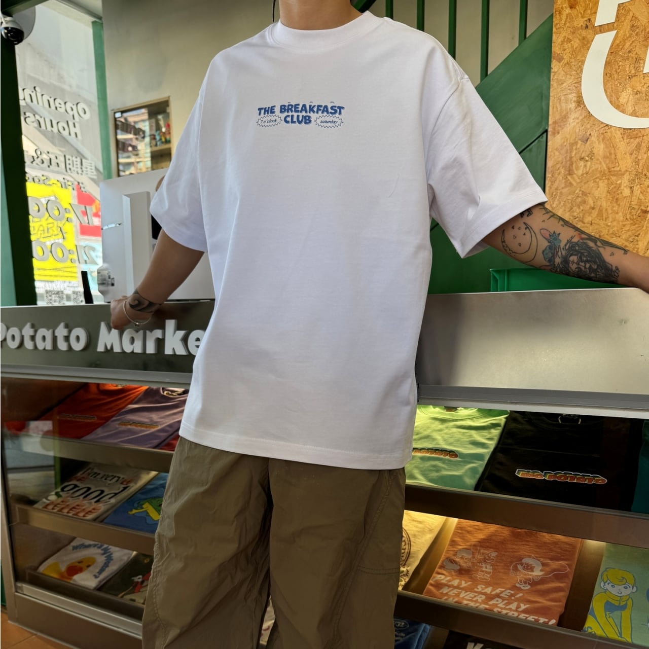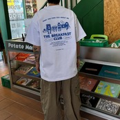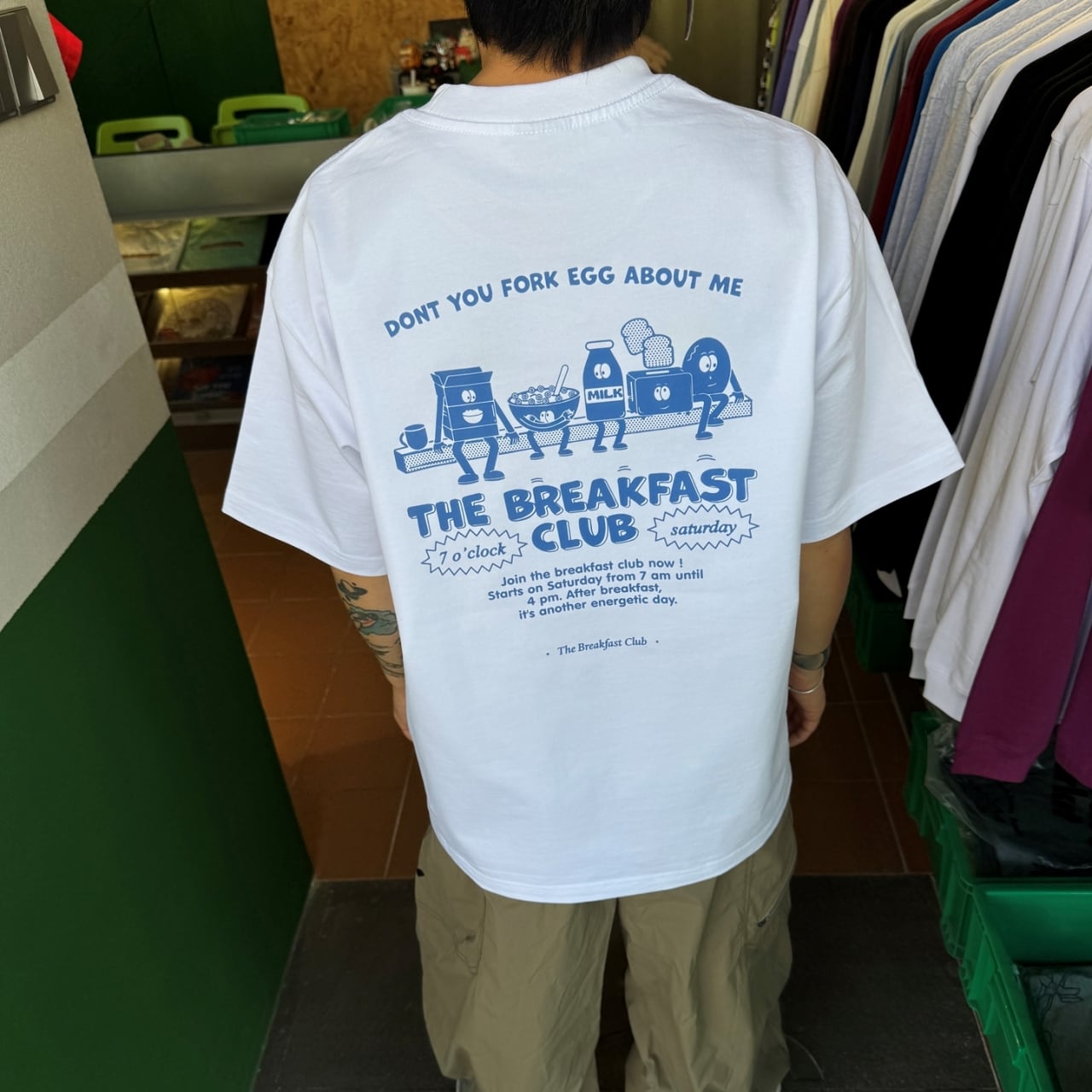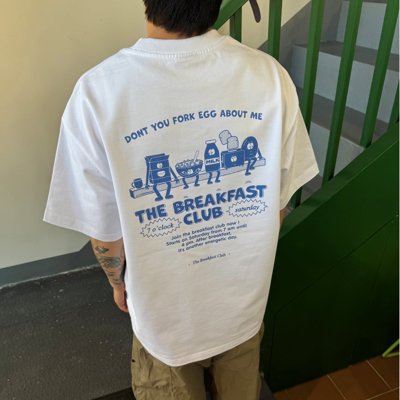 ユーモラスな朝食モチーフのバックプリントが魅力のクルーネックTシャツ