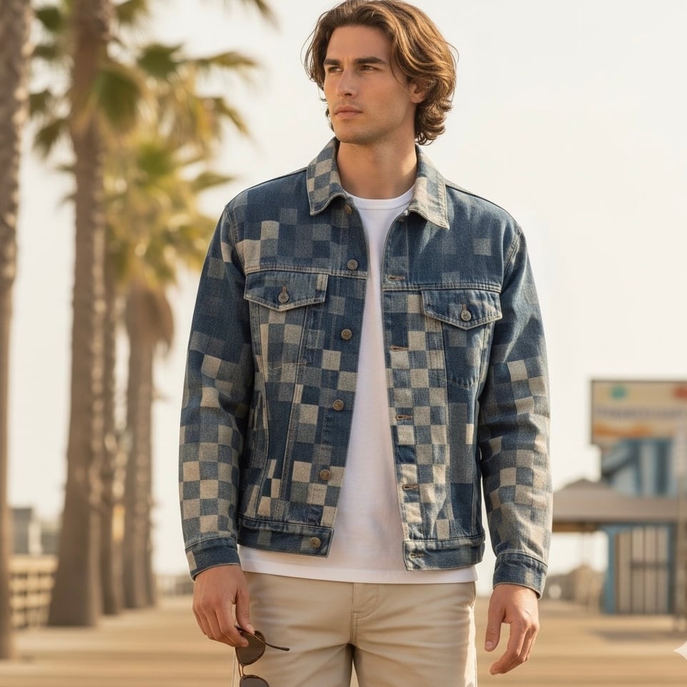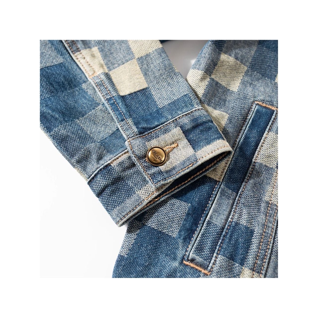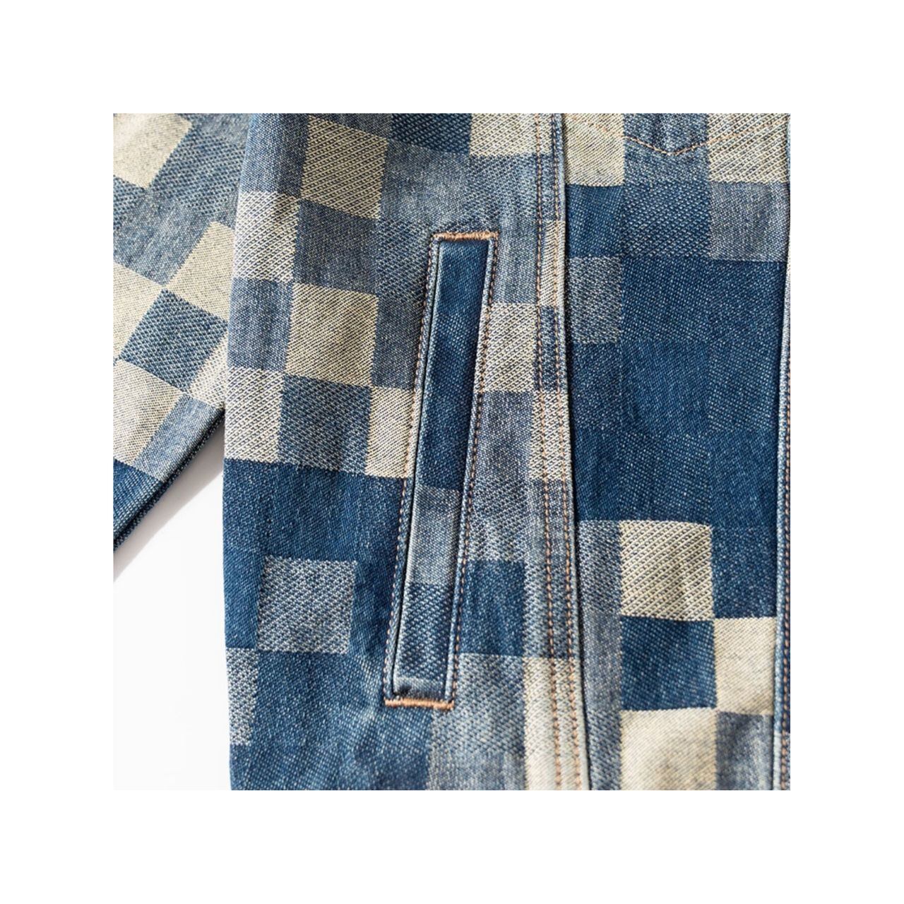 潮風に晒されたような絶妙な退色と、デジタルアートのようなピクセルチェックを大胆に組み合わせたデニムジャケット
