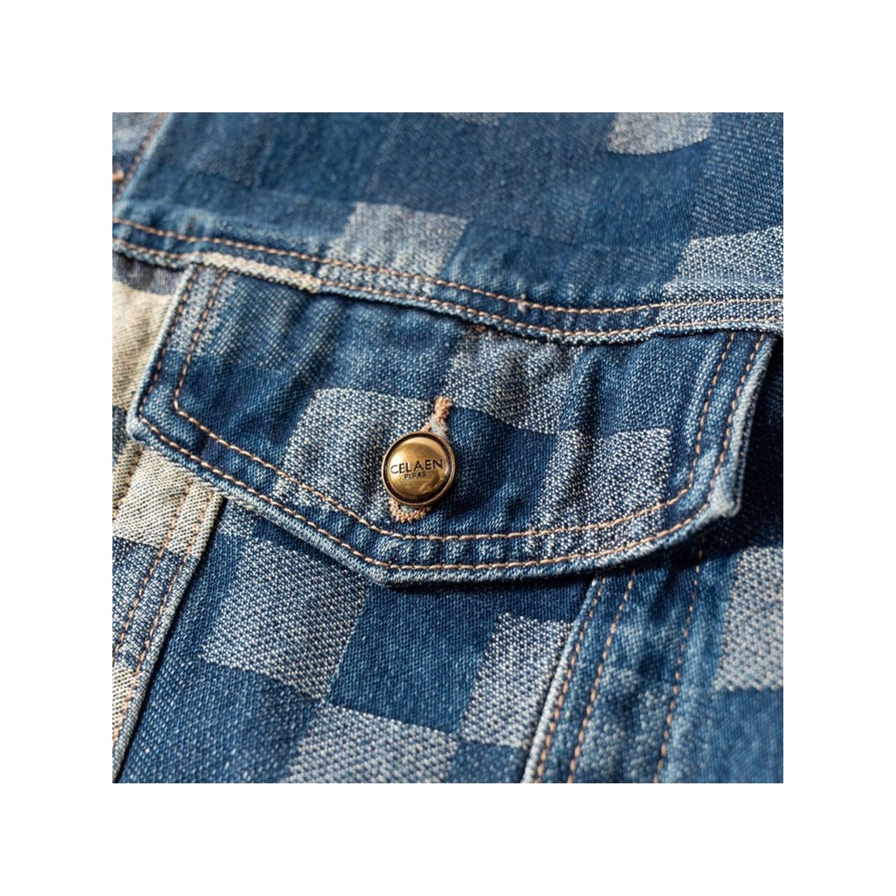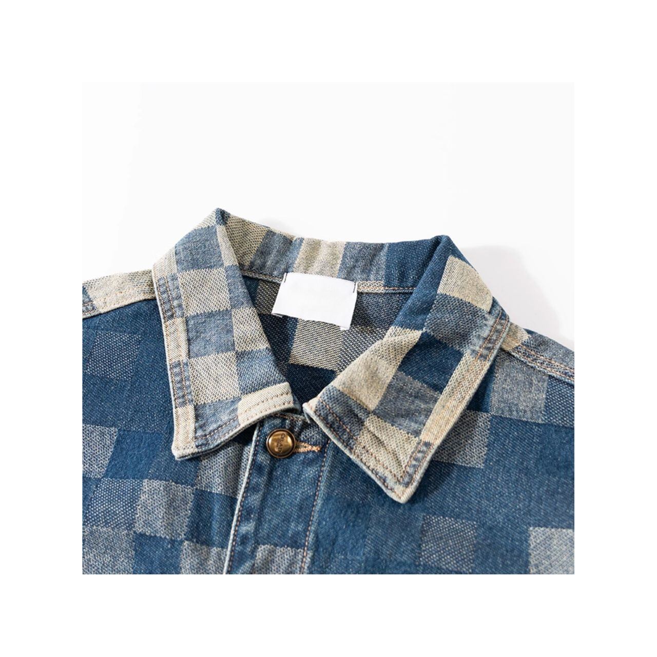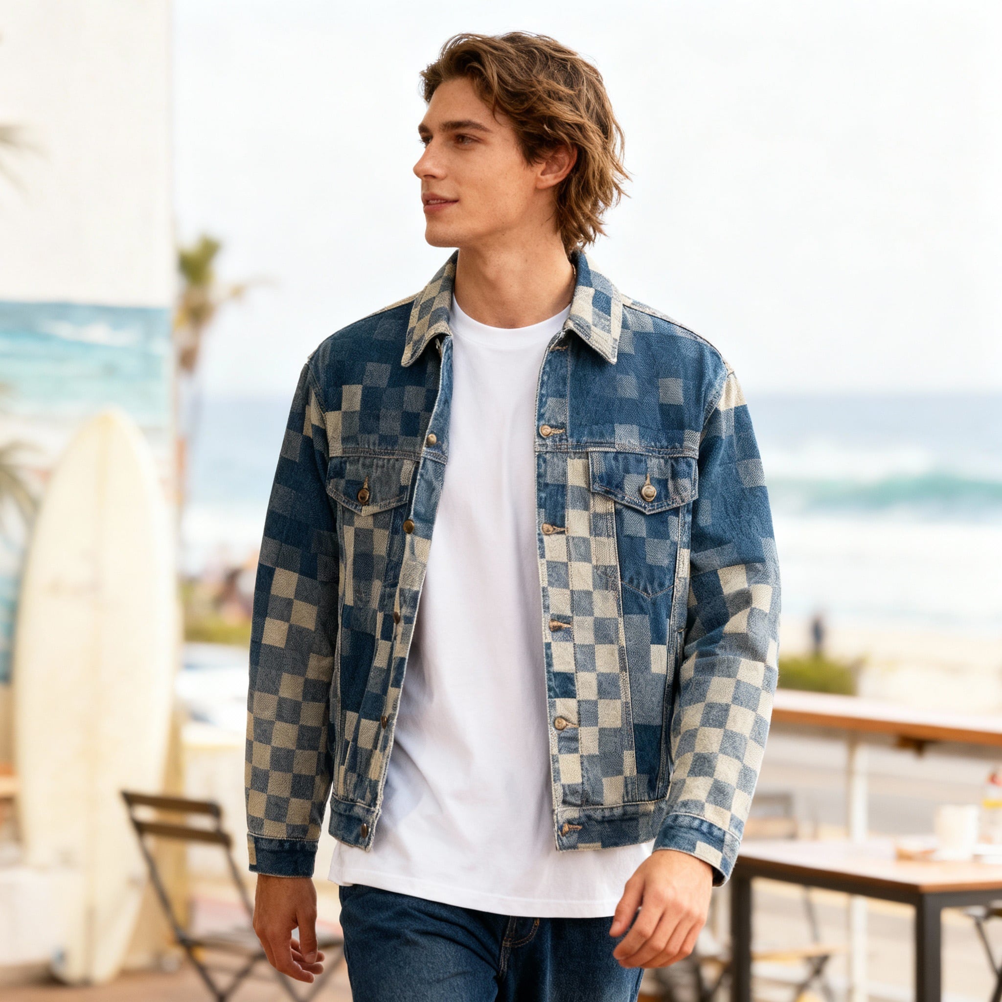 潮風に晒されたような絶妙な退色と、デジタルアートのようなピクセルチェックを大胆に組み合わせたデニムジャケット