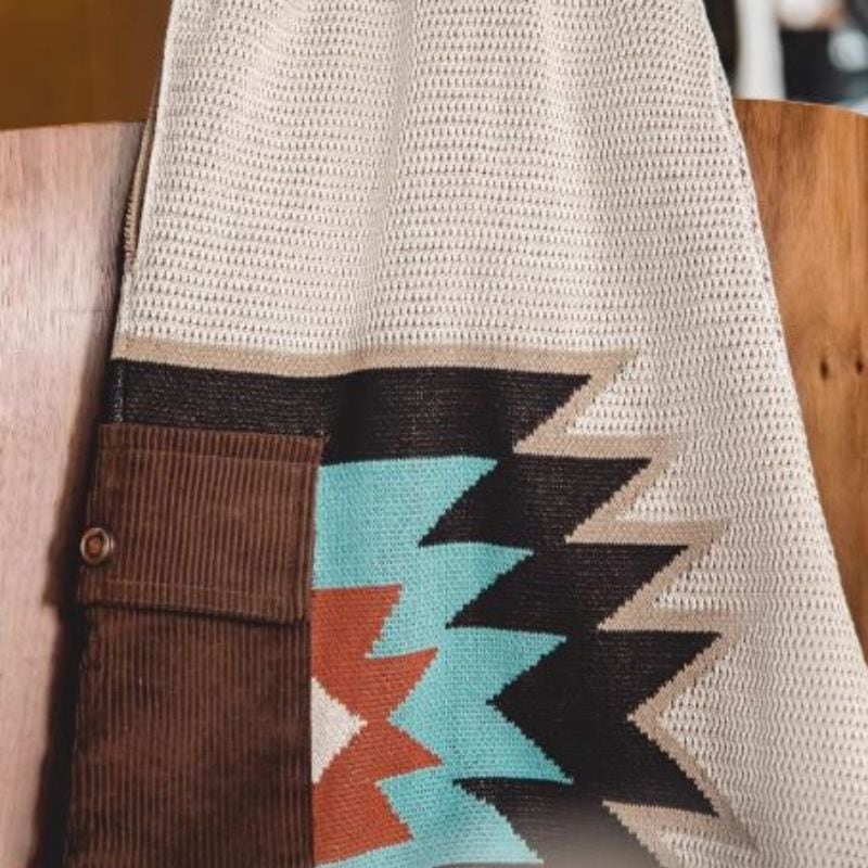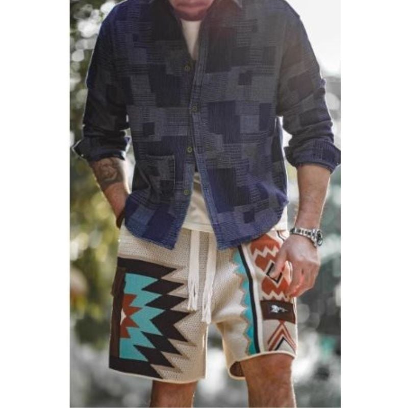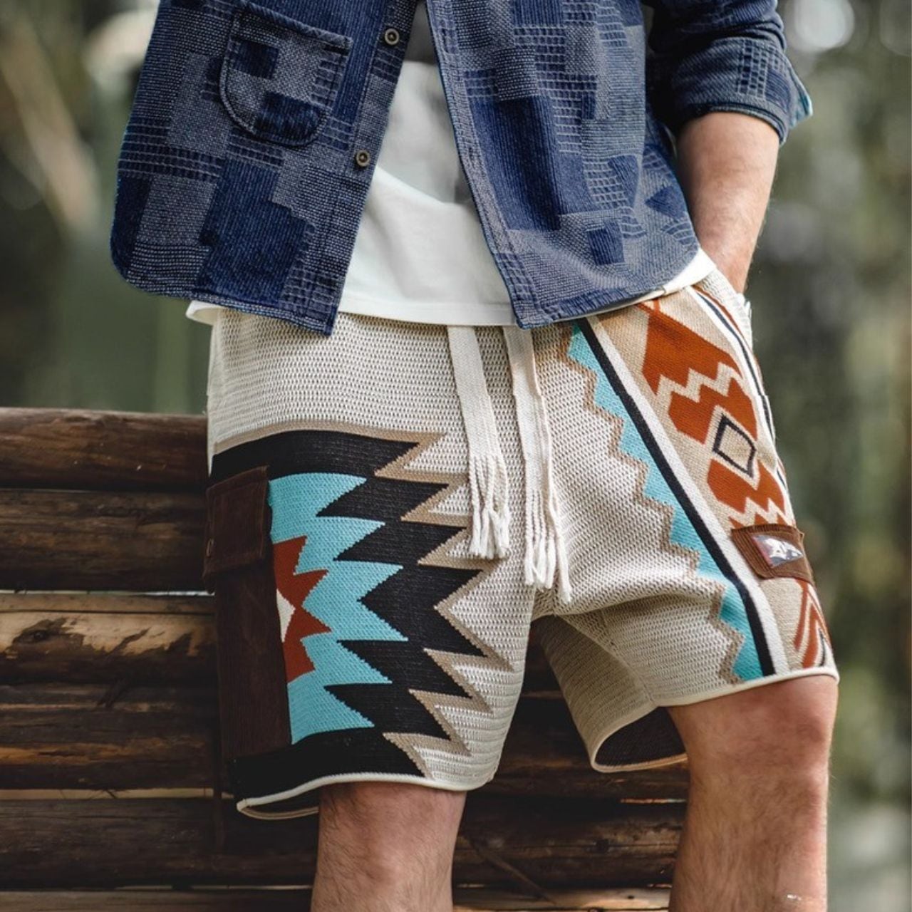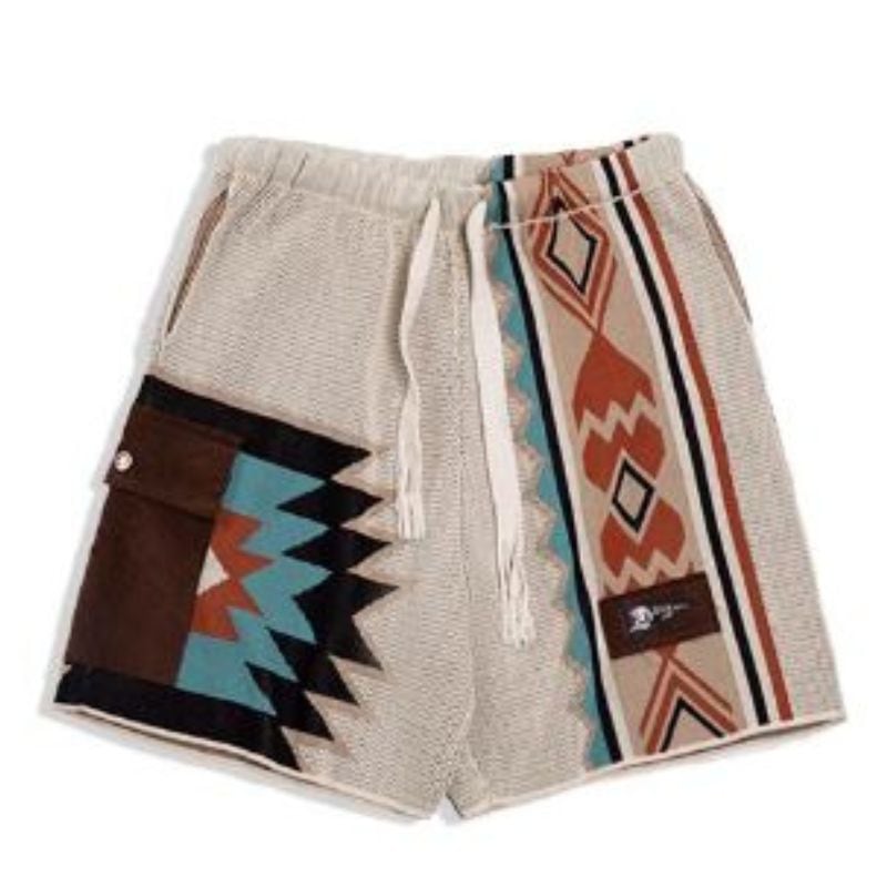 ネイティブアメリカン調の力強いアートパターンをサイドに配したハーフパンツ