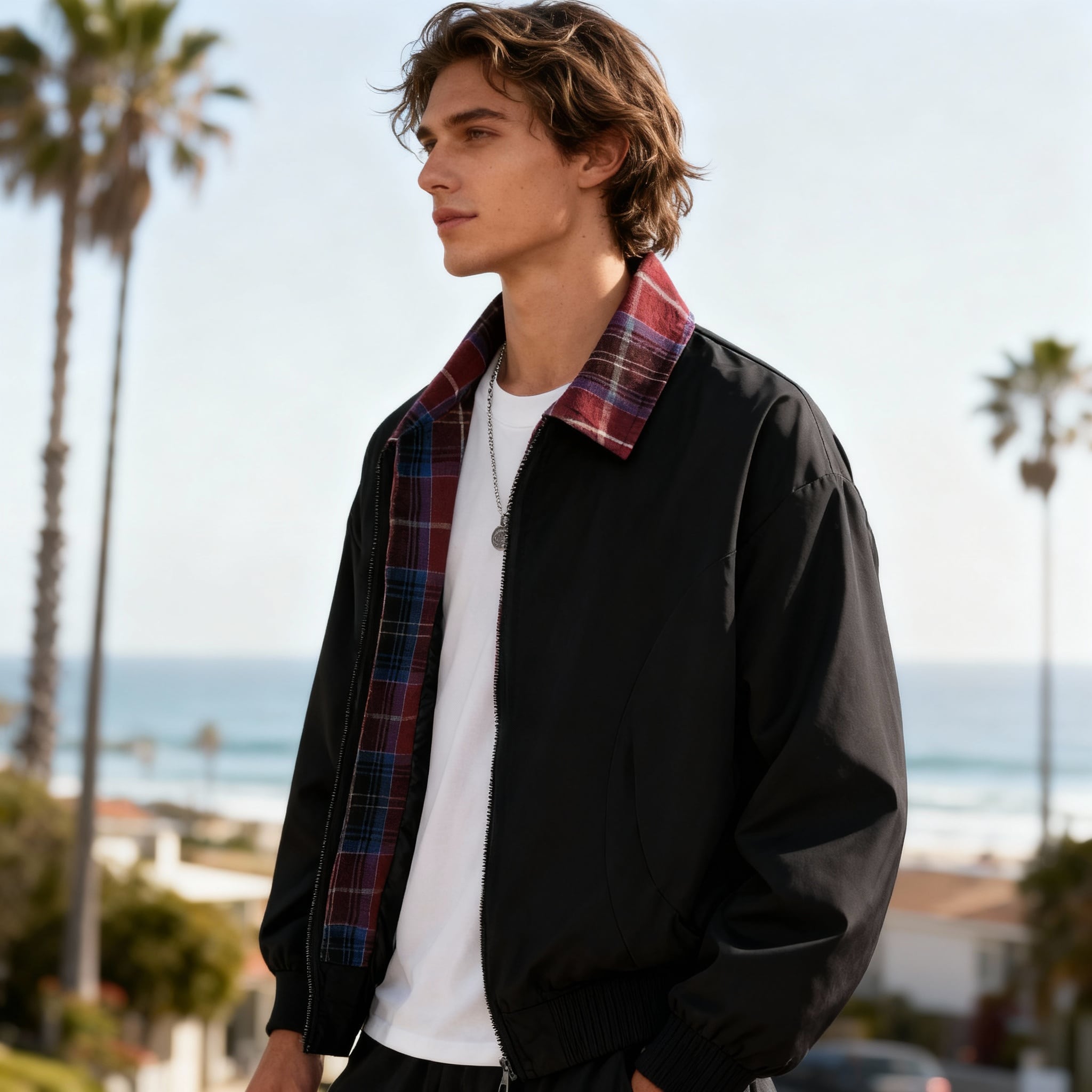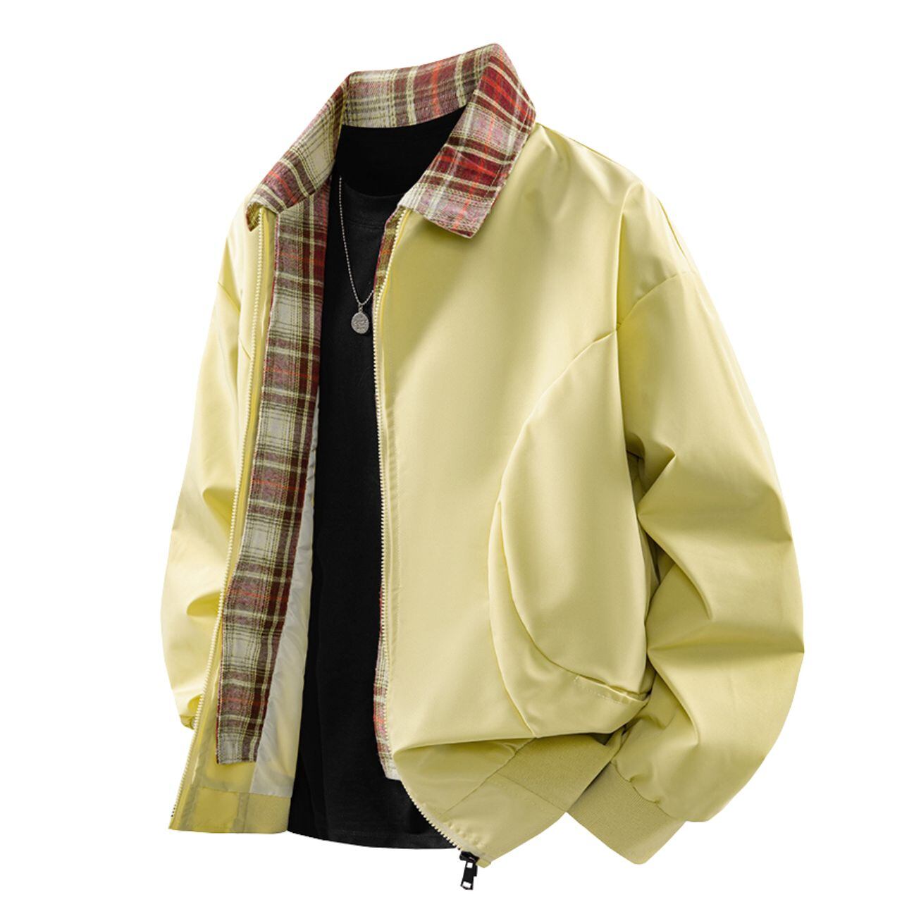 襟元と内側のチェック柄がさりげないアクセントになり、普段のコーディネートに遊び心をプラスできます。