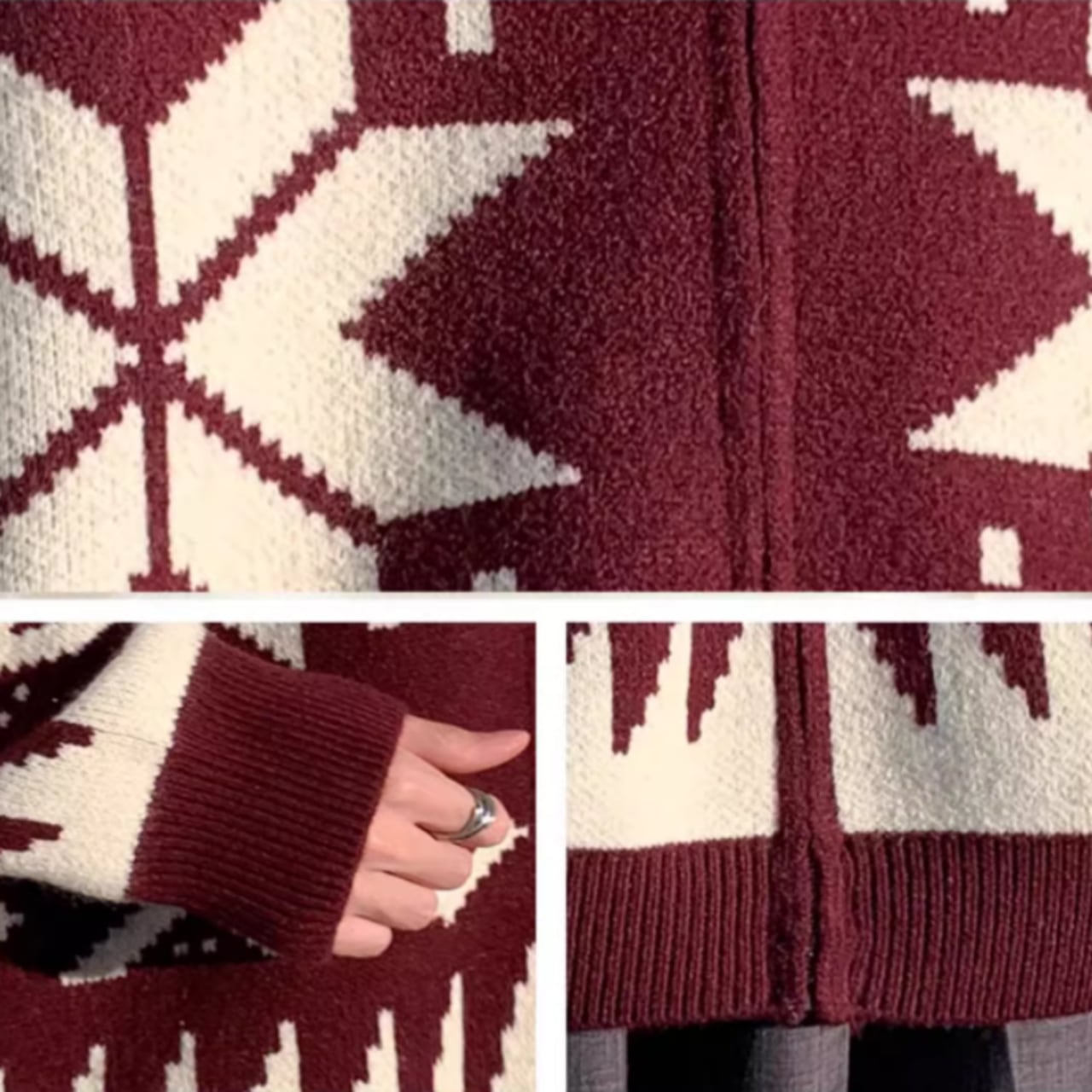 雪の結晶をモチーフにした柄が目を引く、フルジップのニットジャケット。