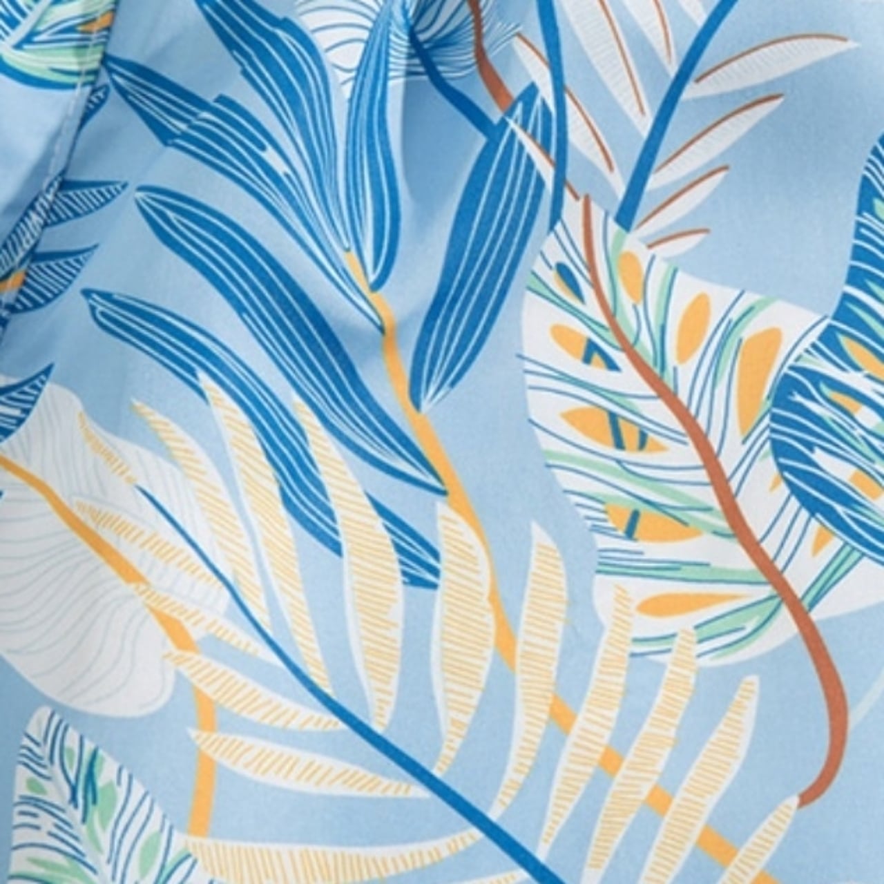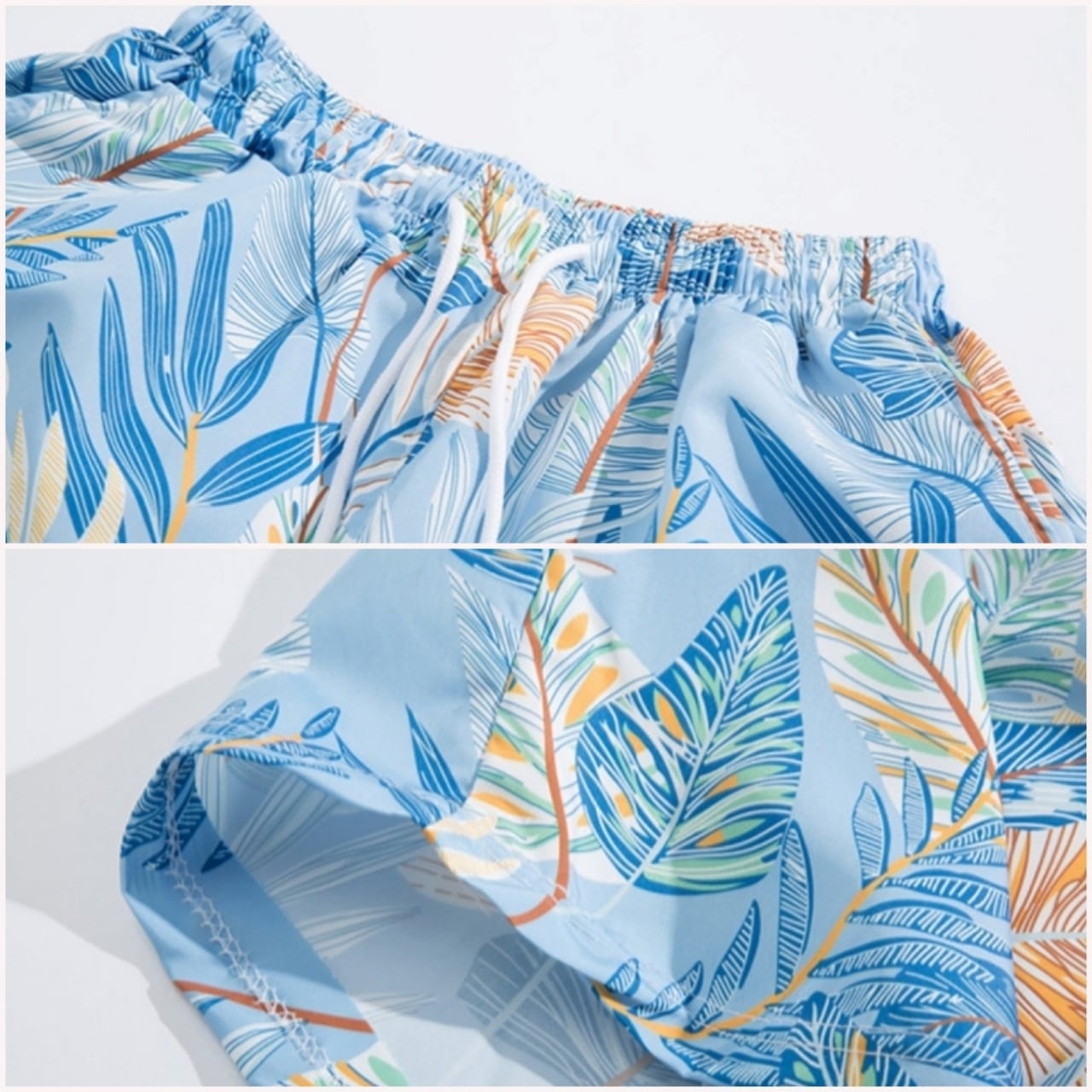 太陽が降り注ぐ南国の風景を切り取ったような、鮮やかなリーフ柄を全面に散りばめたハーフパンツ。