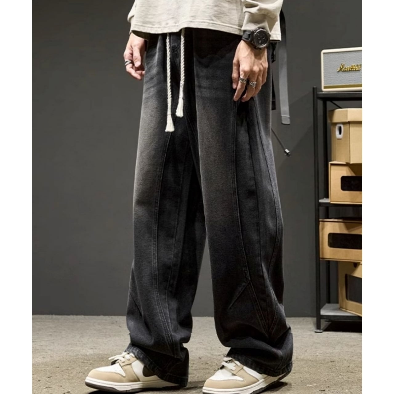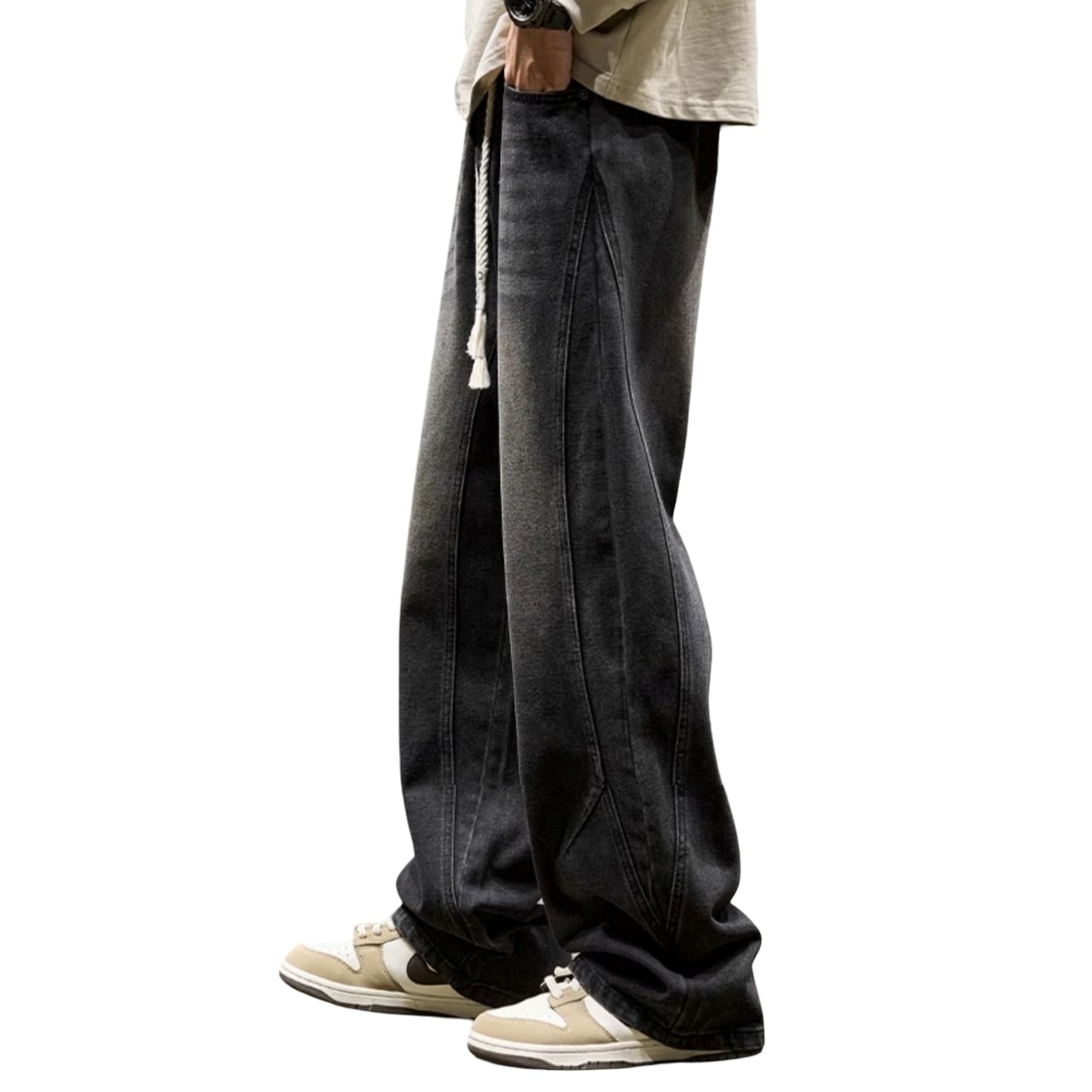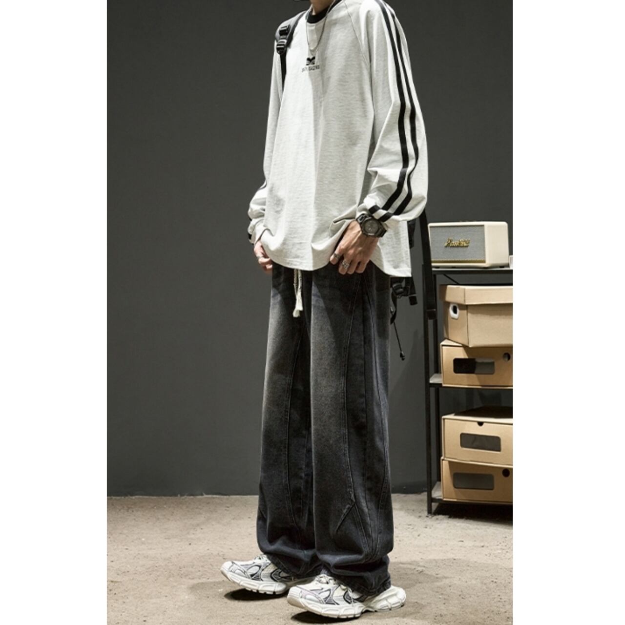 ストンと落ちるワイドなシルエットとセンターシームが、リラックス感の中にもすっきりとした印象を与えます。
