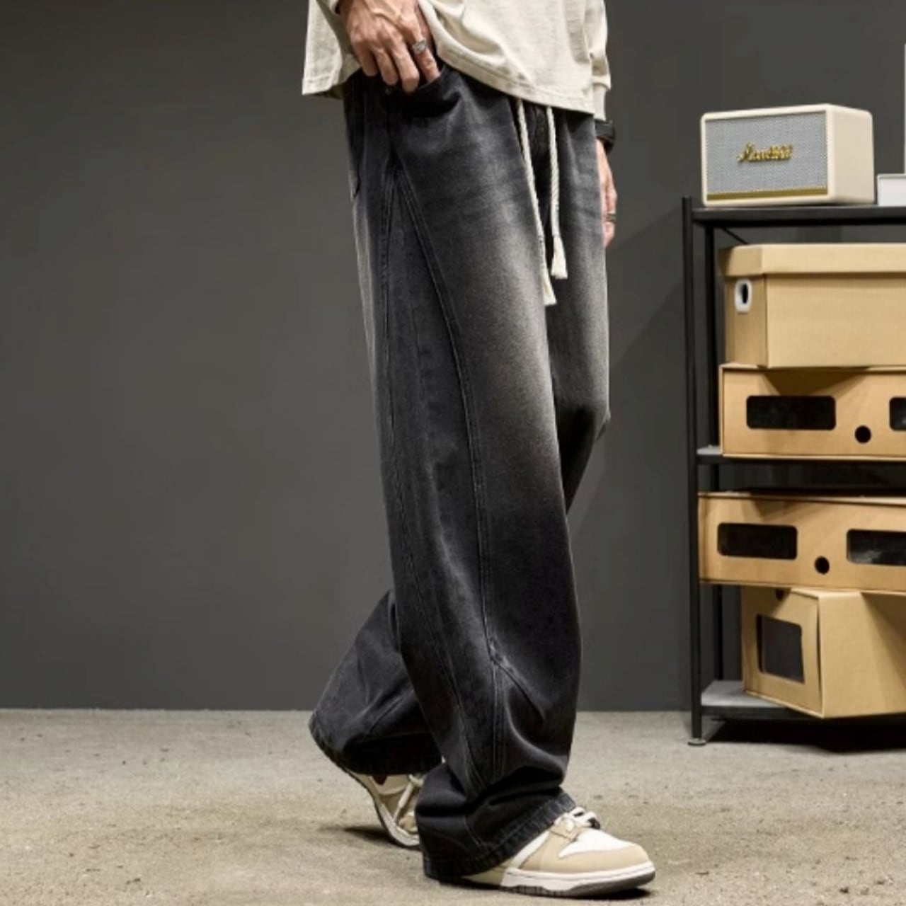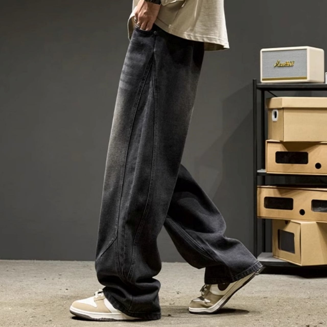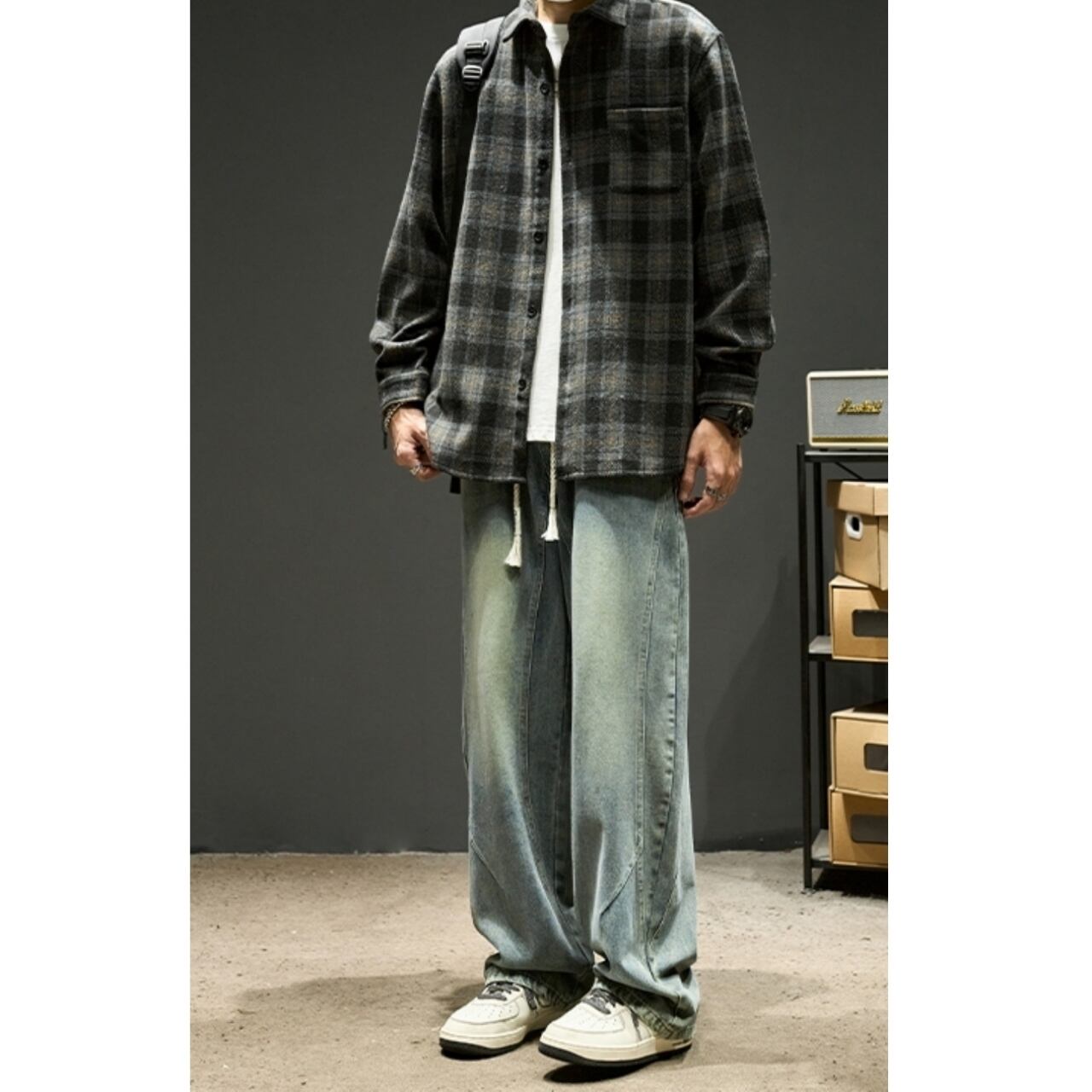 ストンと落ちるワイドなシルエットとセンターシームが、リラックス感の中にもすっきりとした印象を与えます。