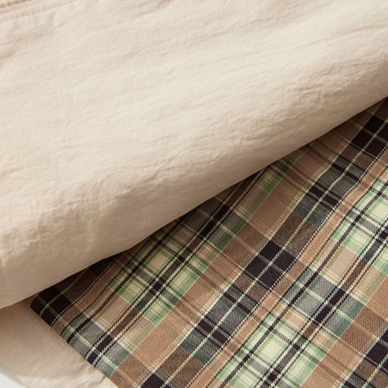 異素材の襟と、開けた時にちらりと見えるチェック柄の裏地が、着こなしに遊び心をプラスします。