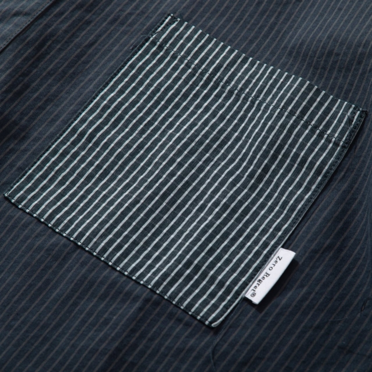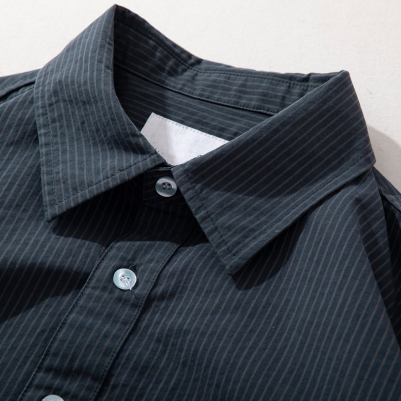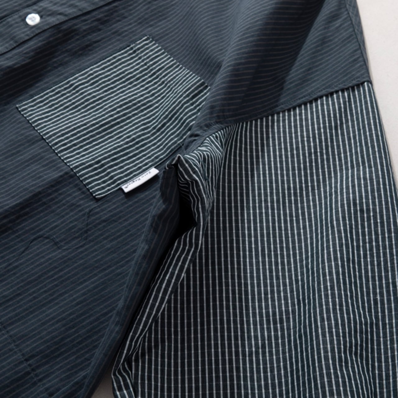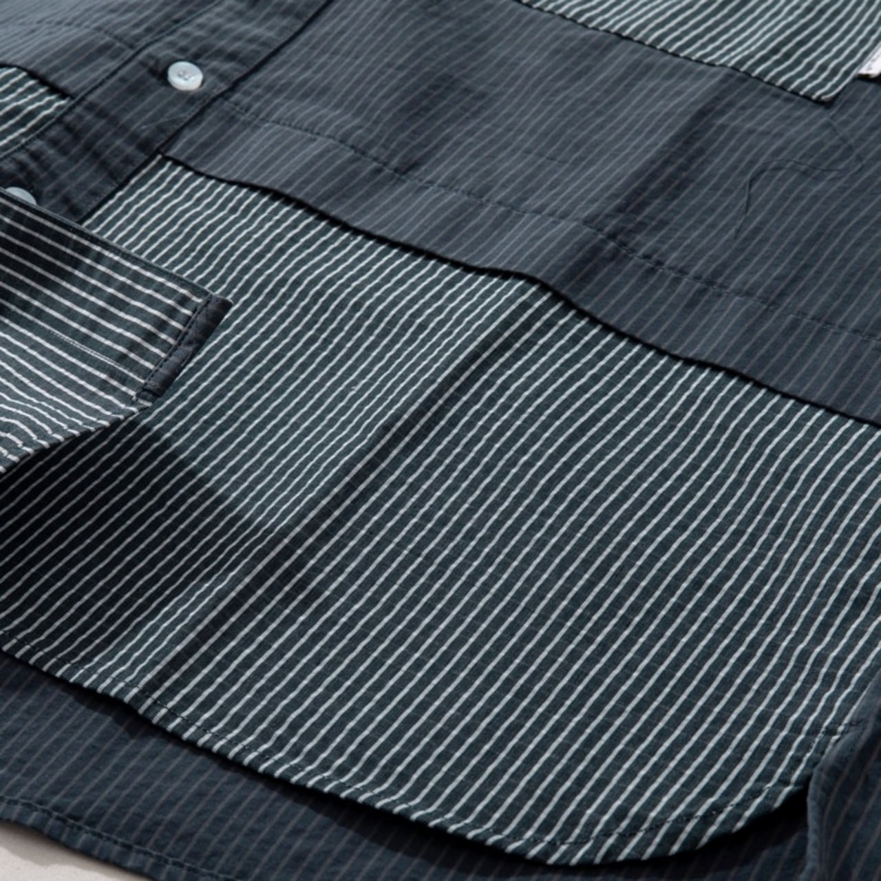 異なるピッチのストライプ生地をアートのように切り替えた、夏の海辺に映えるクレイジーパターンの長袖シャツ。
