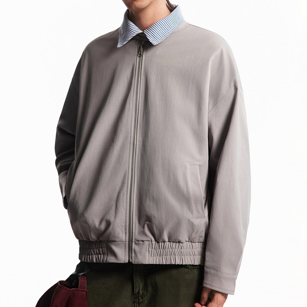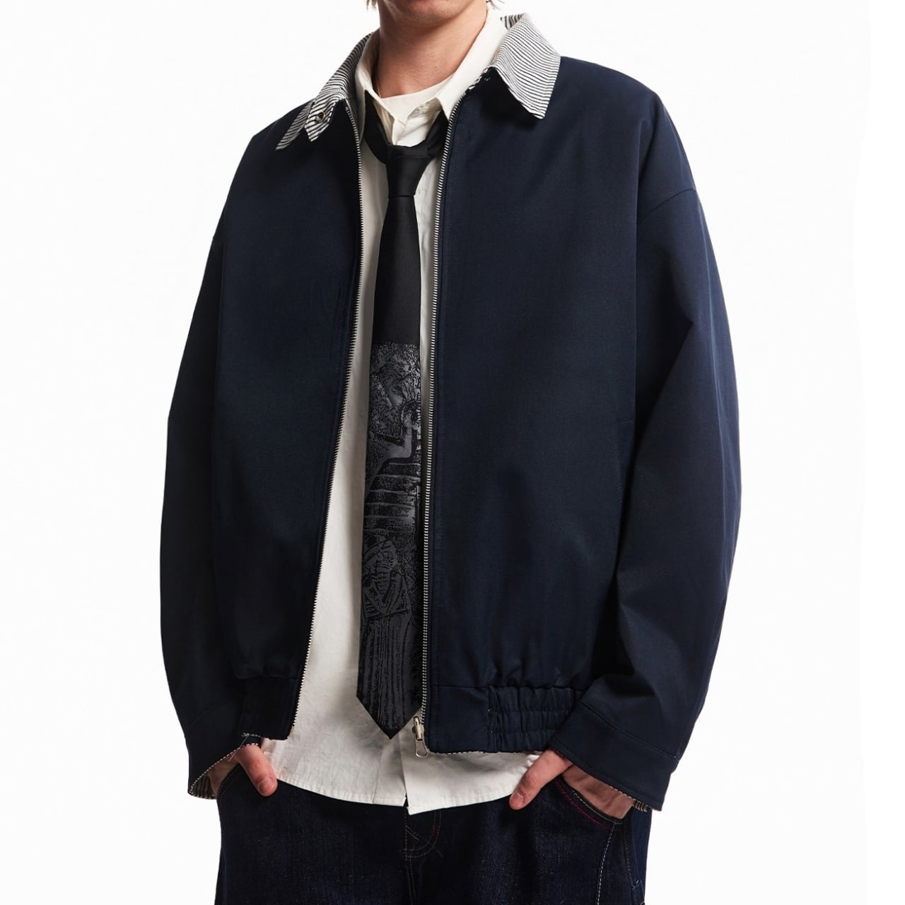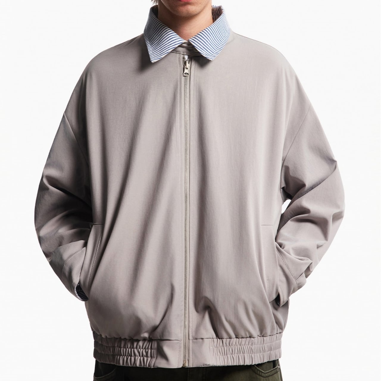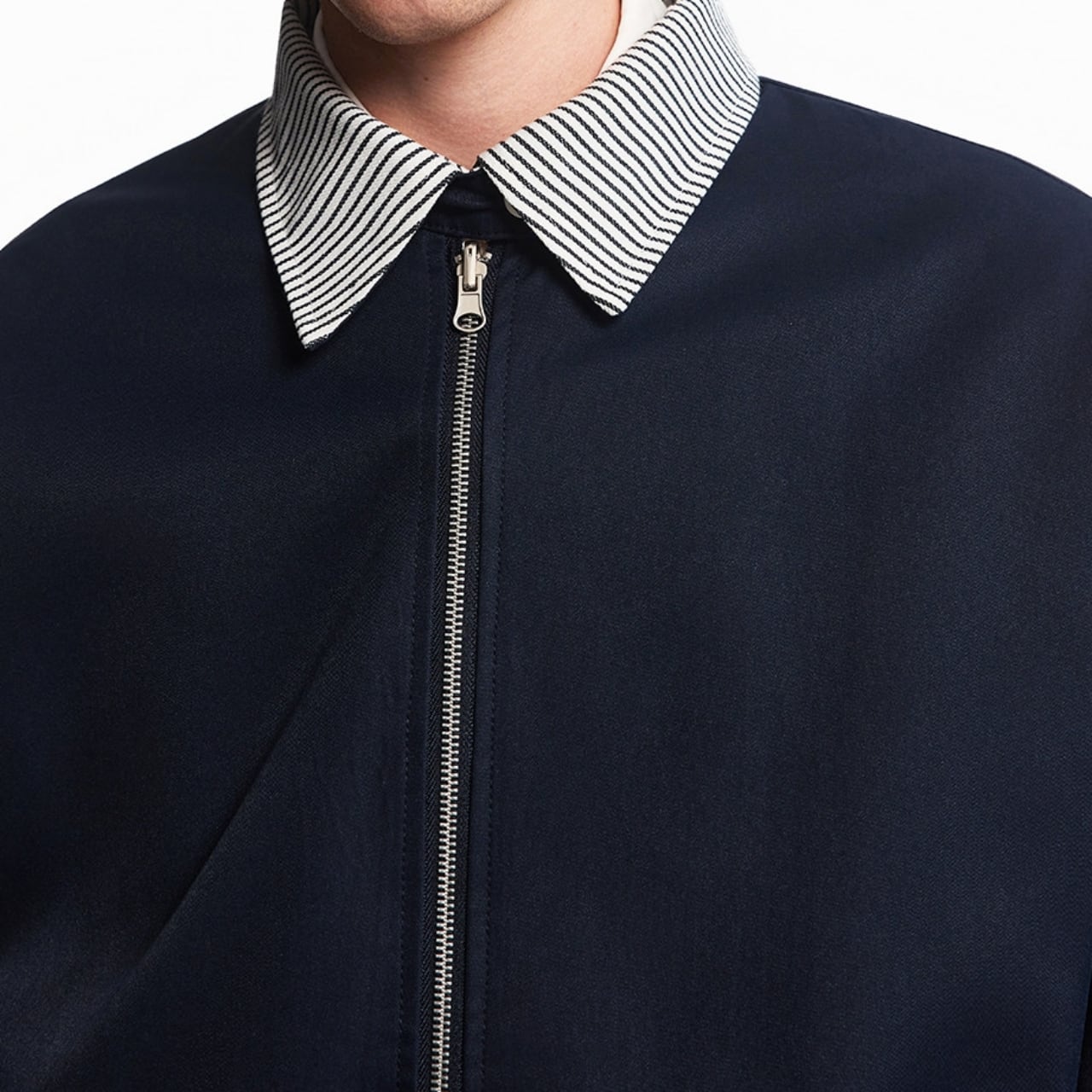 裏地にアクセントカラーのストライプ柄を配した、襟付きのシルエットが特徴です。