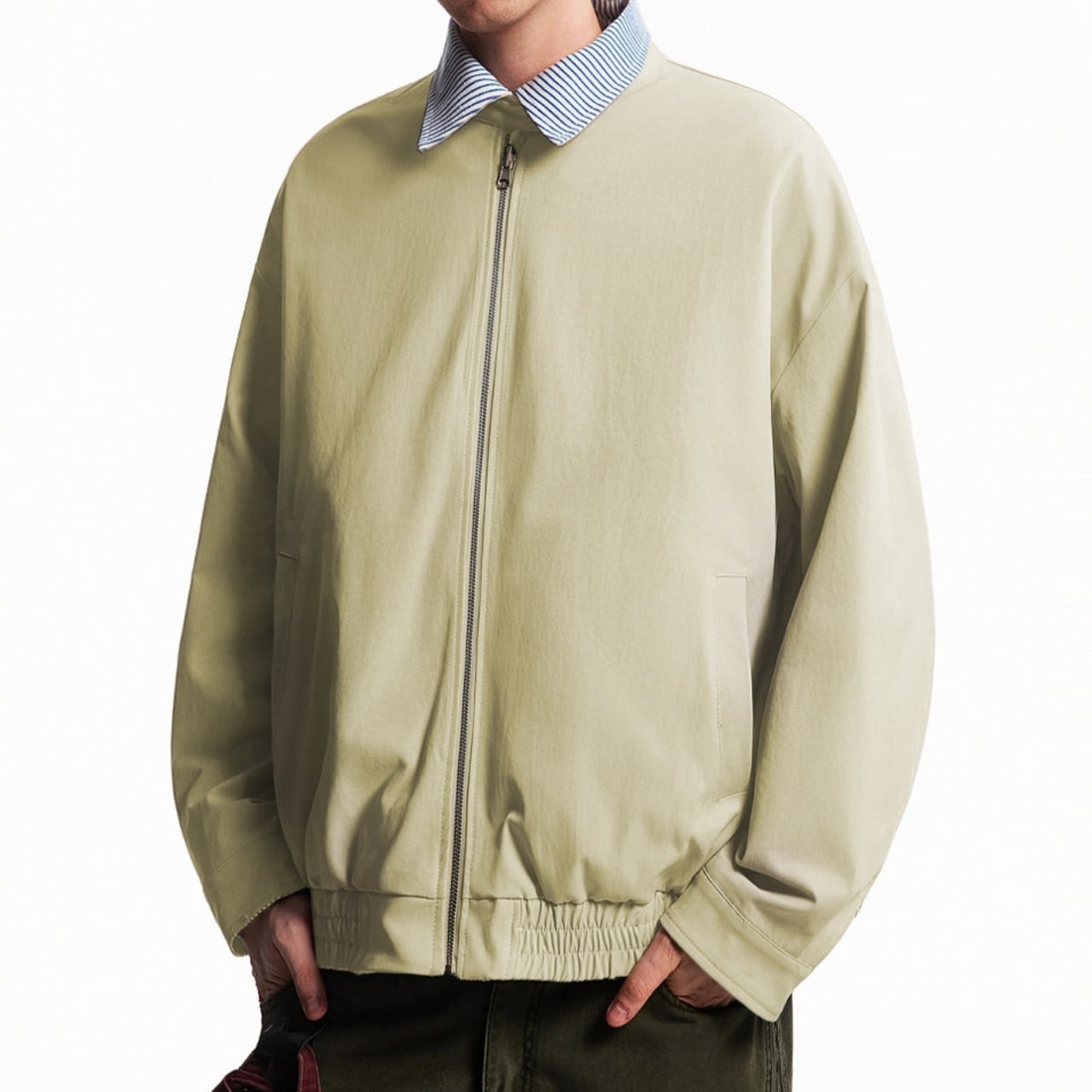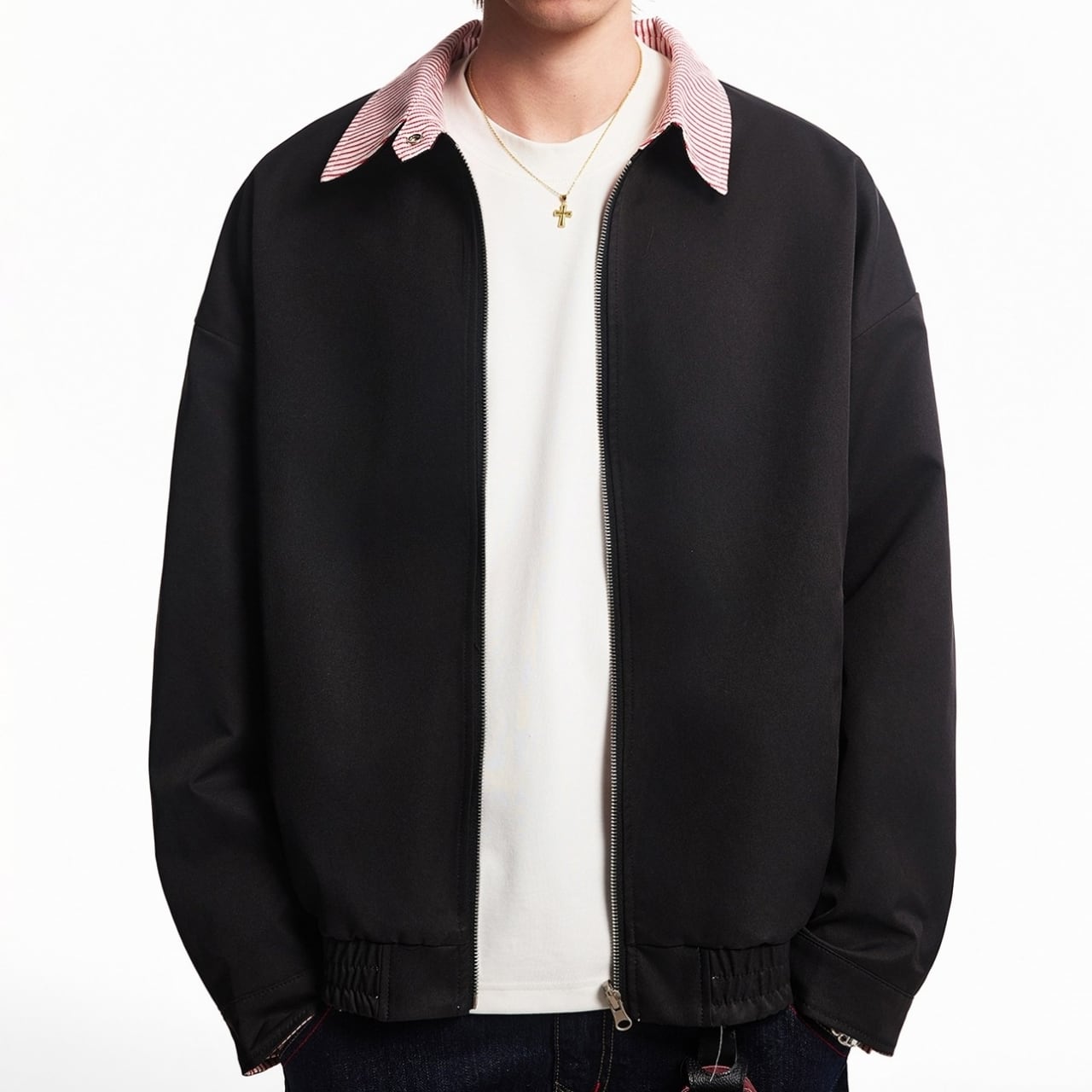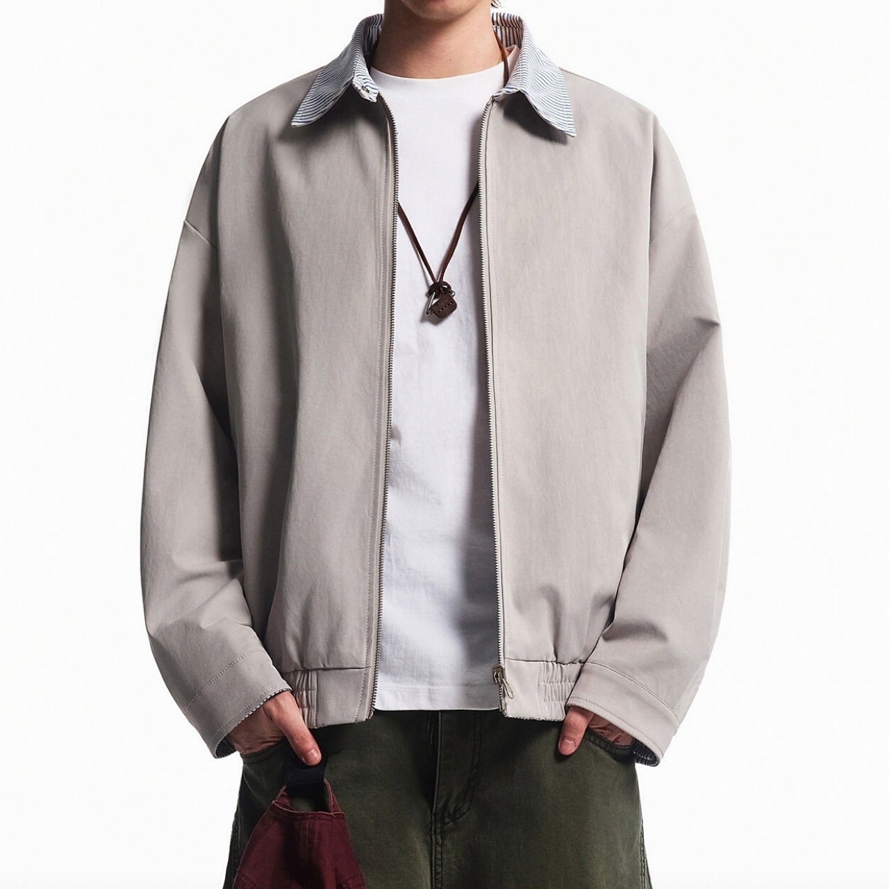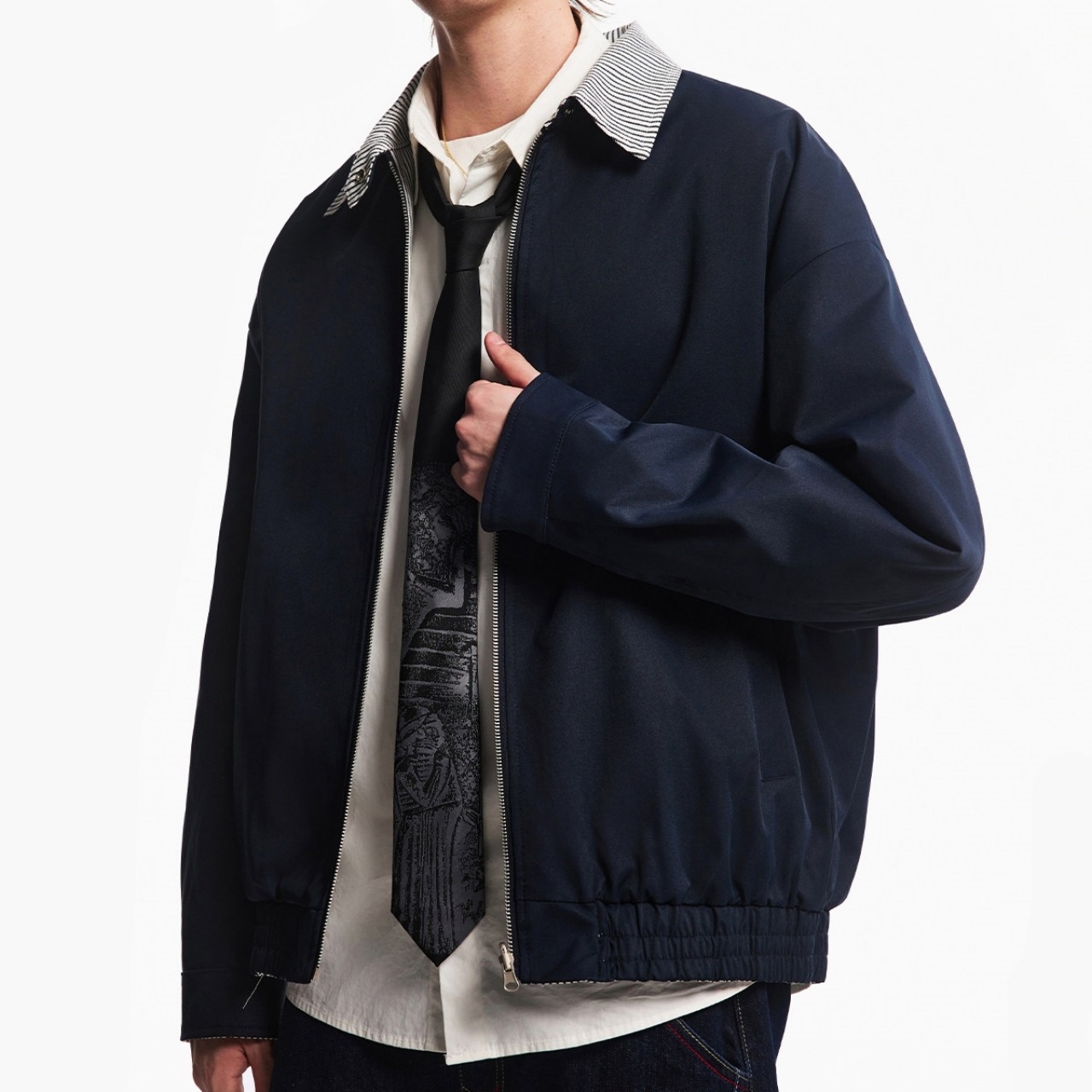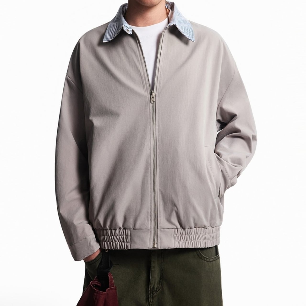 裏地にアクセントカラーのストライプ柄を配した、襟付きのシルエットが特徴です。