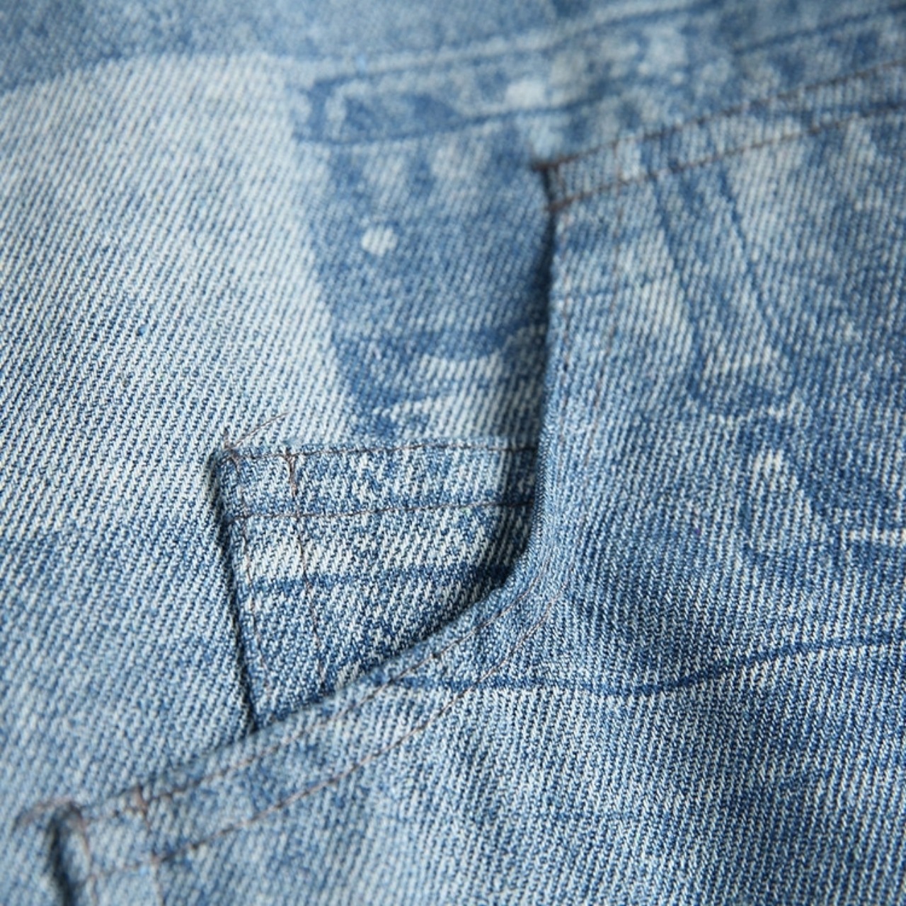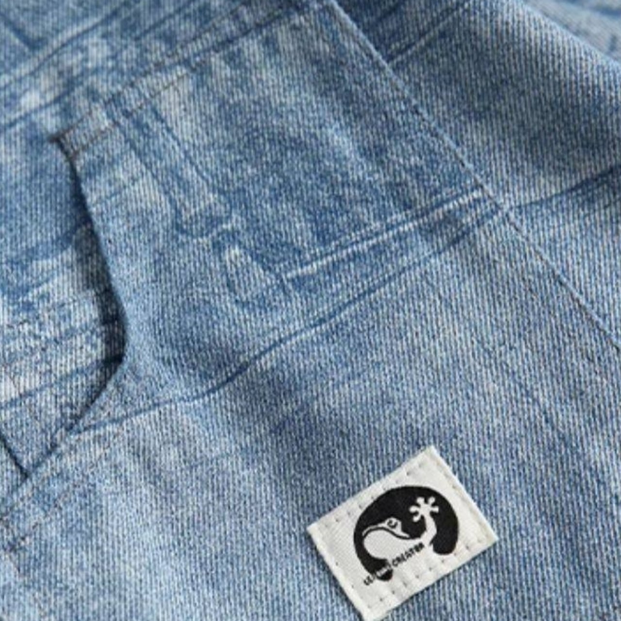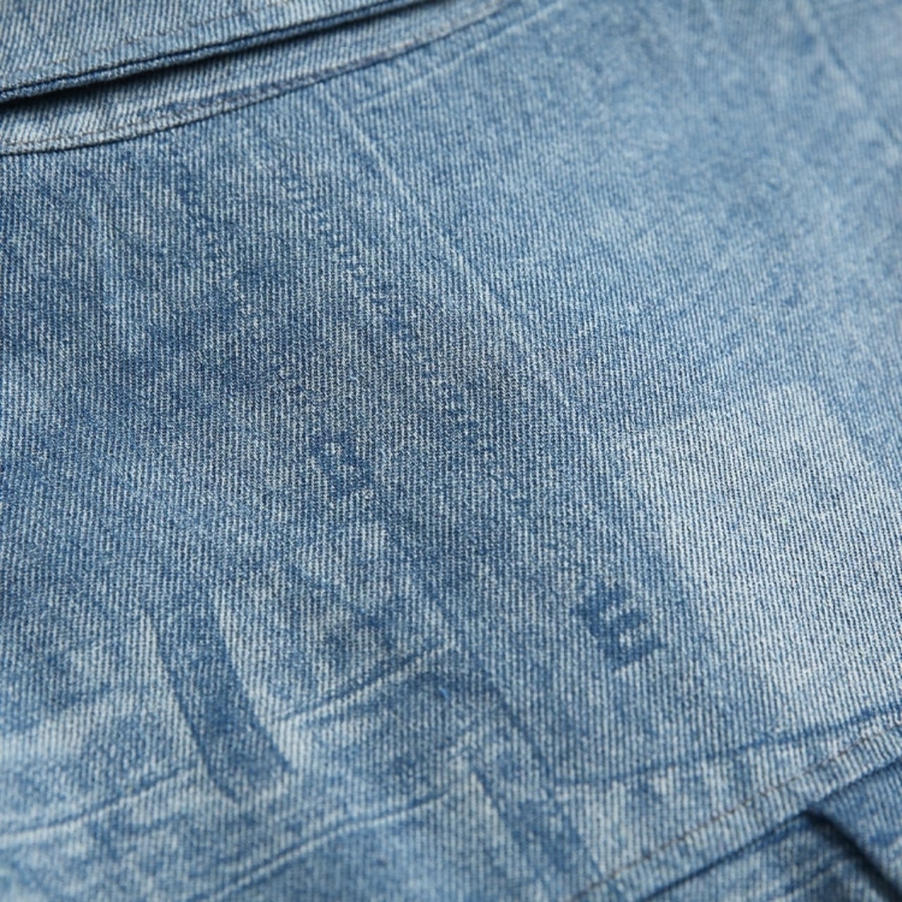 デニムパンツのディテールを転写したようなパッチワーク風の総柄プリントが特徴です。
