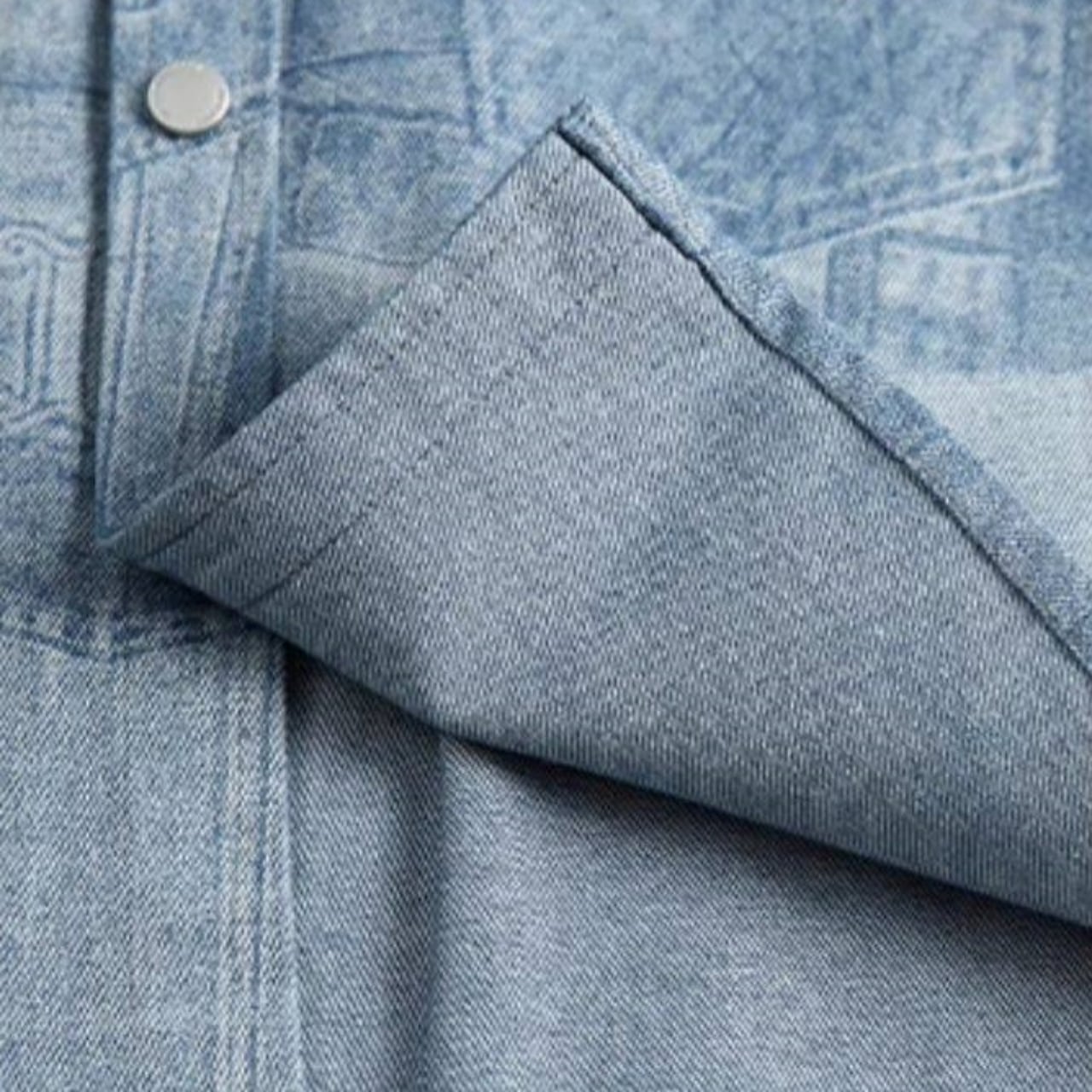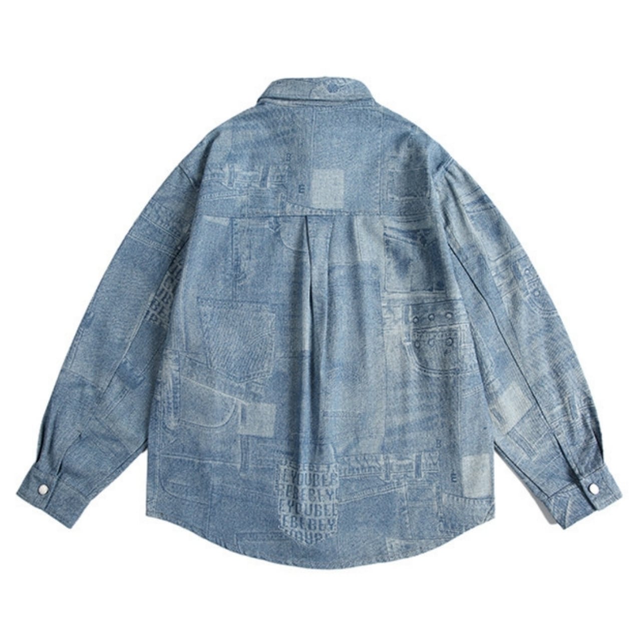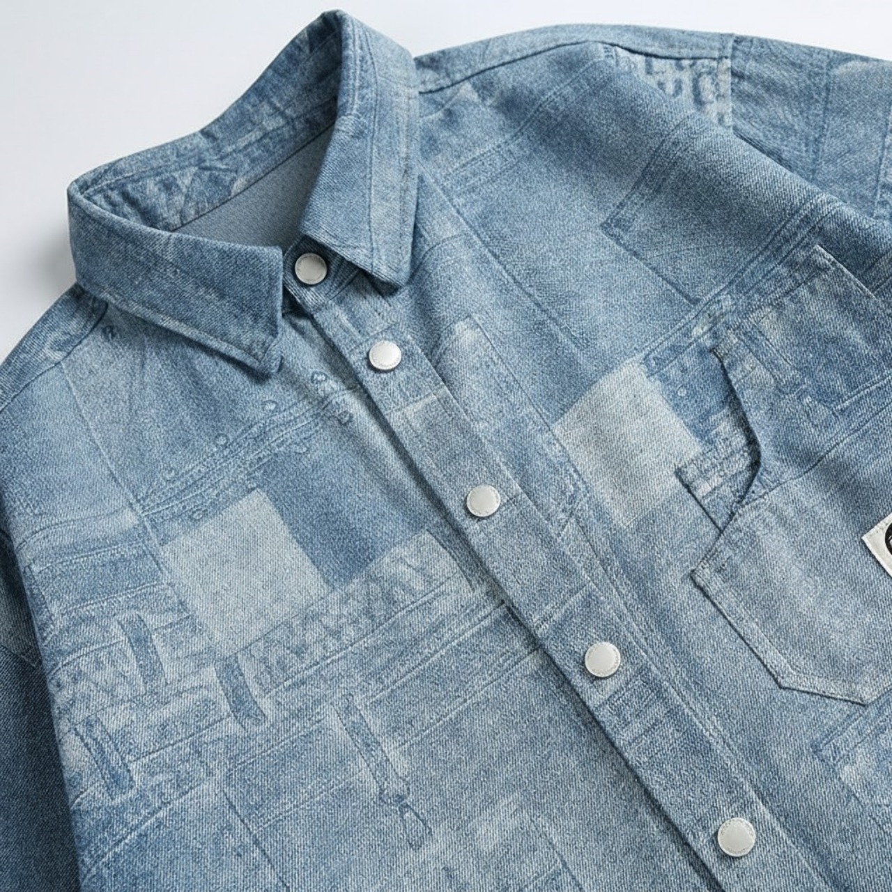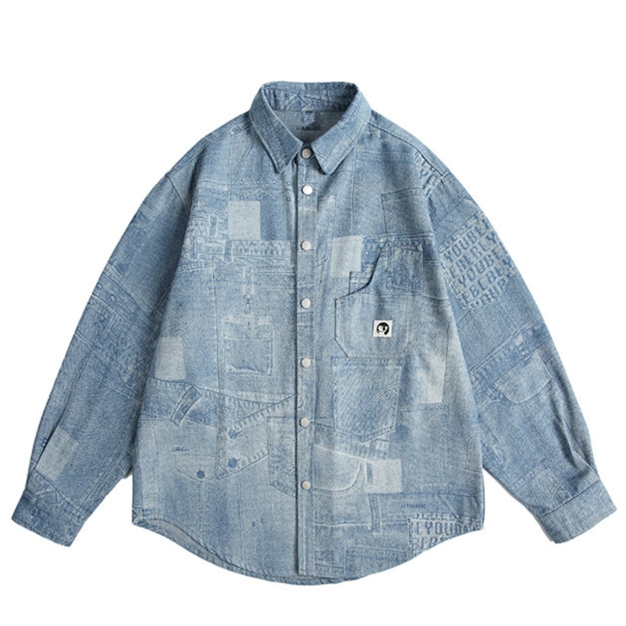 デニムパンツのディテールを転写したようなパッチワーク風の総柄プリントが特徴です。