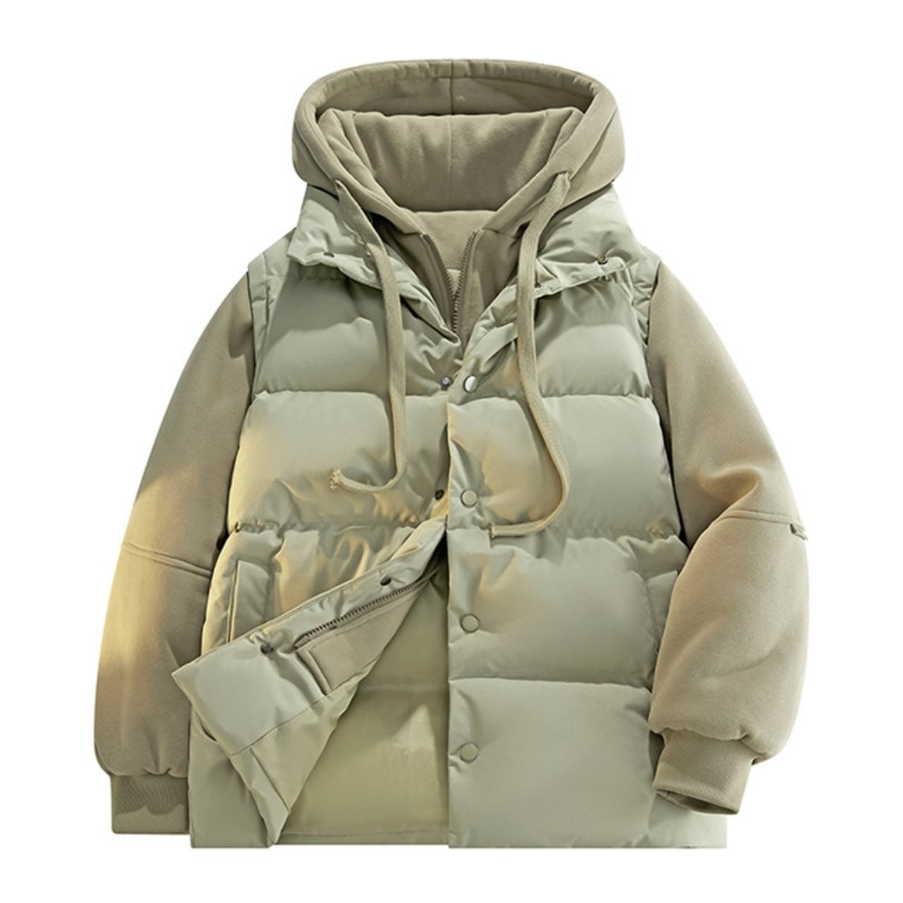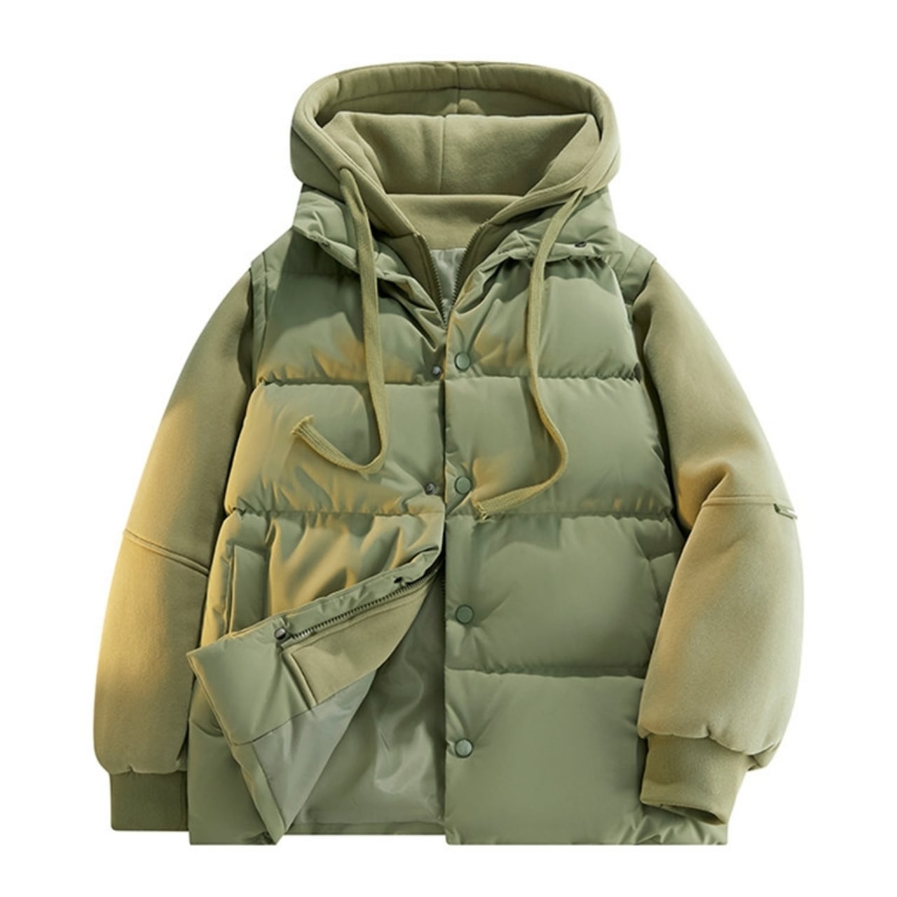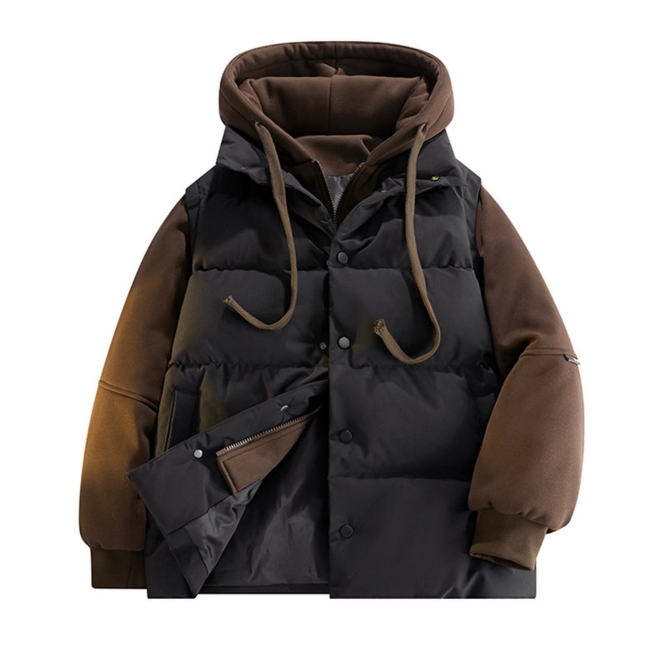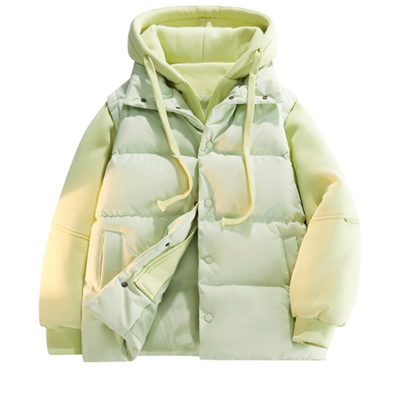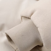 ボディ部分の切り替えとフードが一体となった、レイヤード風のデザインです。