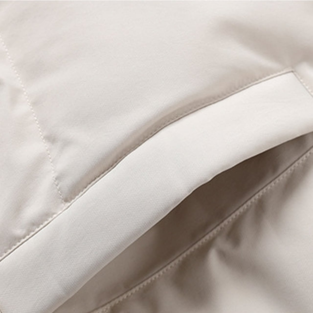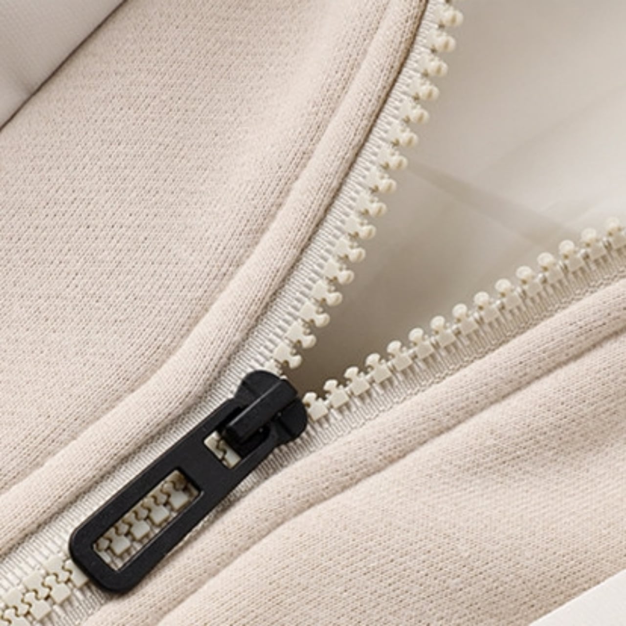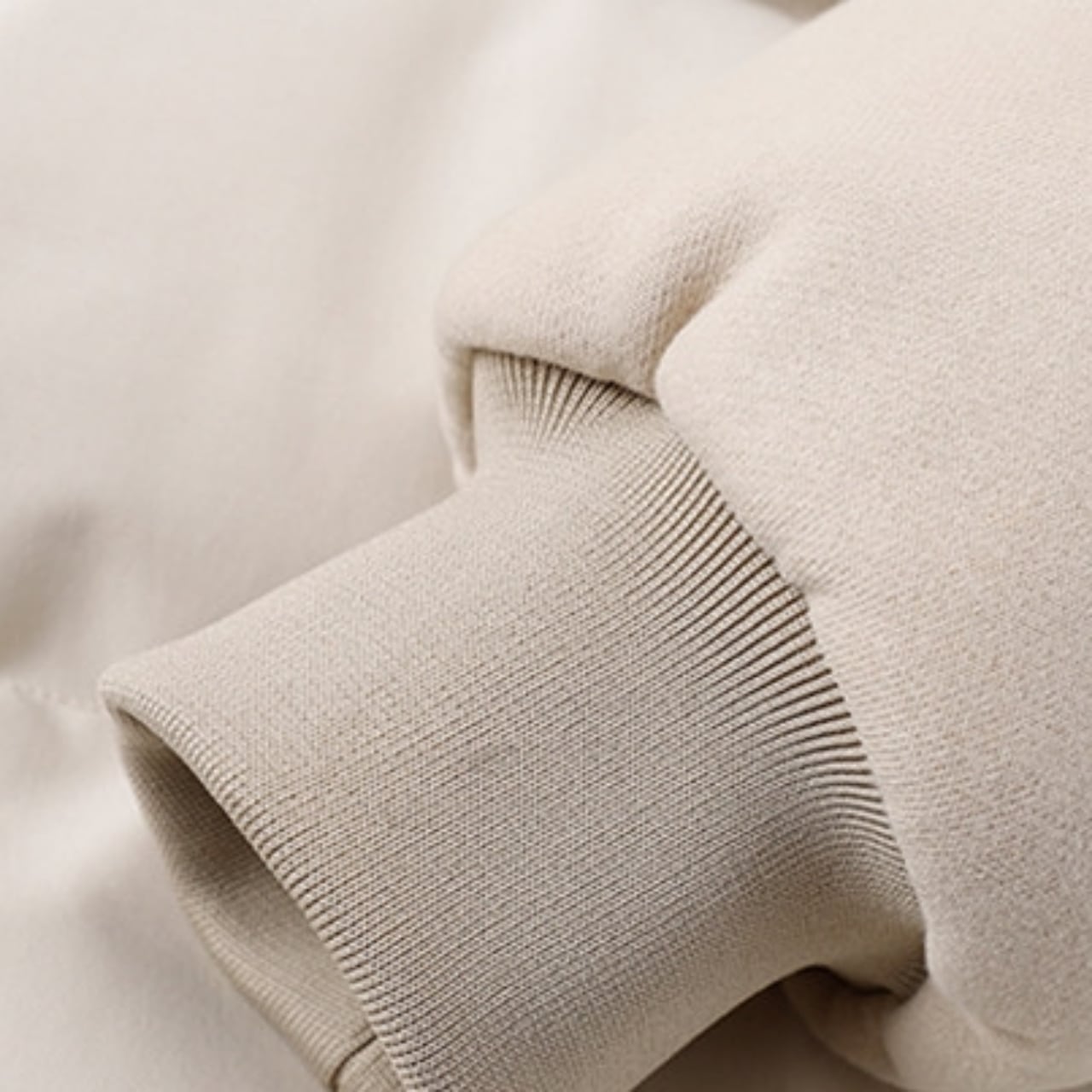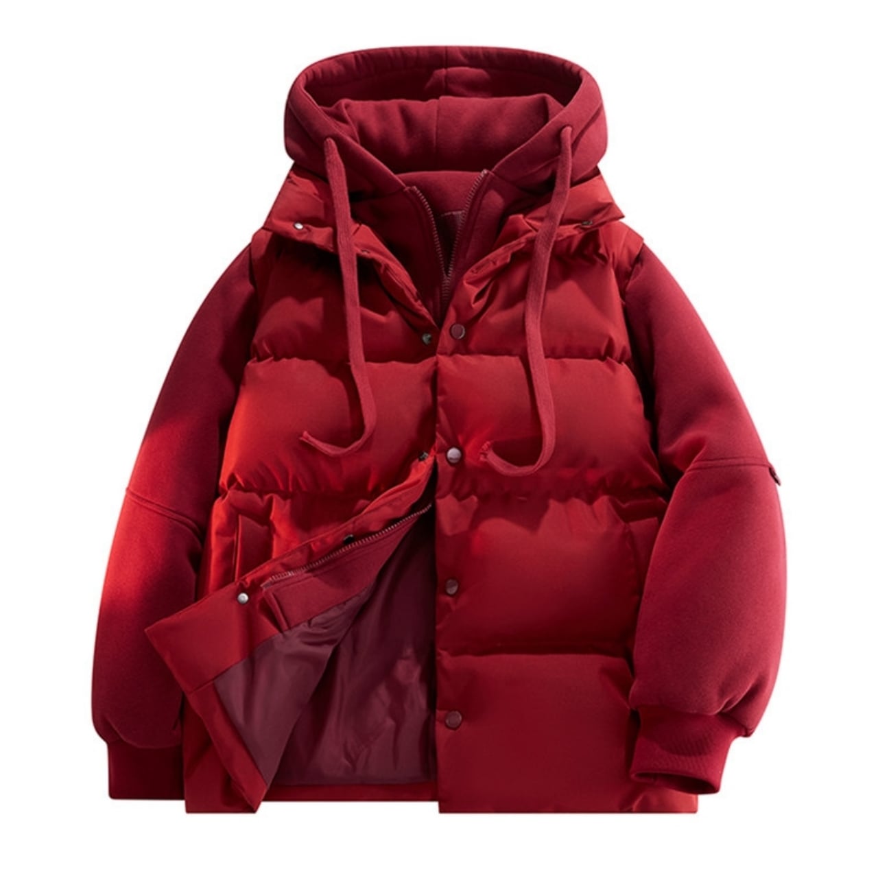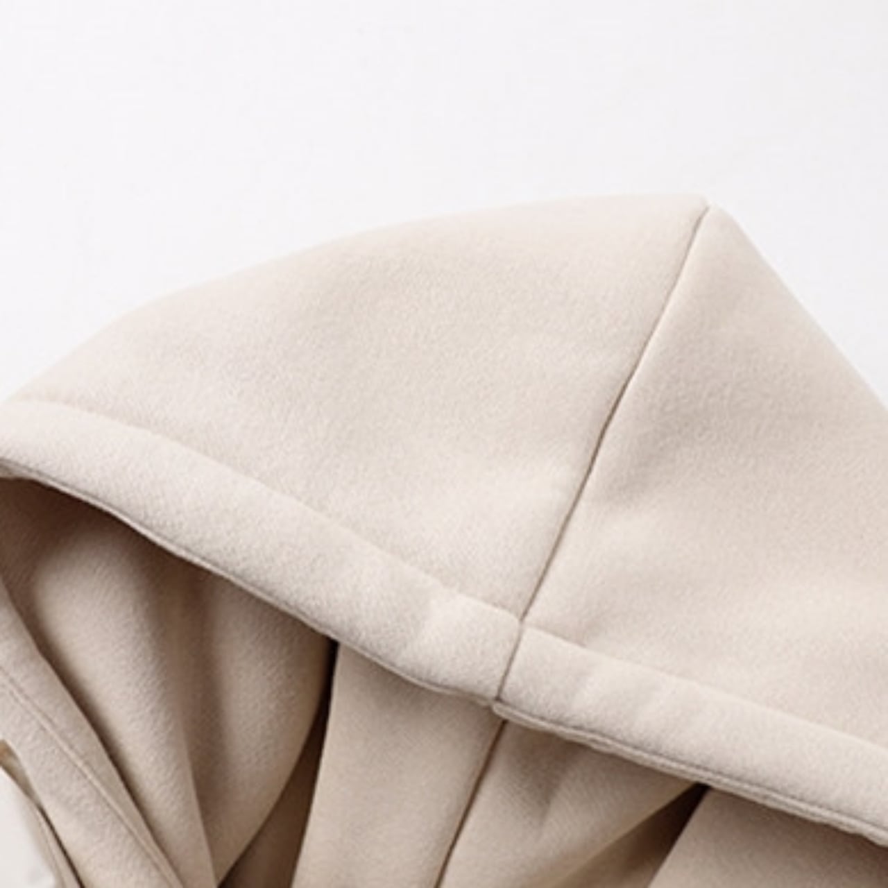 ボディ部分の切り替えとフードが一体となった、レイヤード風のデザインです。