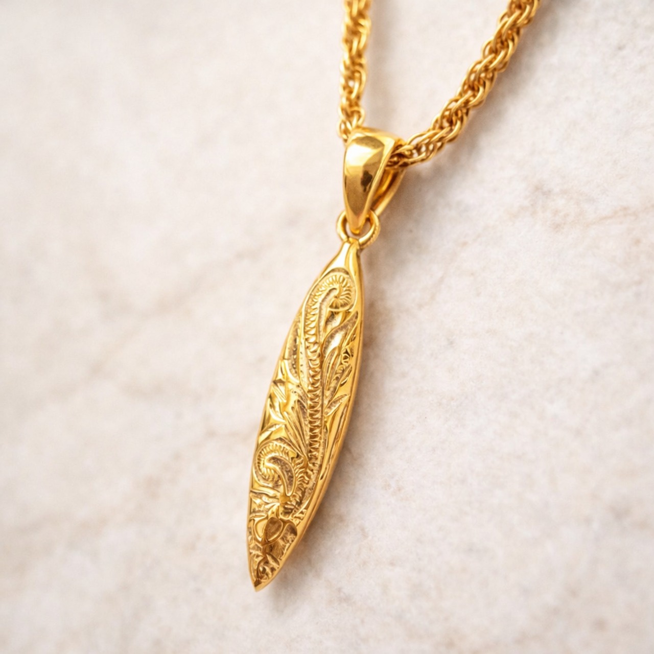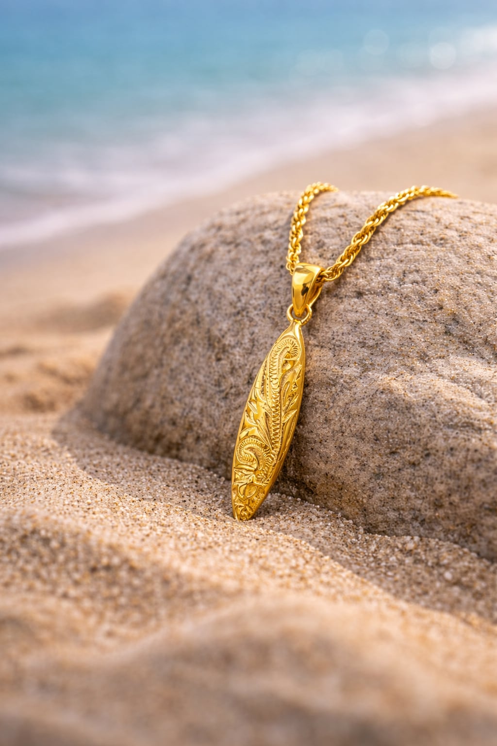サーフボードをモチーフに、全体には波と成長を象徴するスクロール模様を繊細に刻んだデザイン。