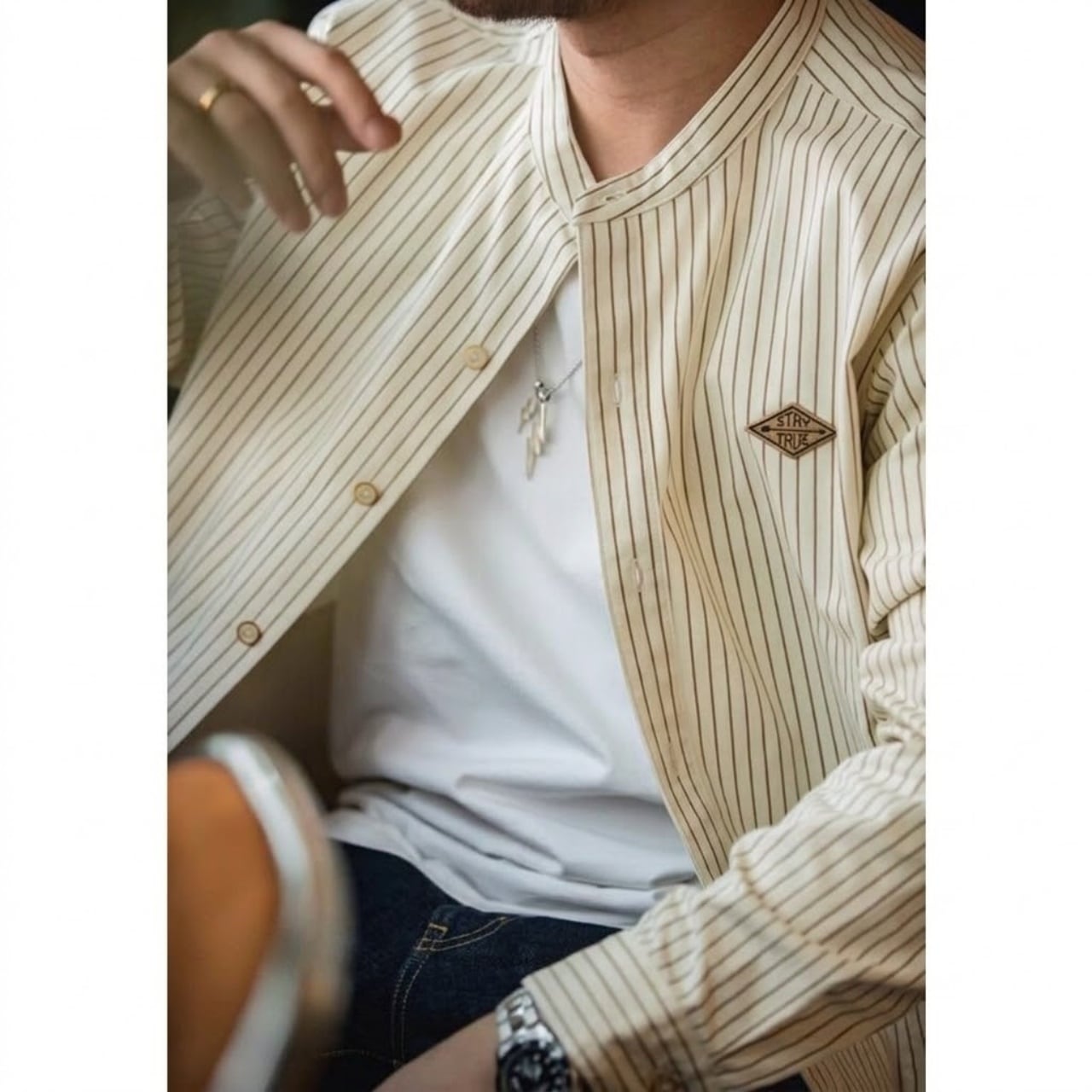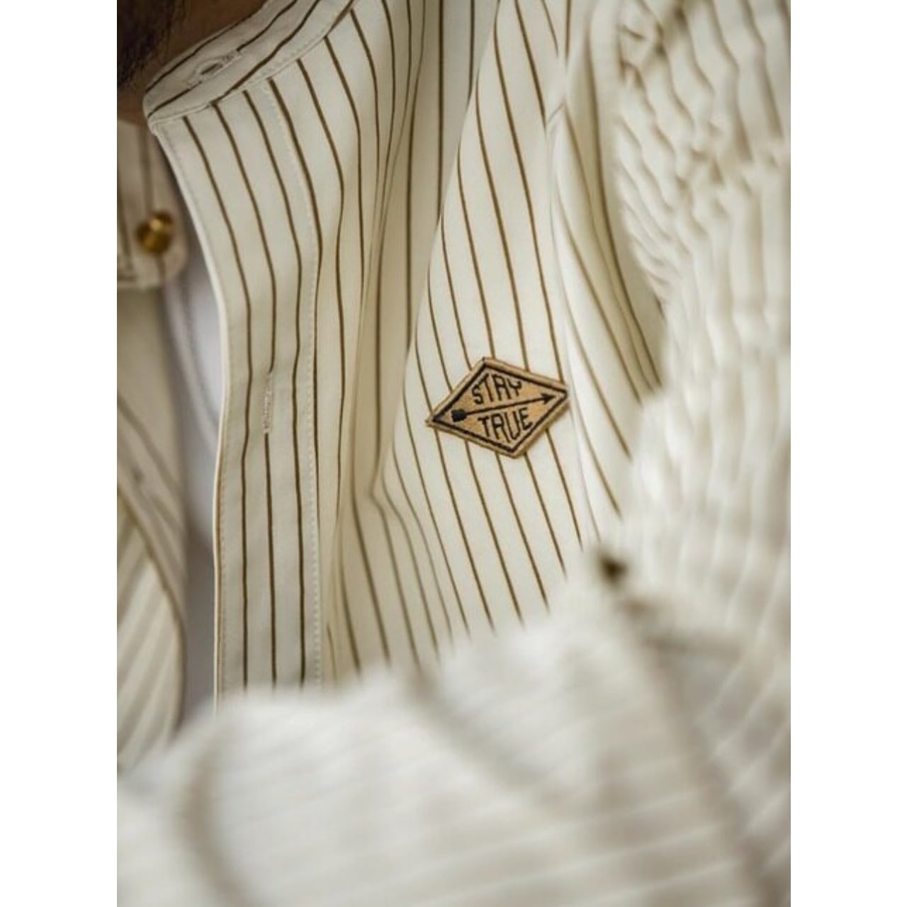 特徴的な立ち襟と胸元の小さなワッペンが、いつものコーディネートに程よいアクセントを加えてくれます。