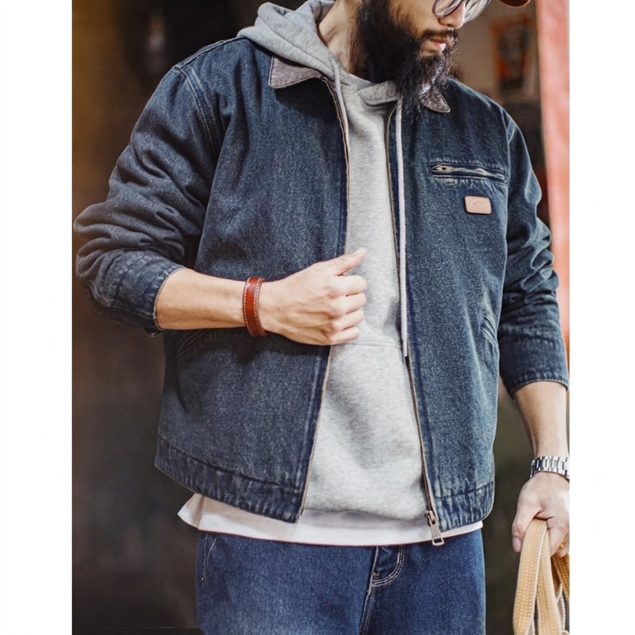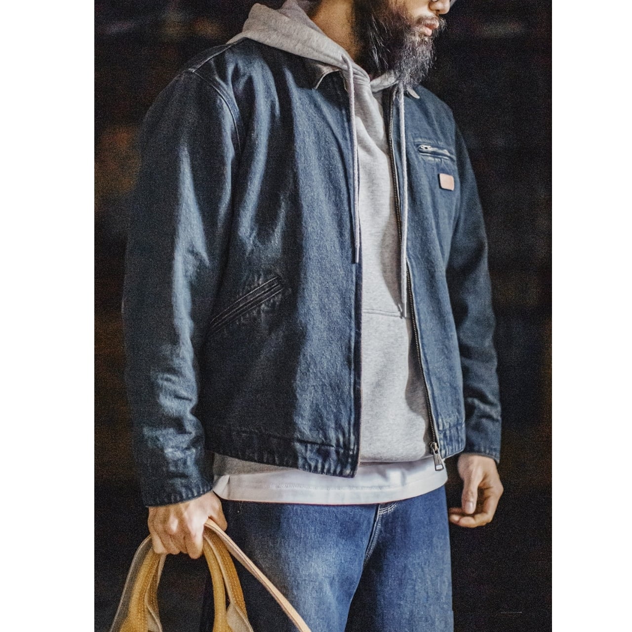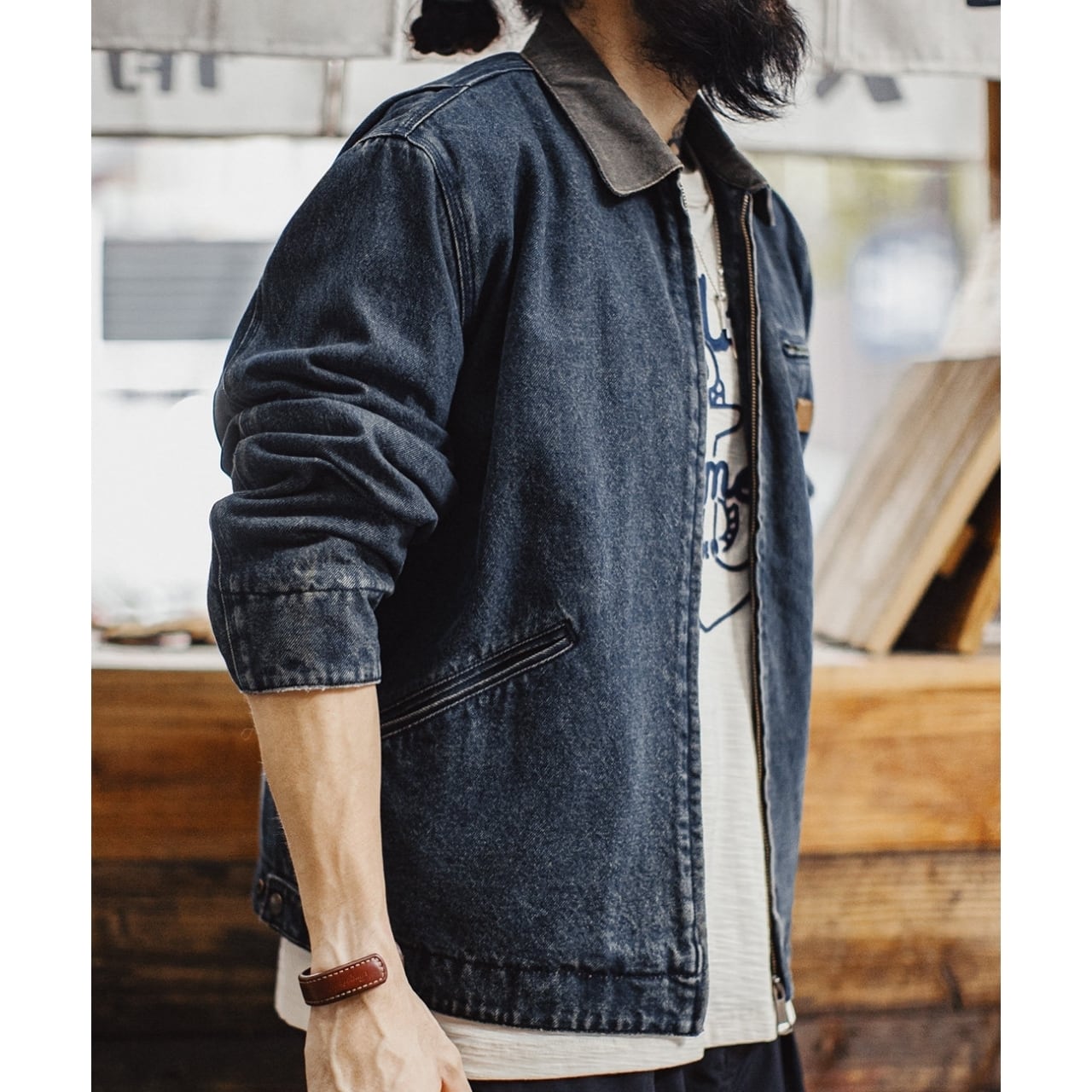 襟の切り替えデザインが目を引く、ジップアップタイプのジャケットです。