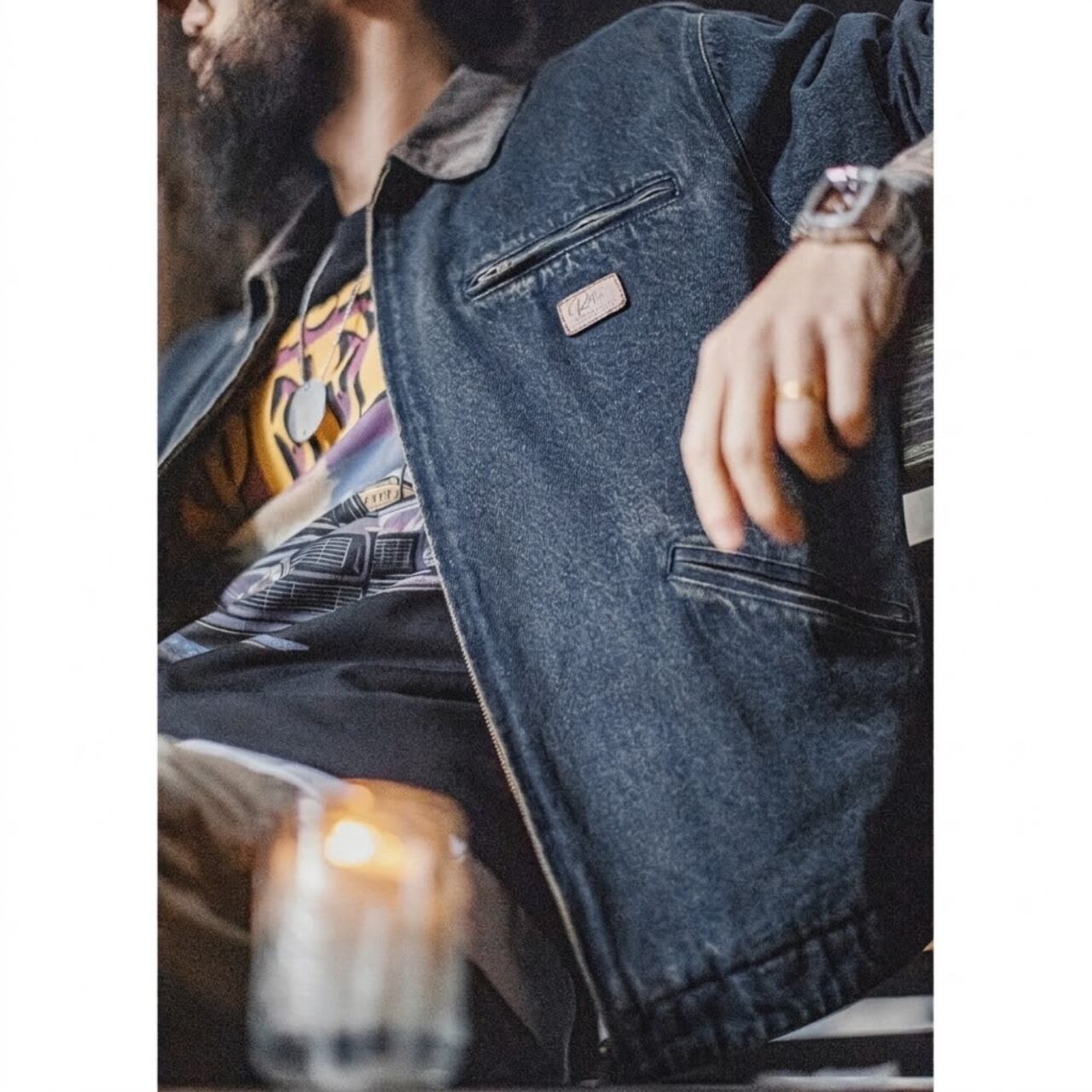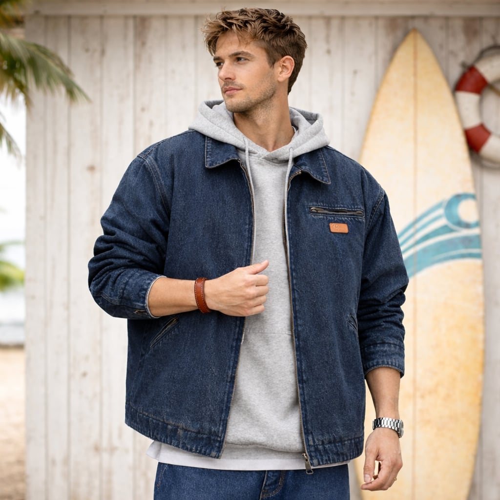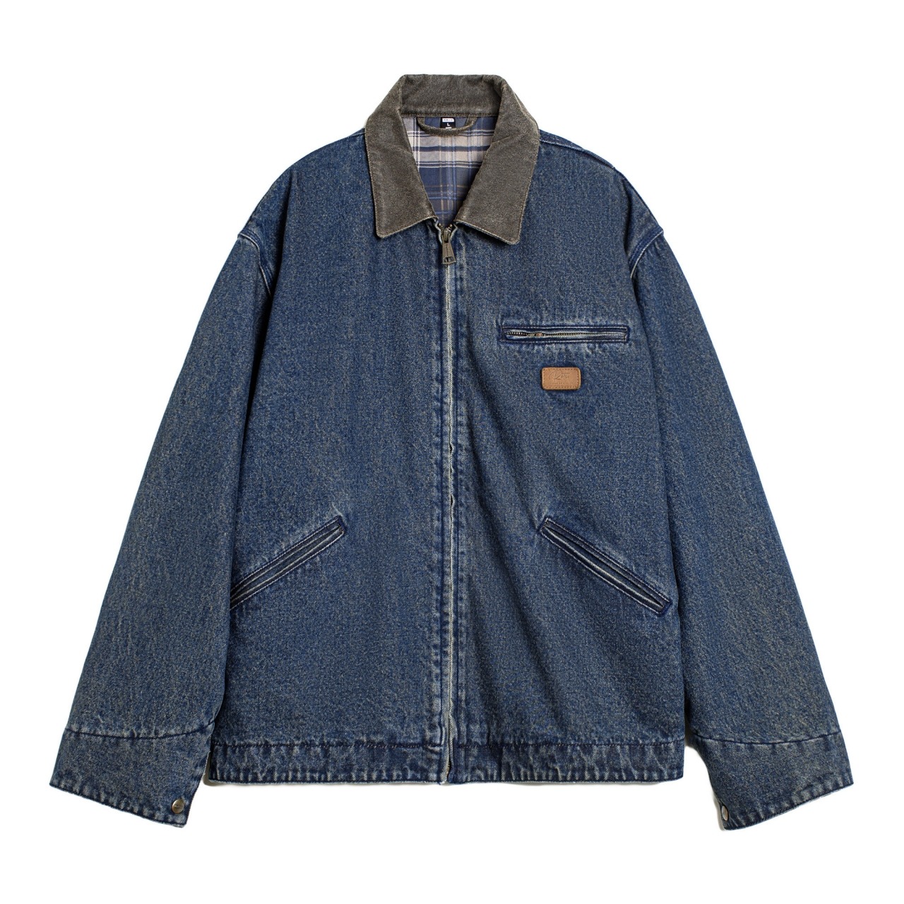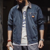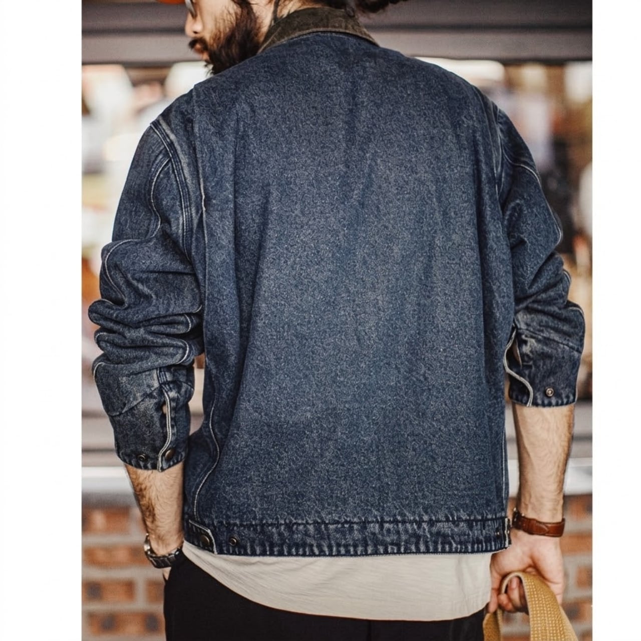 襟の切り替えデザインが目を引く、ジップアップタイプのジャケットです。