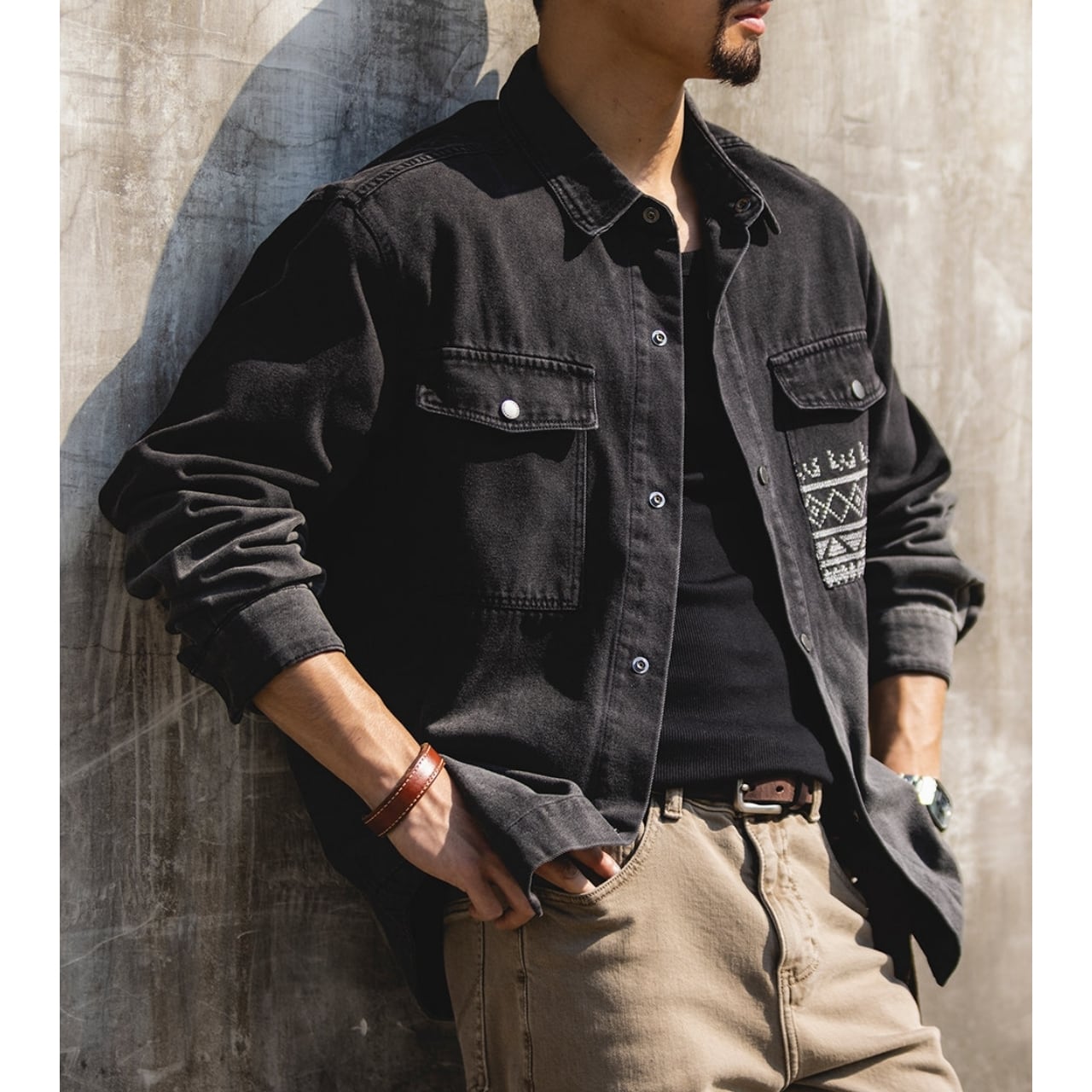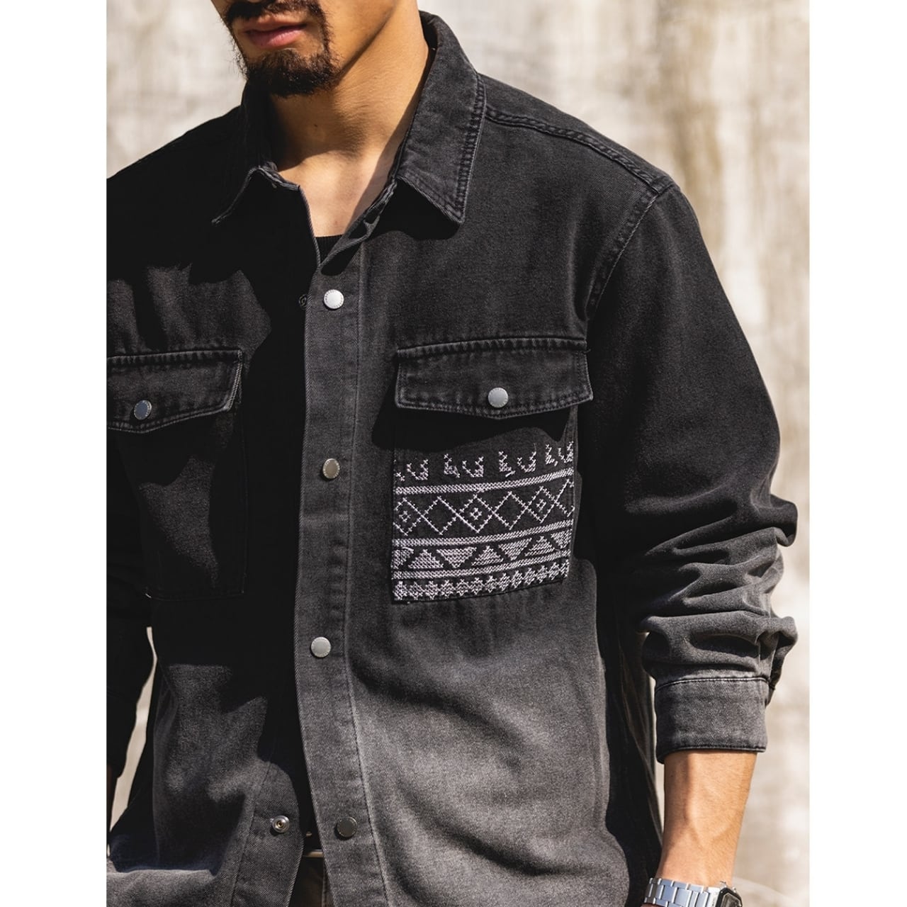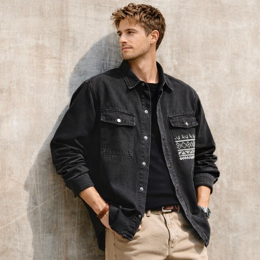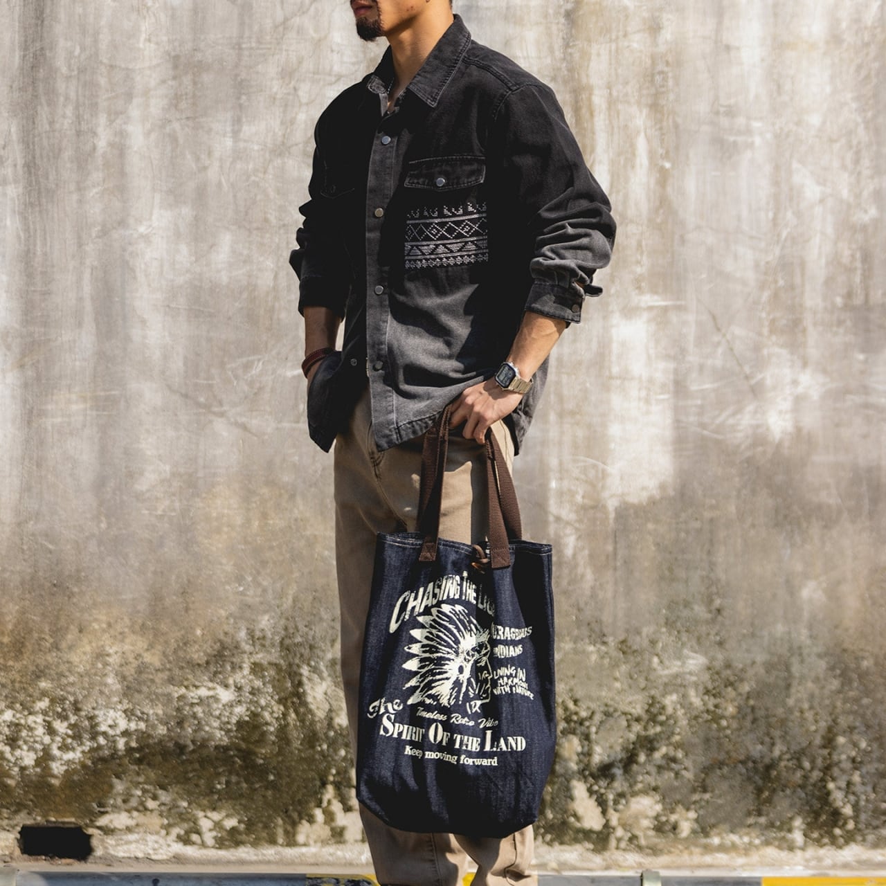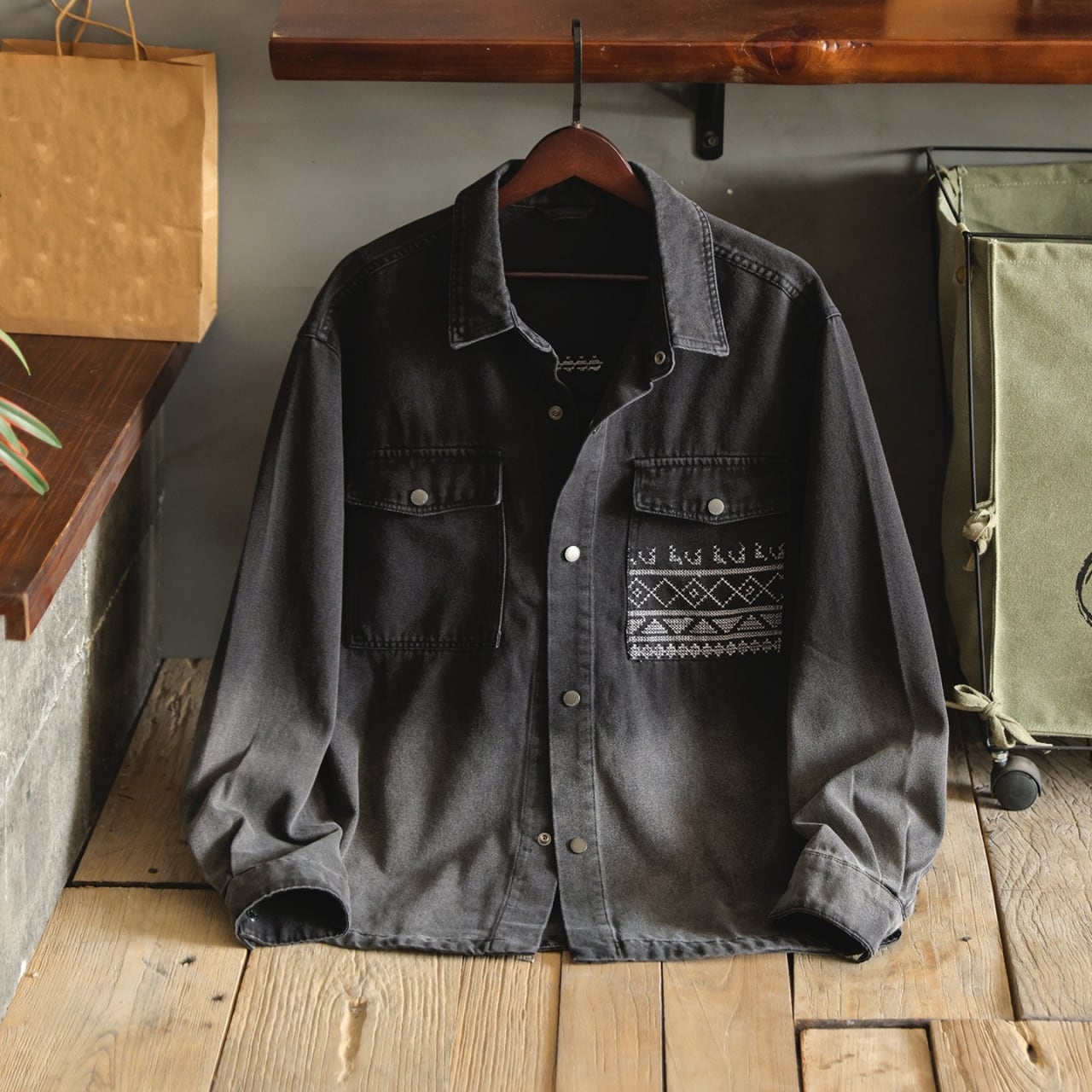 胸元のネイティブ柄ポケットが目を引く、ゆったりとしたシルエットのデニムジャケット。落ち着いた色落ち加工が、日々のコーディネートに自然なこなれ感をプラスします。