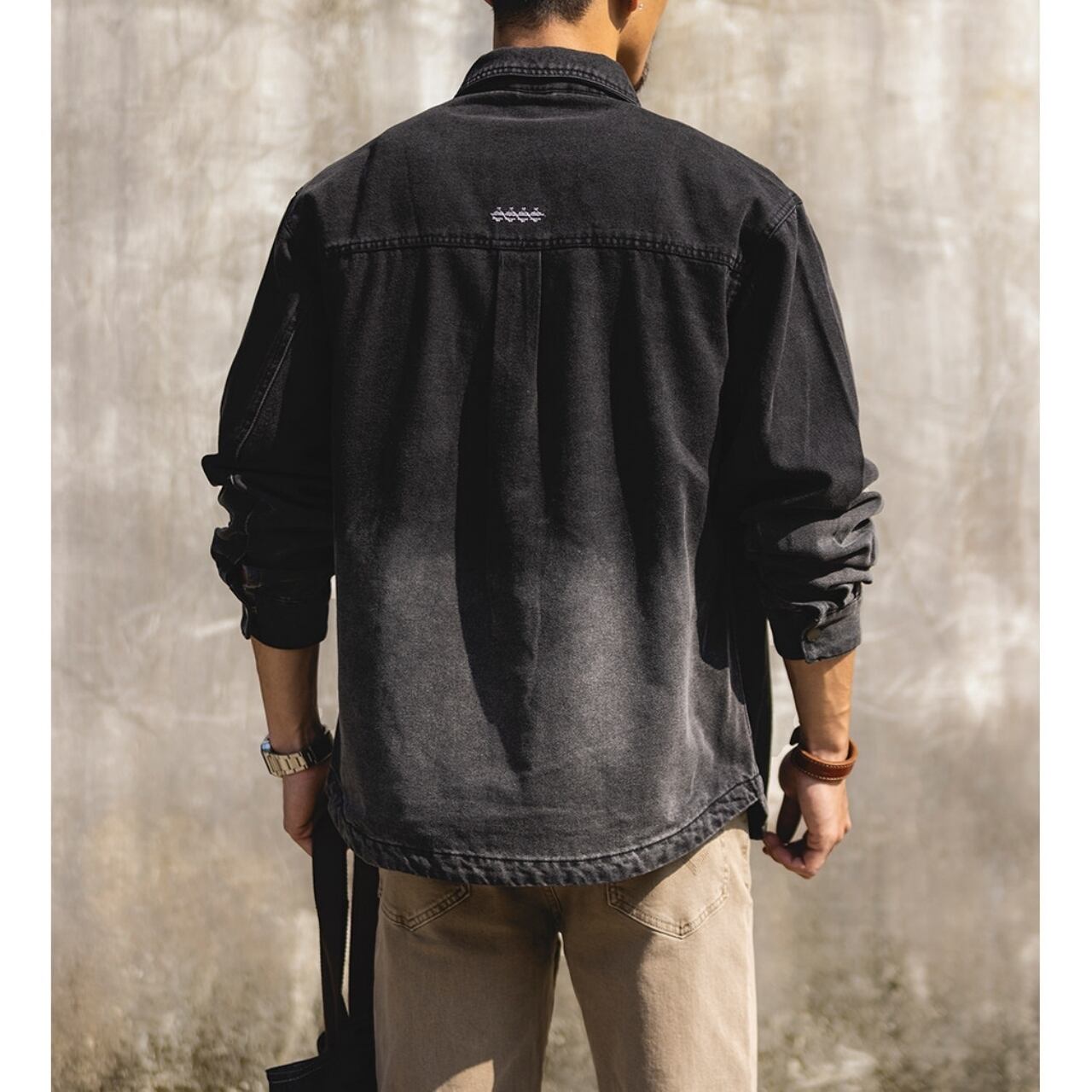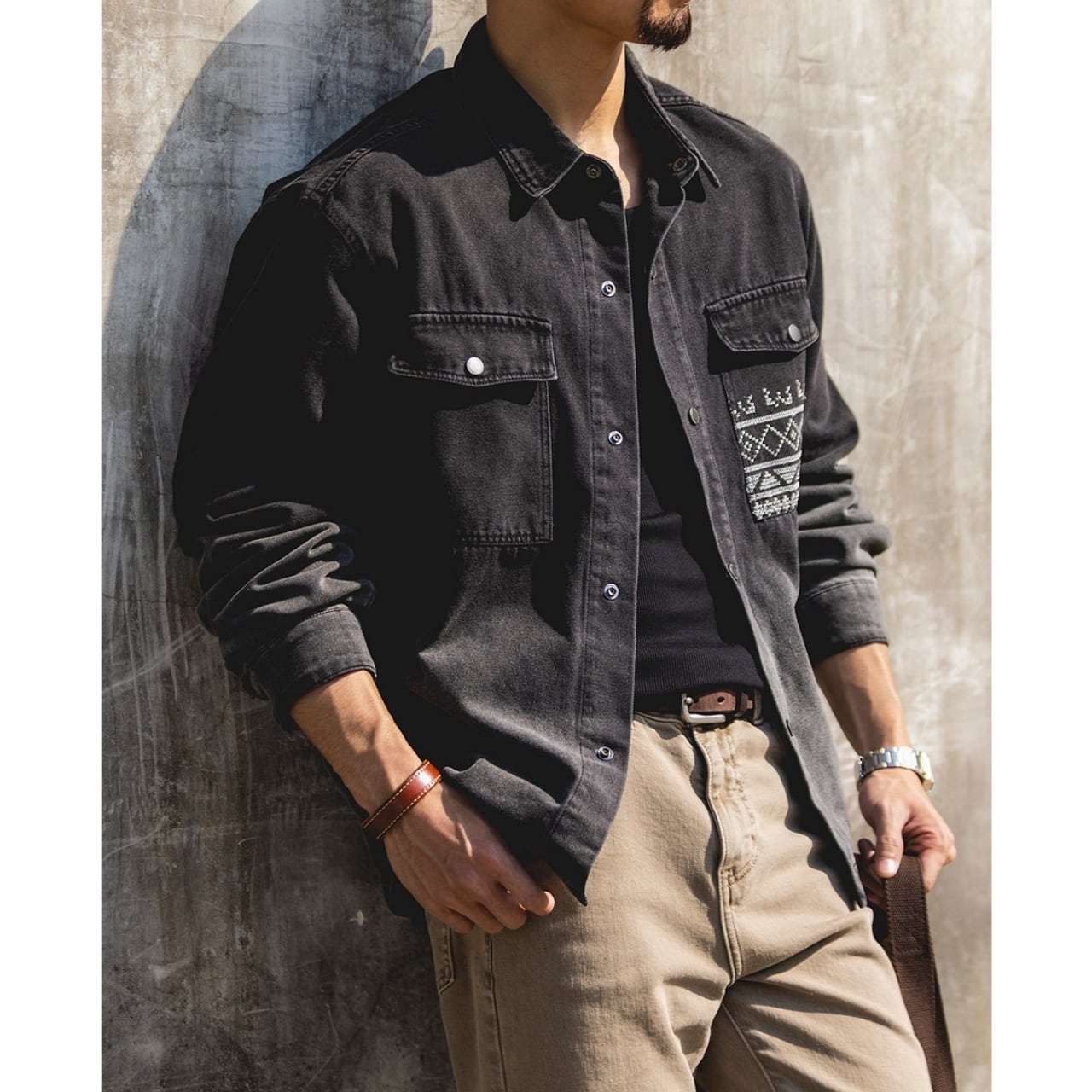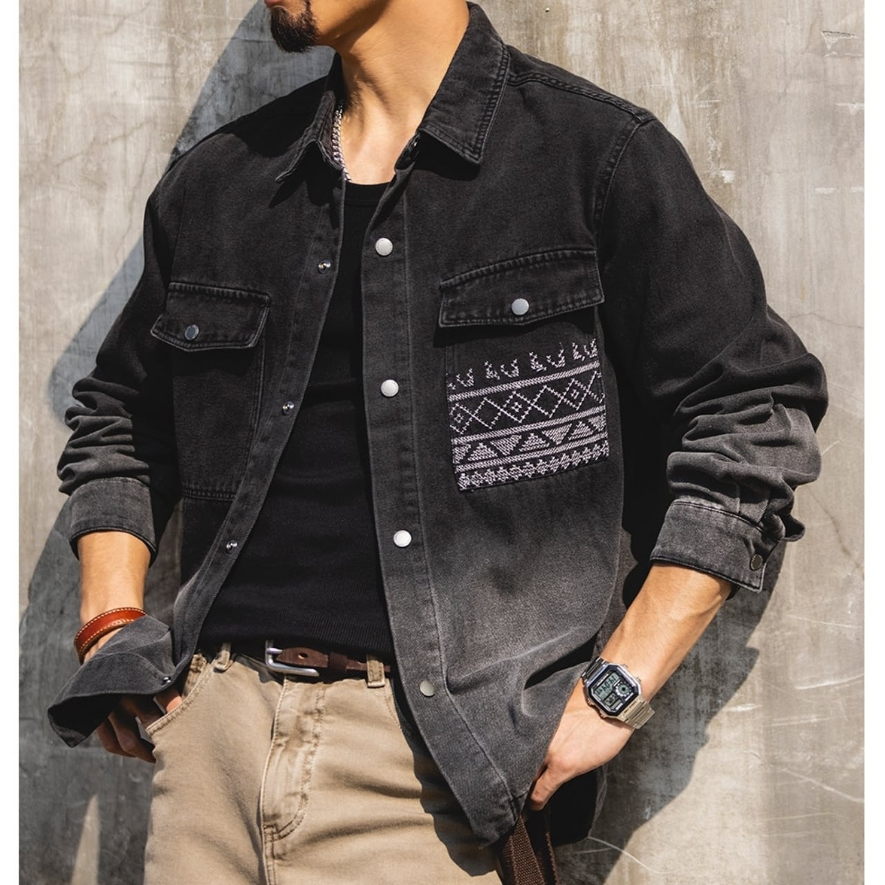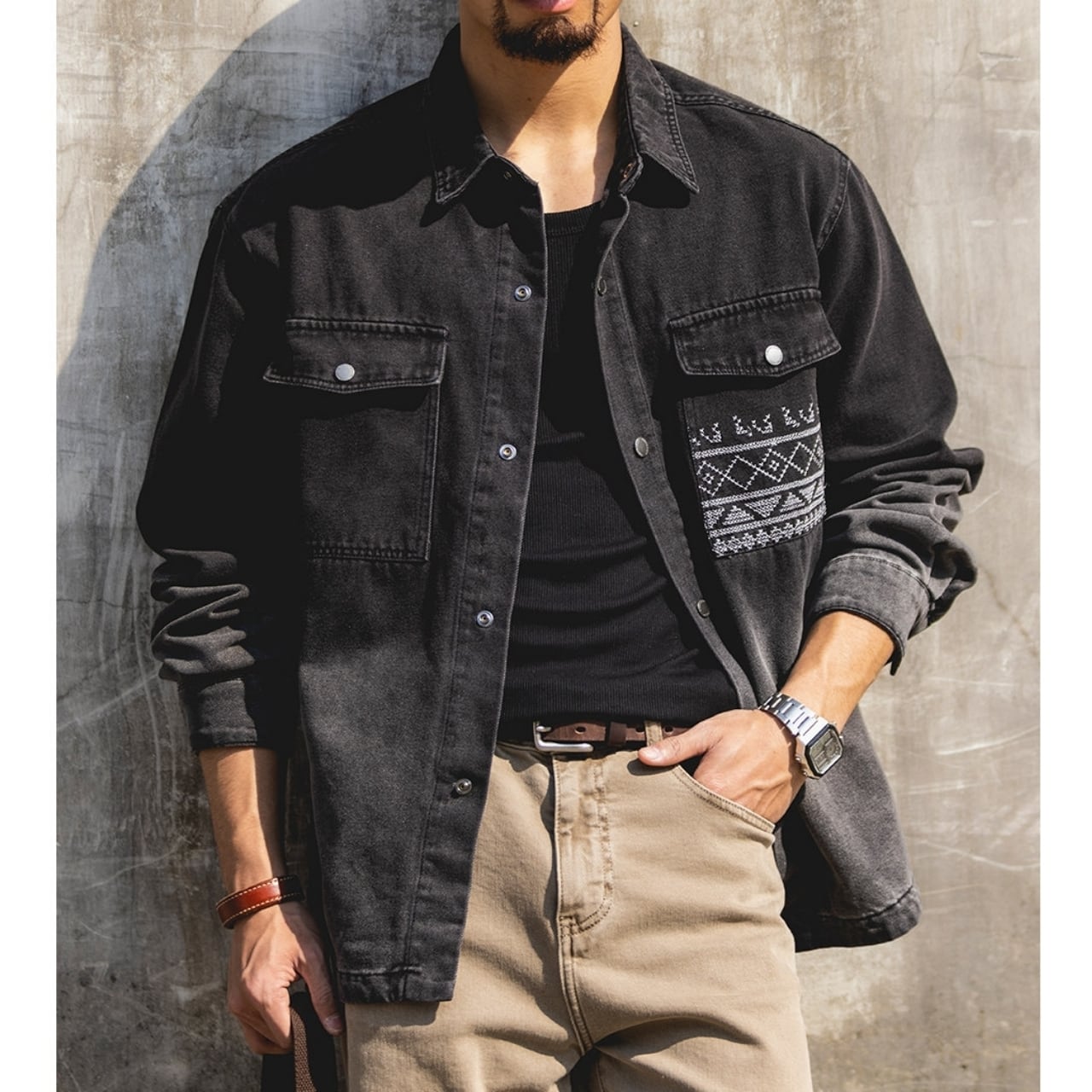 胸元のネイティブ柄ポケットが目を引く、ゆったりとしたシルエットのデニムジャケット。落ち着いた色落ち加工が、日々のコーディネートに自然なこなれ感をプラスします。