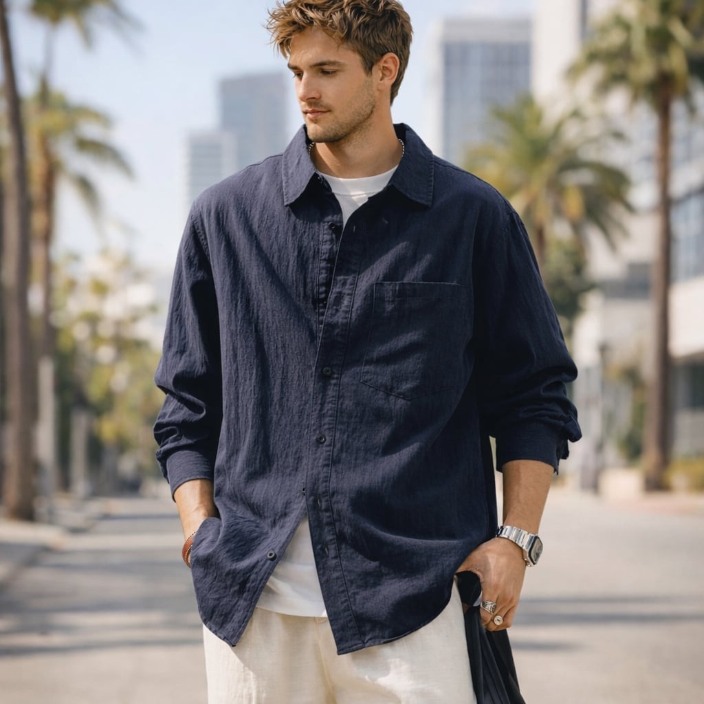 ゆったりとしたシルエットで、リラックスした雰囲気を演出する一枚です。