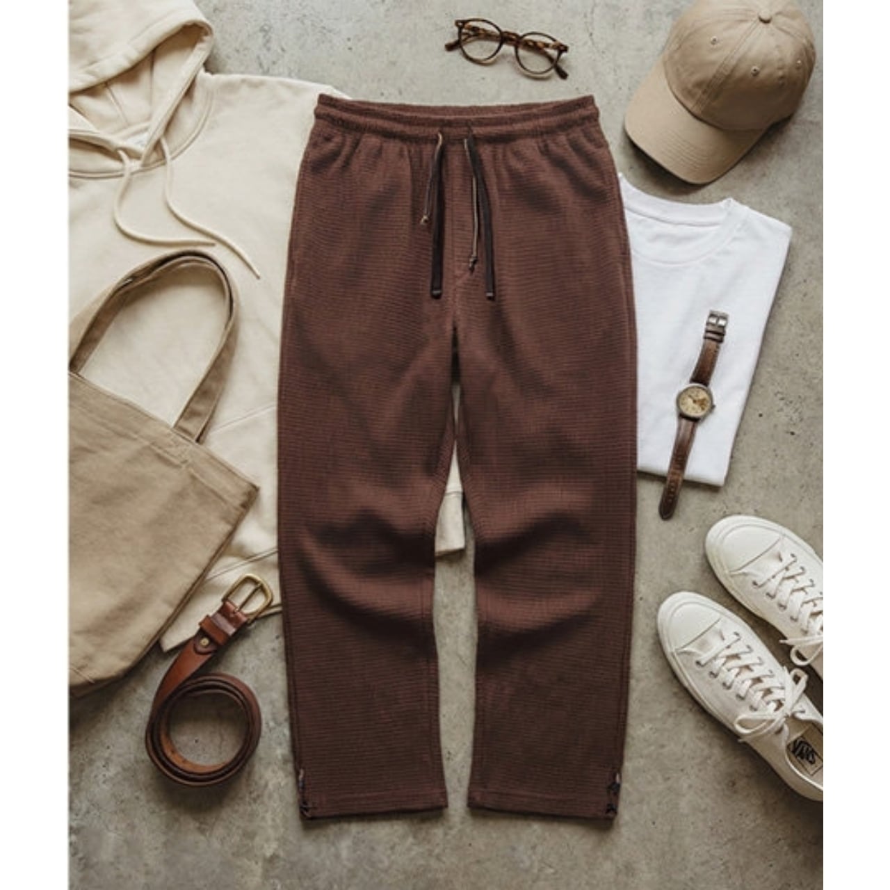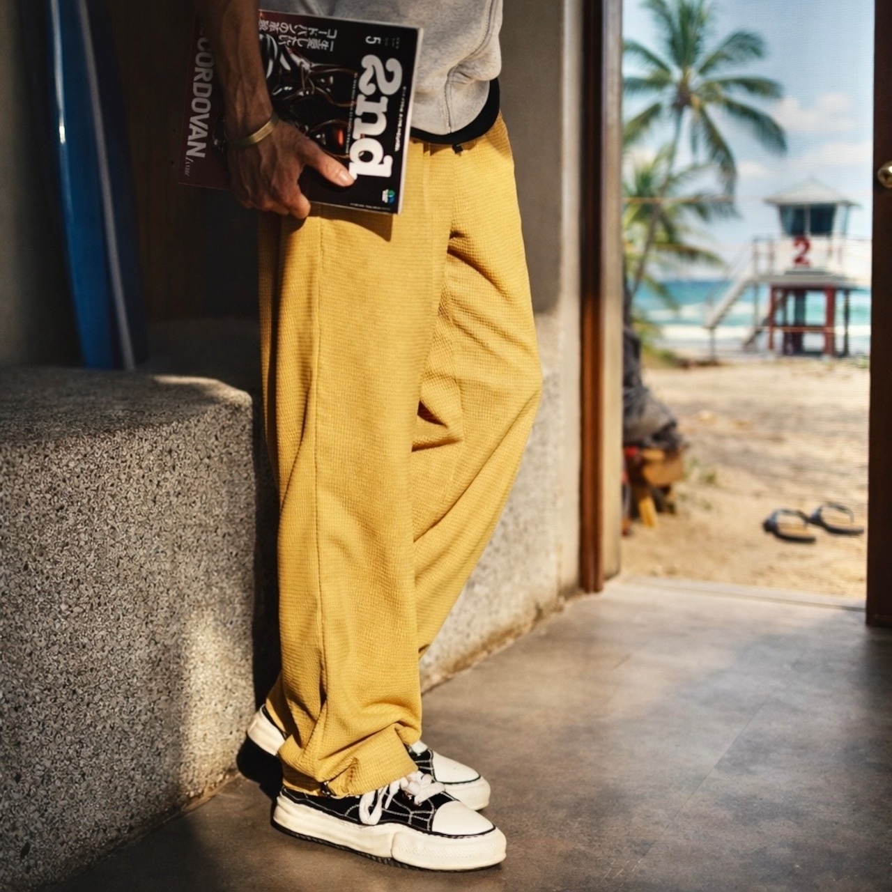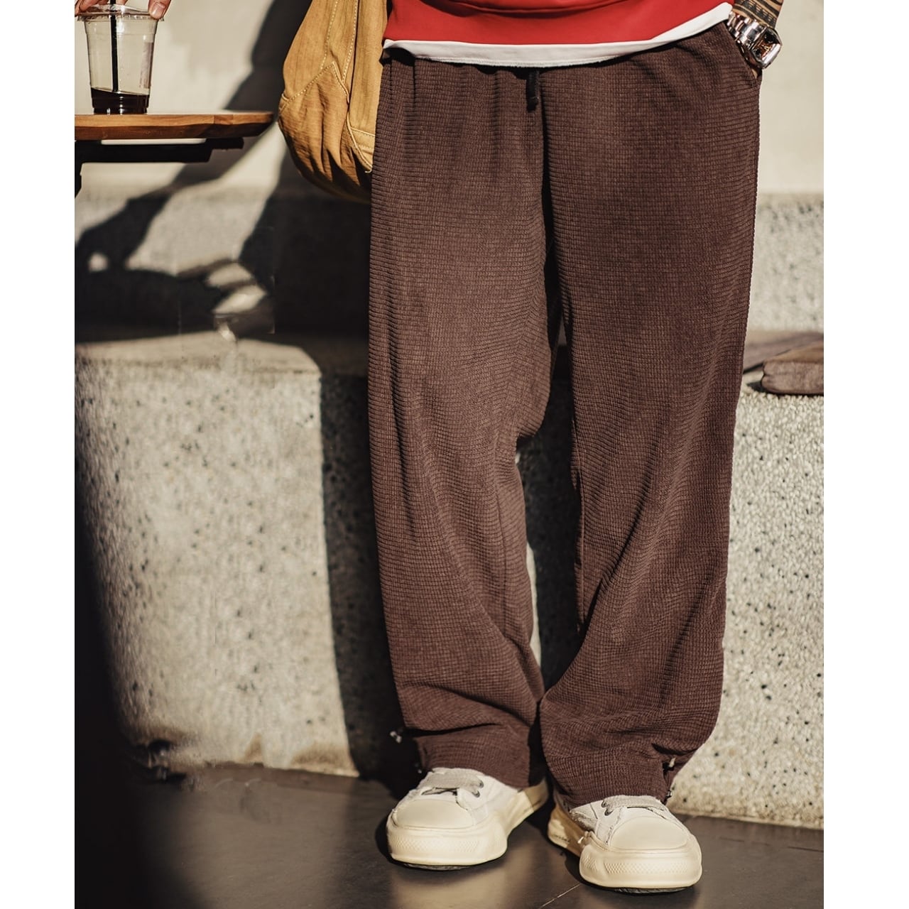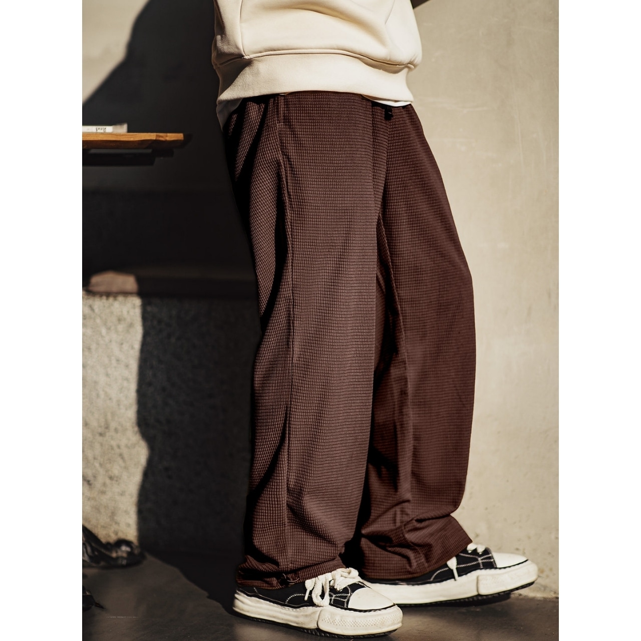 凹凸のあるワッフル生地が特徴的な、ゆったりとしたシルエットのパンツです。
