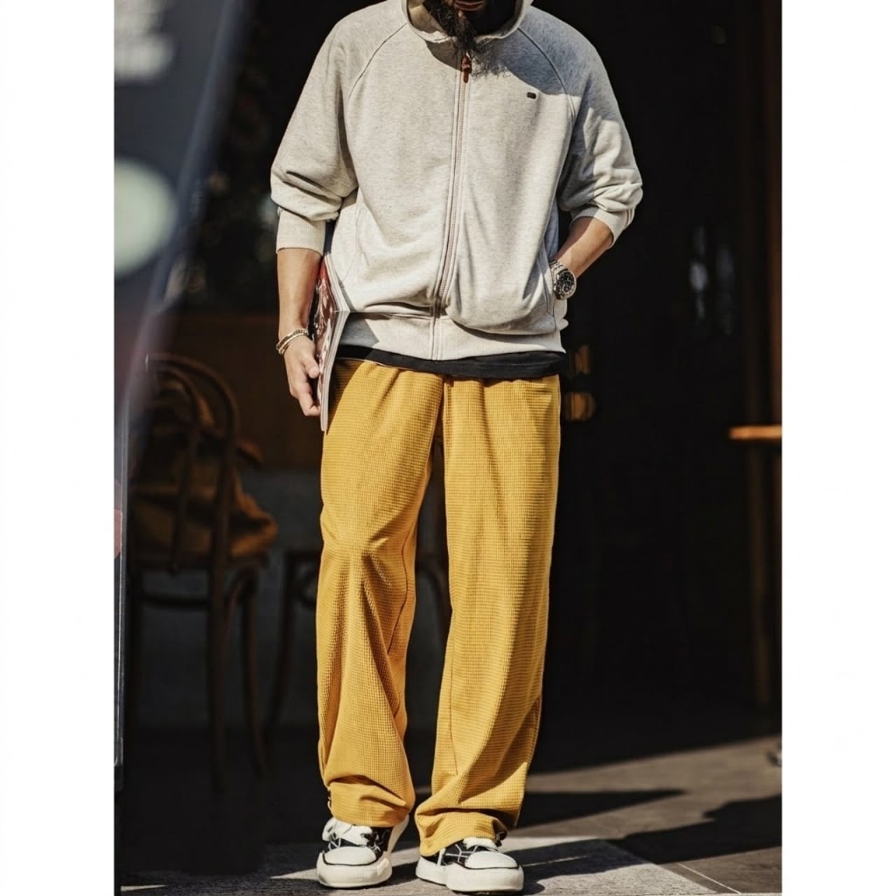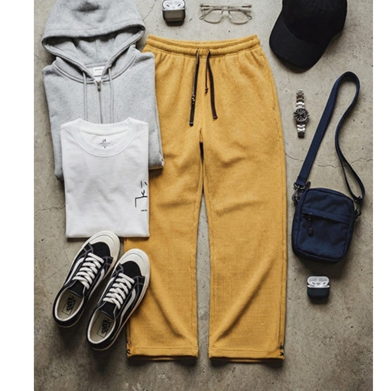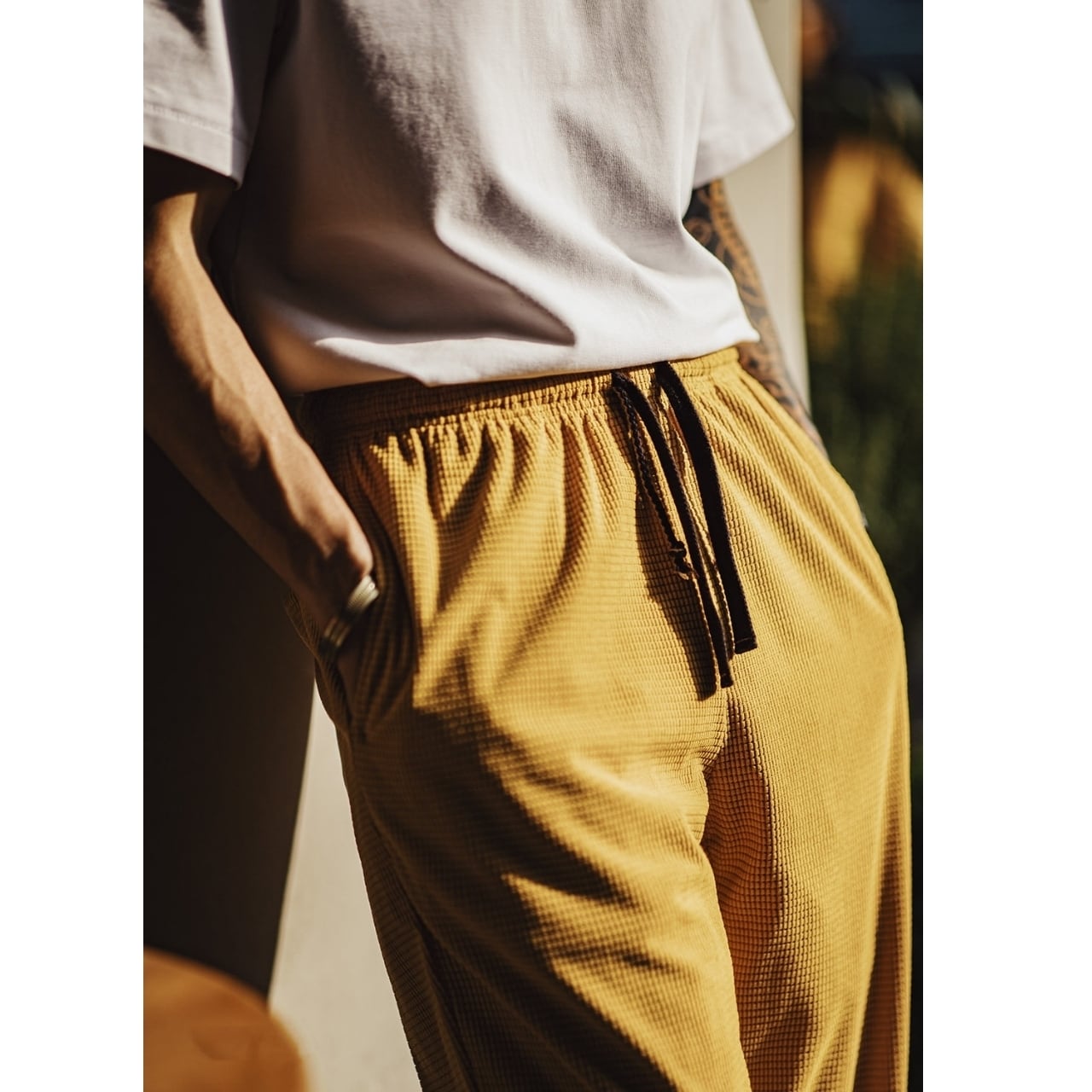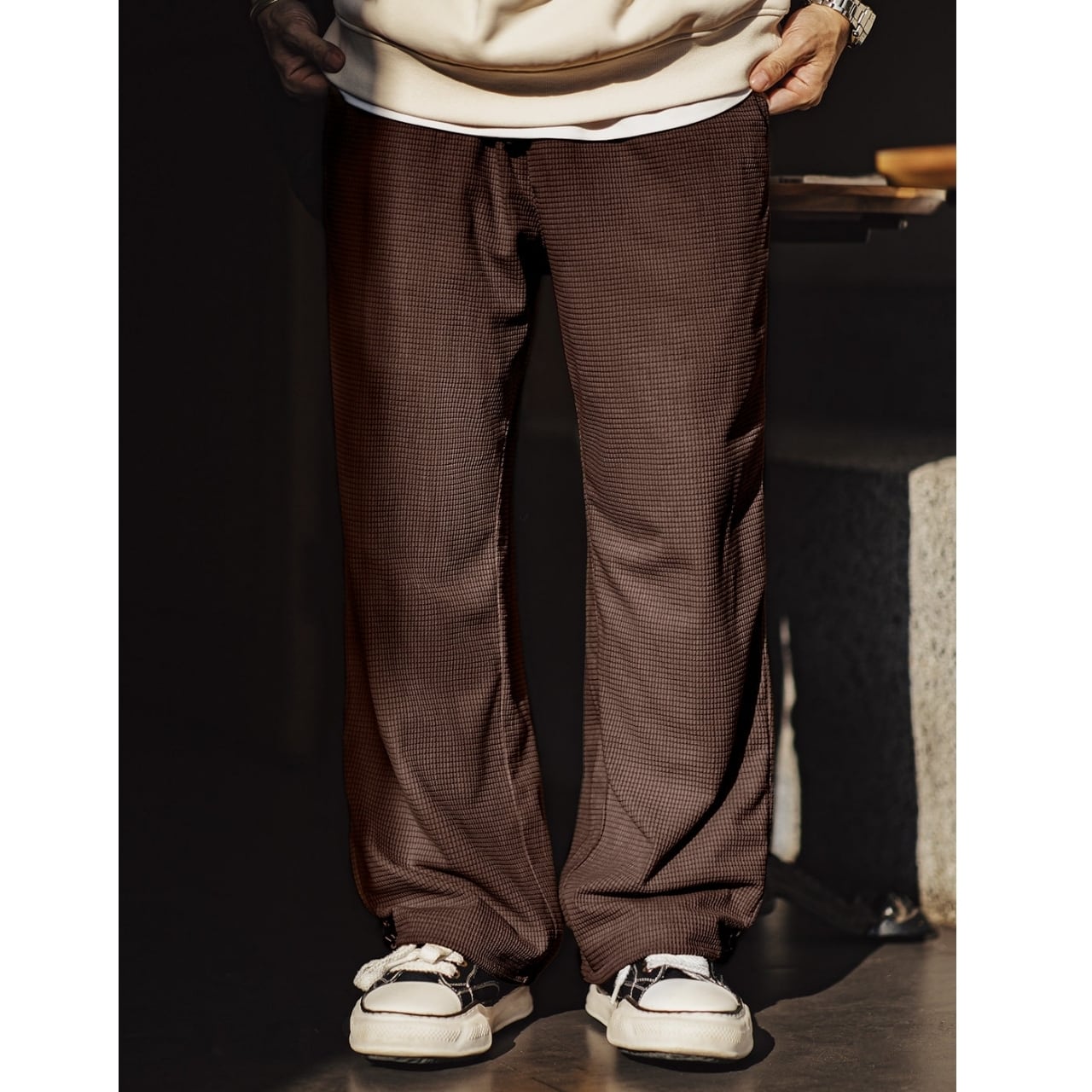 凹凸のあるワッフル生地が特徴的な、ゆったりとしたシルエットのパンツです。