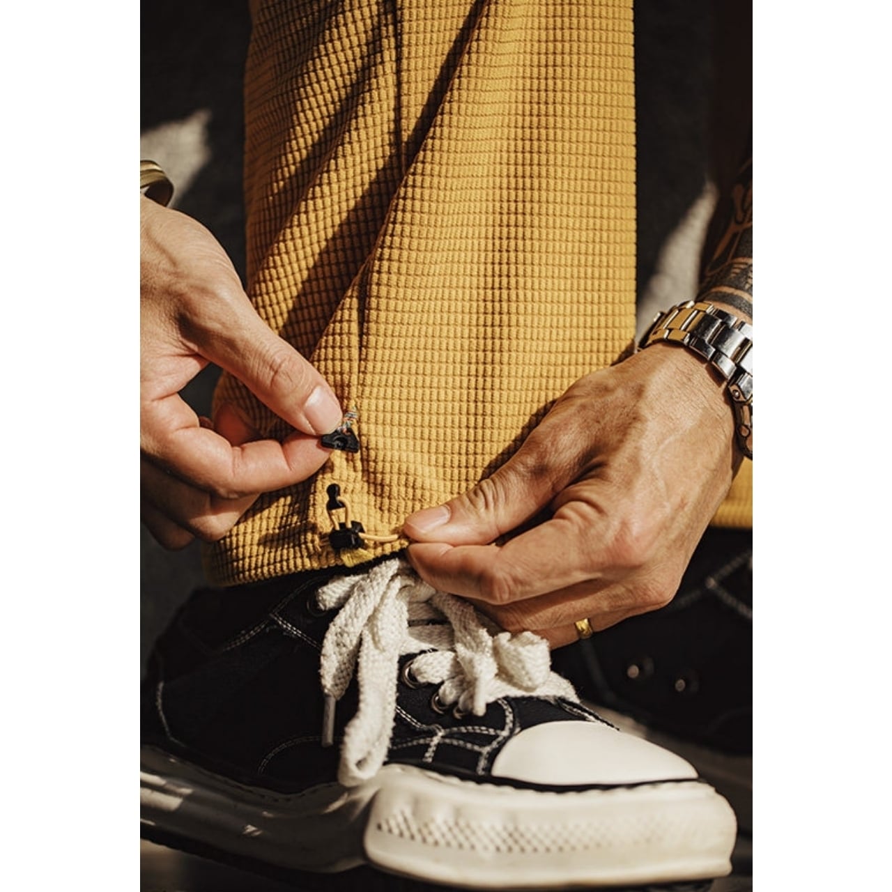 ウエストの紐がアクセントになり、毎日のコーディネートに自然に馴染む一着です。