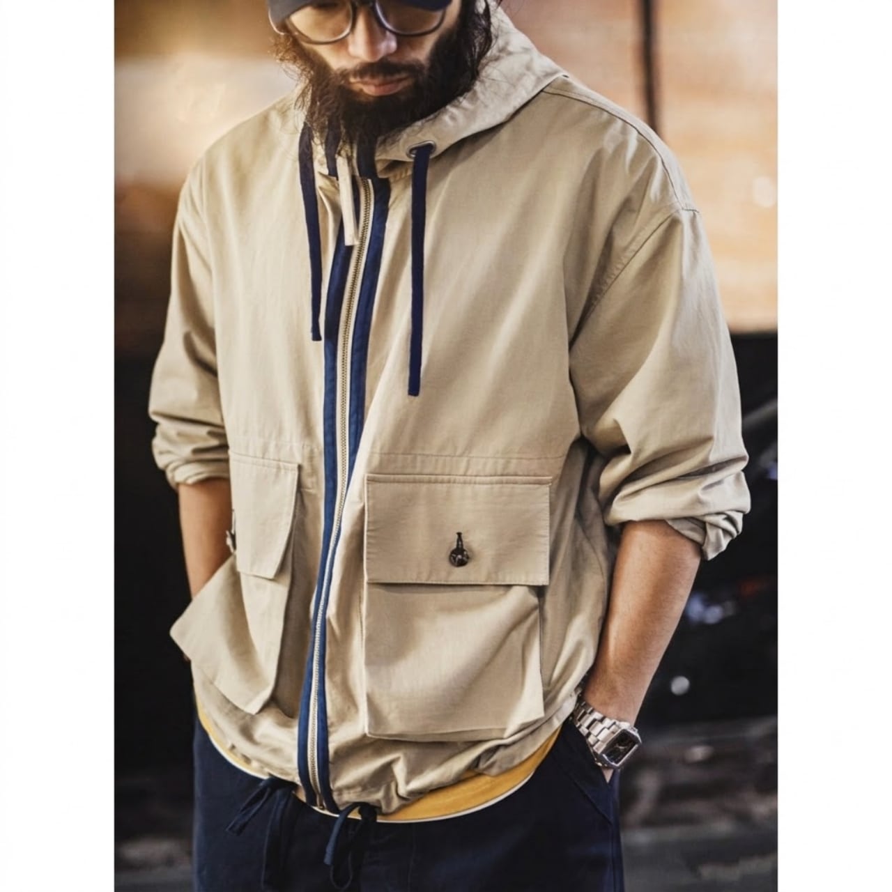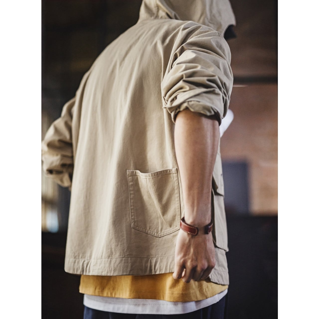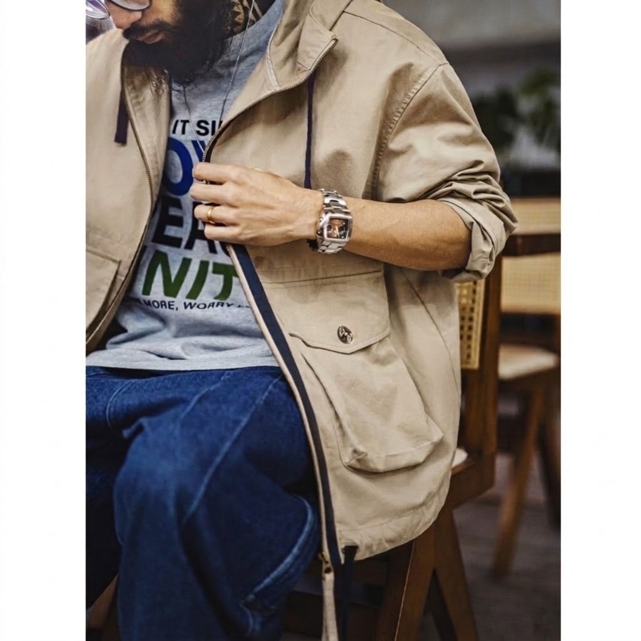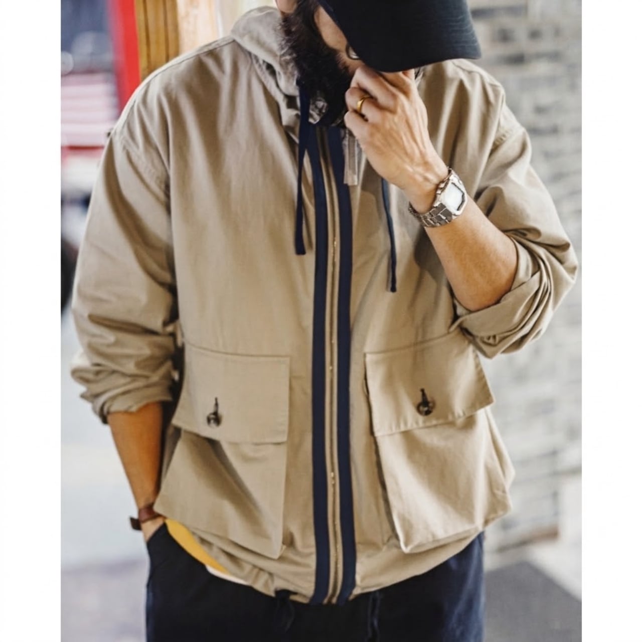大きなポケットが目を引く、ゆったりとしたシルエットのジャケットです。