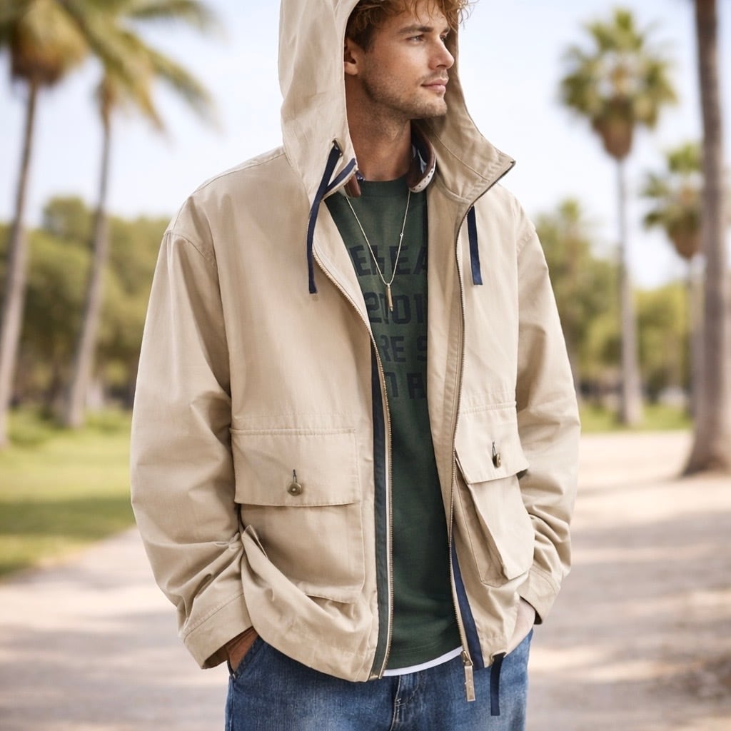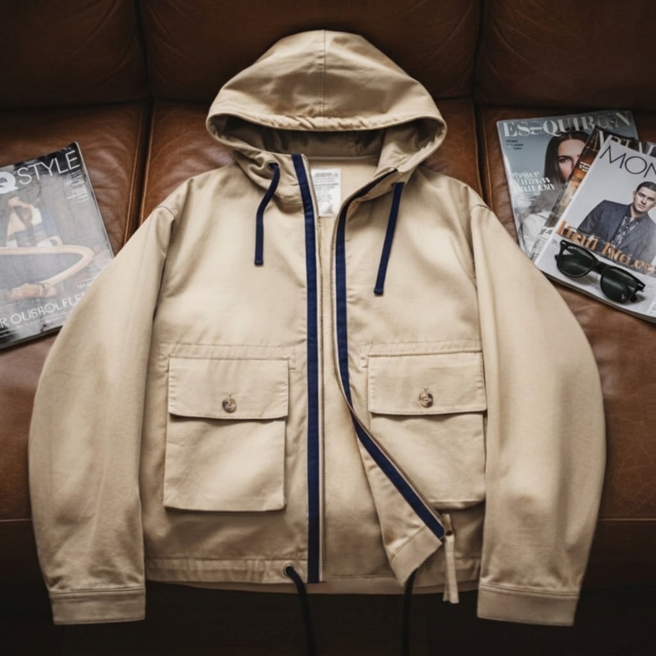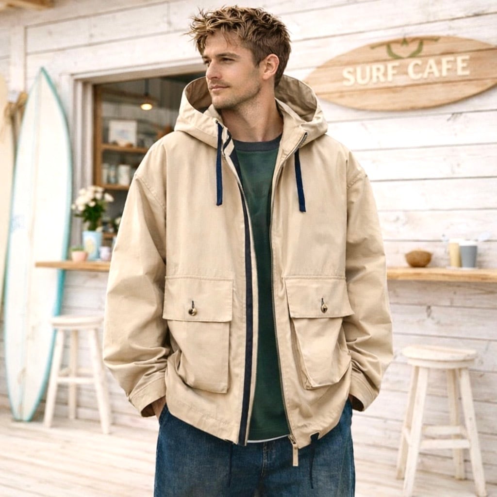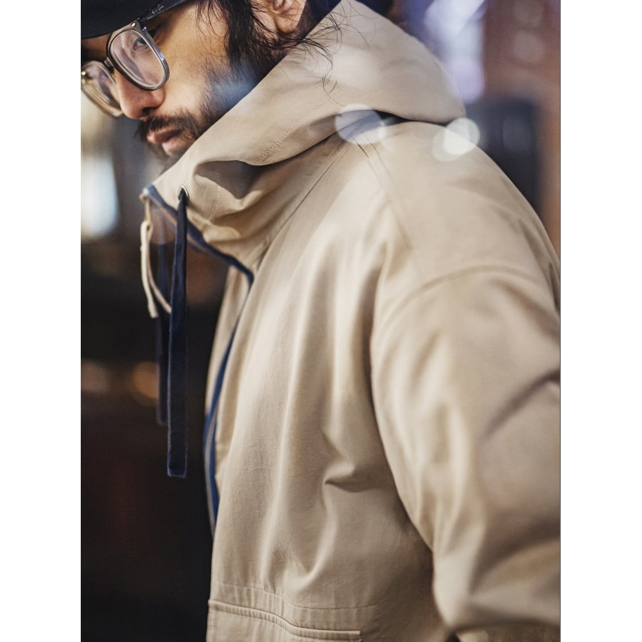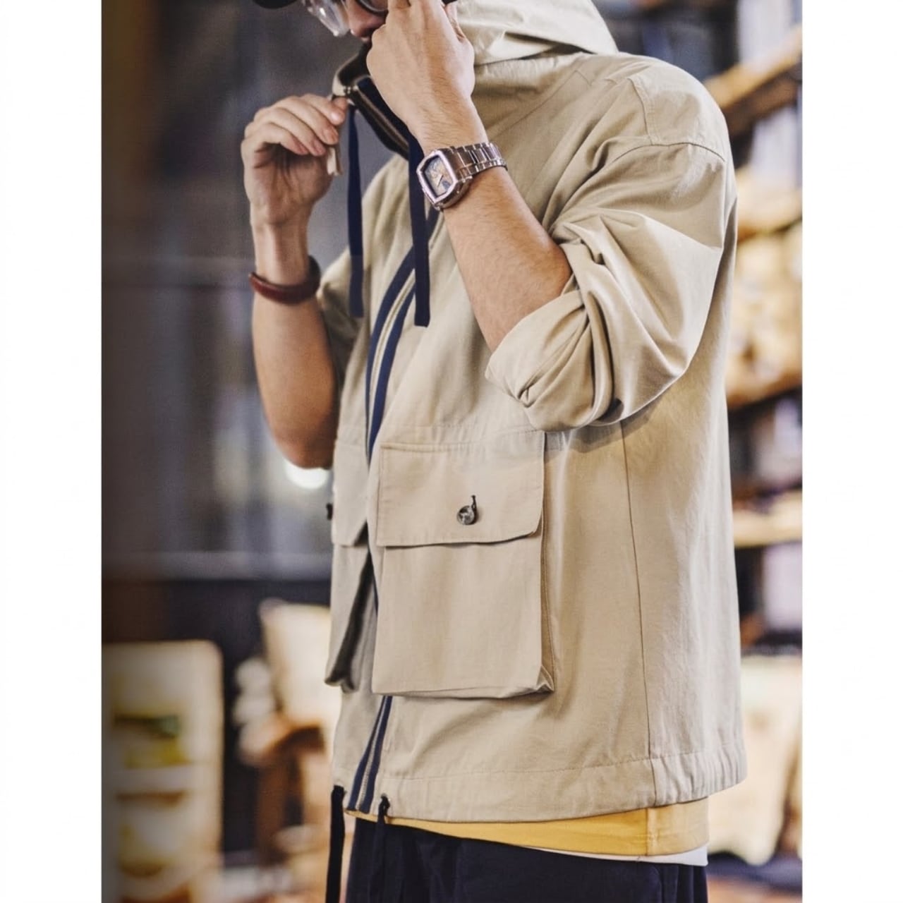 大きなポケットが目を引く、ゆったりとしたシルエットのジャケットです。