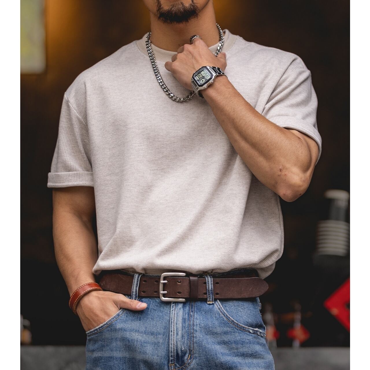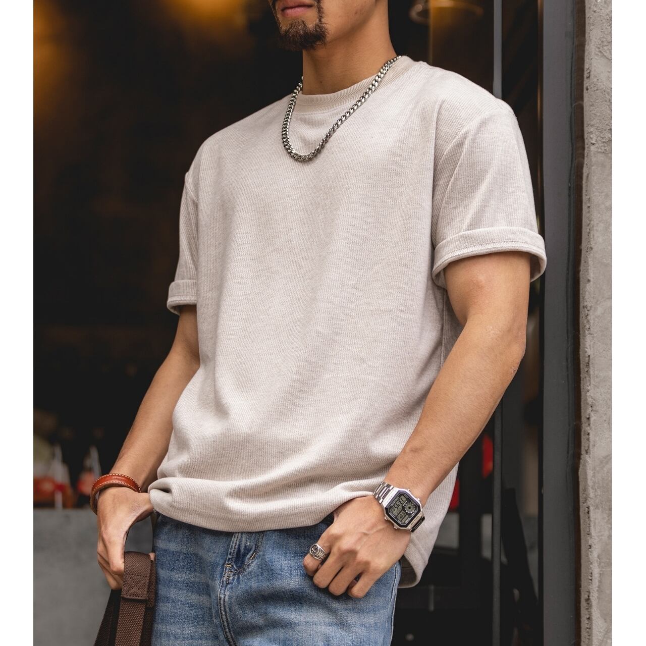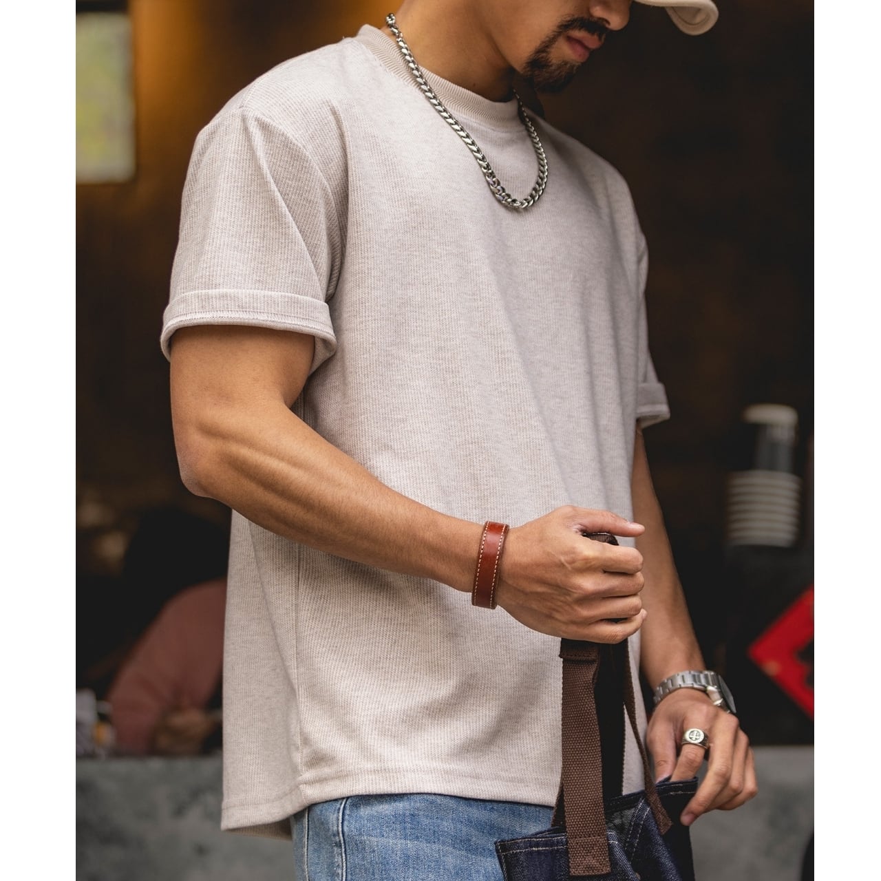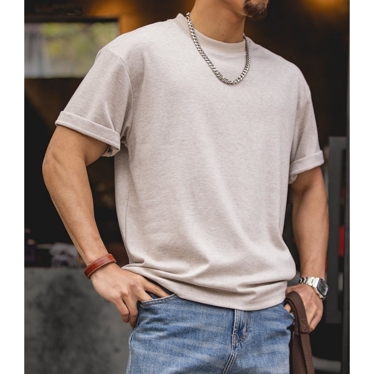 袖口を折り返したデザインが、日常のコーディネートにさりげないアクセントを加えます。