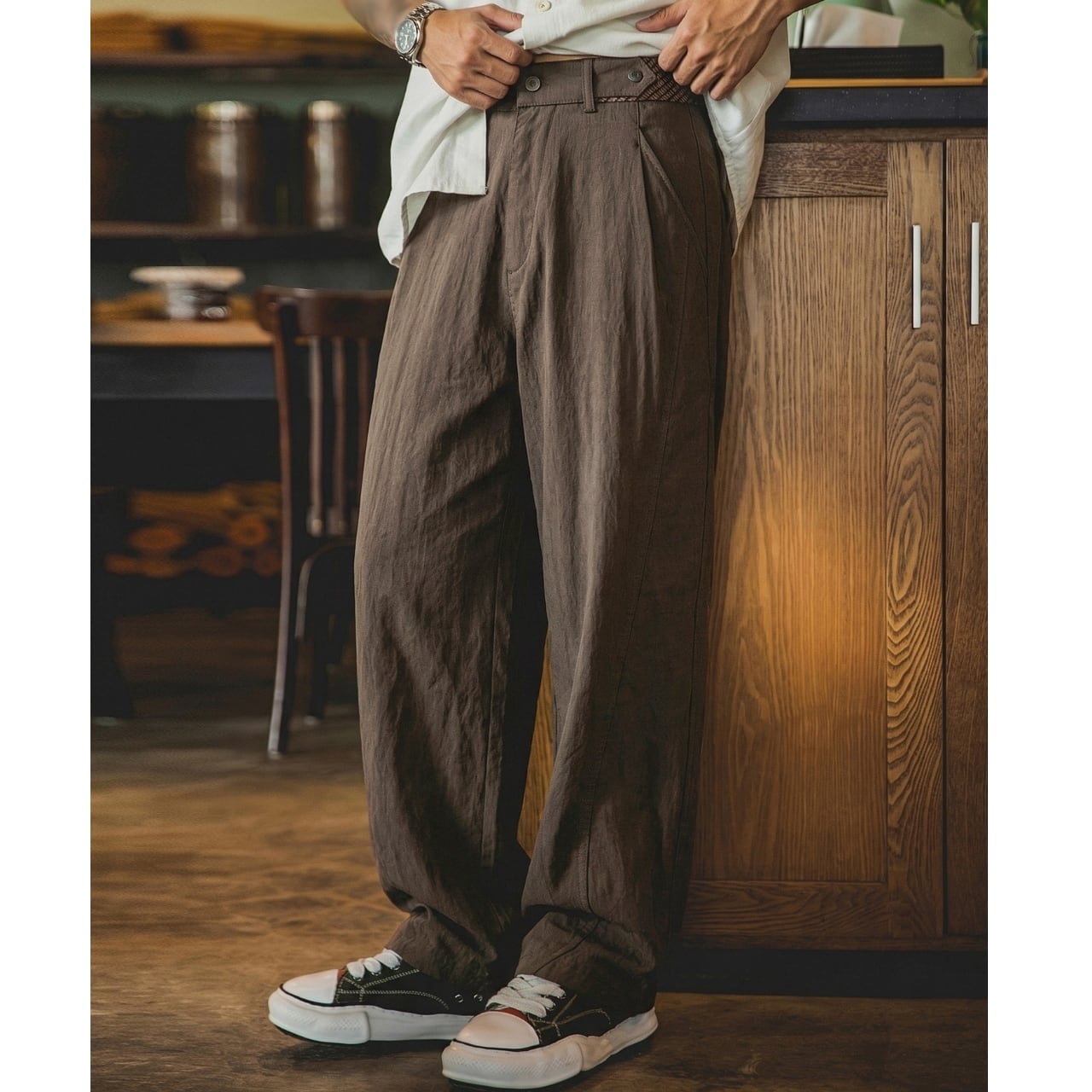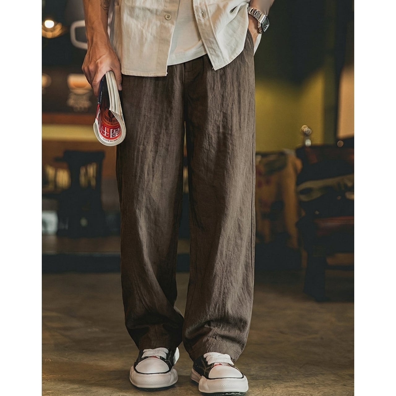 カジュアルなシャツやスニーカーと合わせて、日常のお出かけに。
