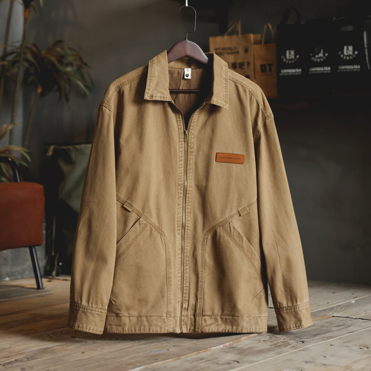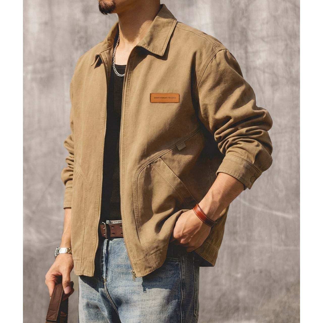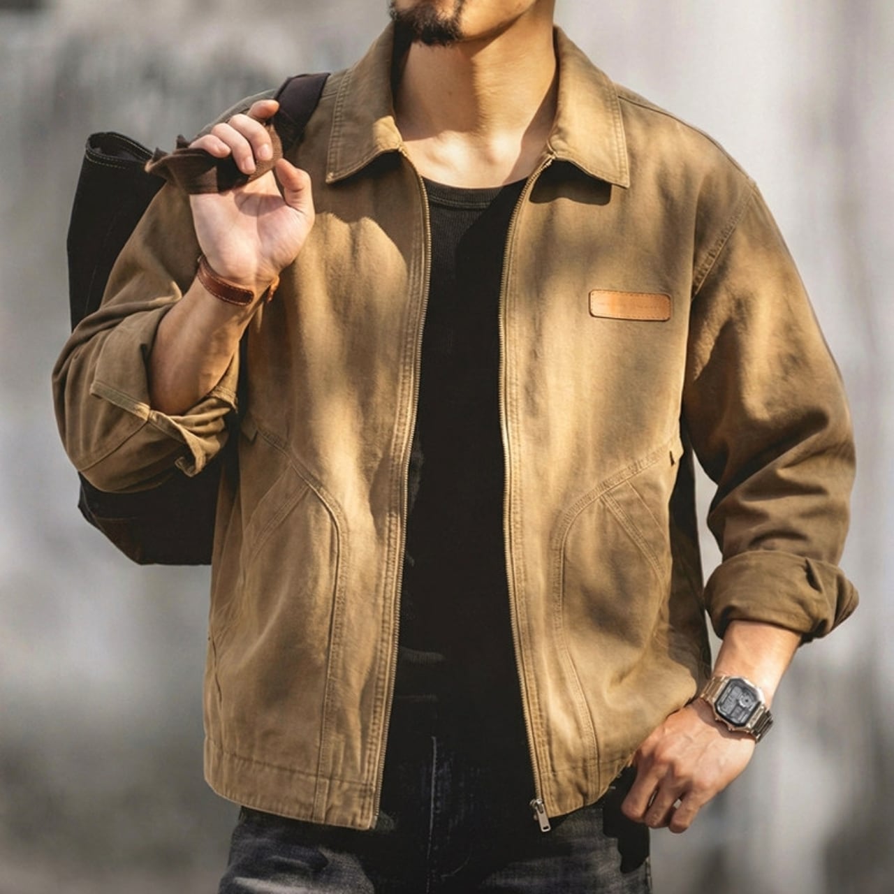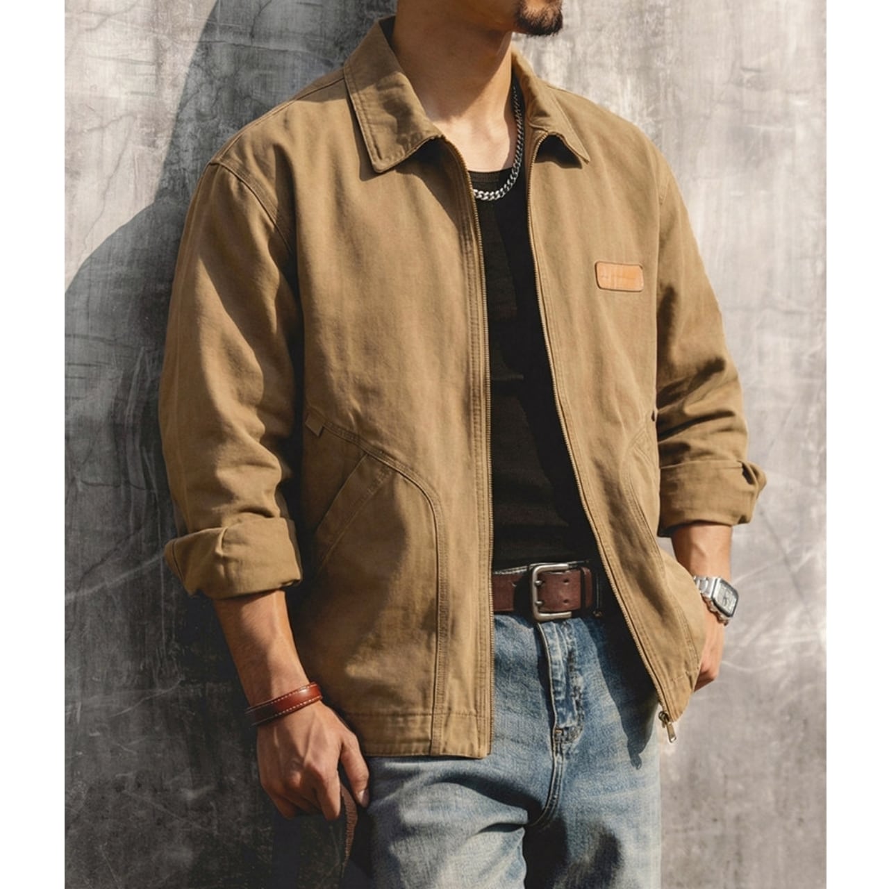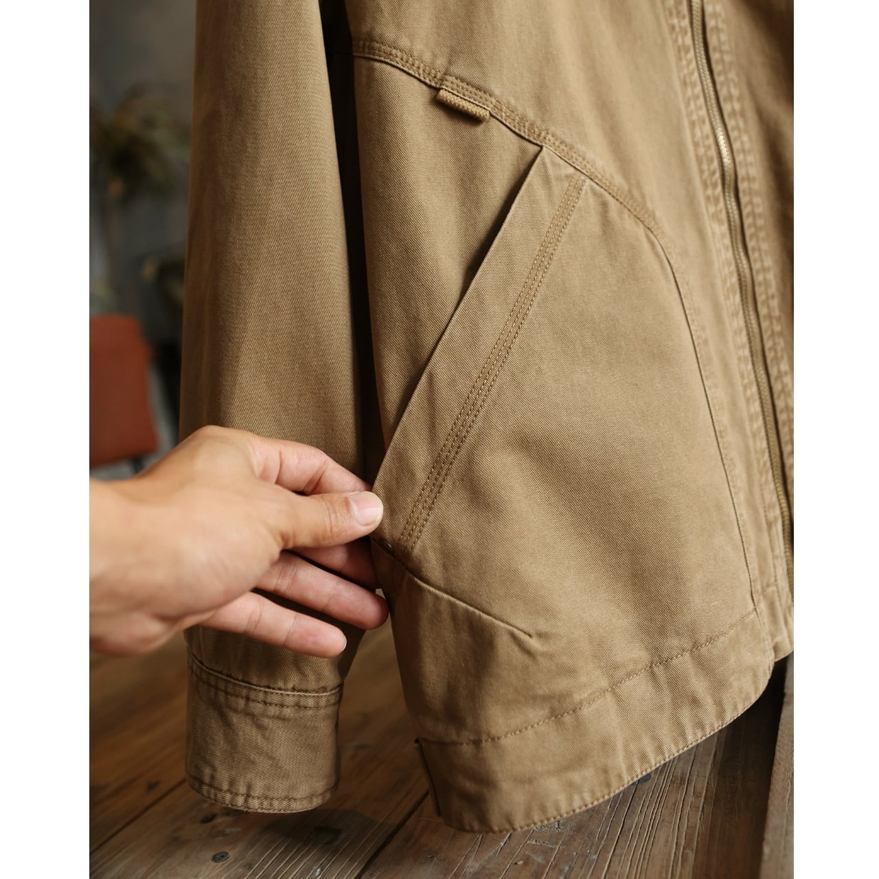 胸元のパッチと特徴的なポケットのステッチが目を引くジャケットです。