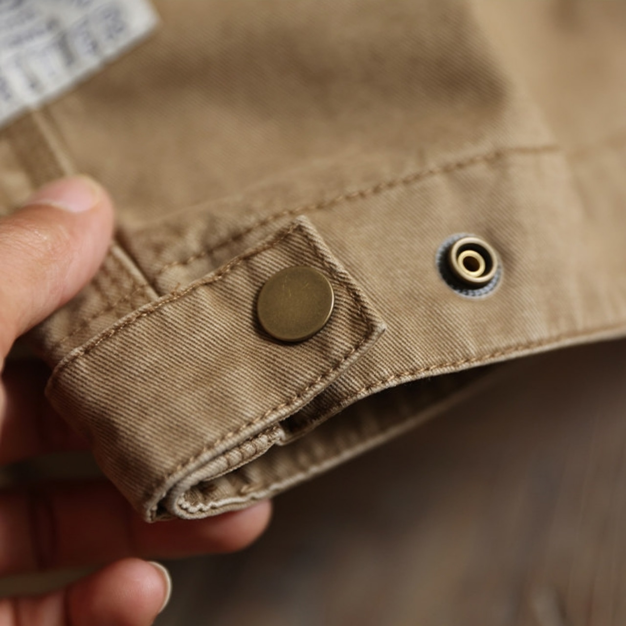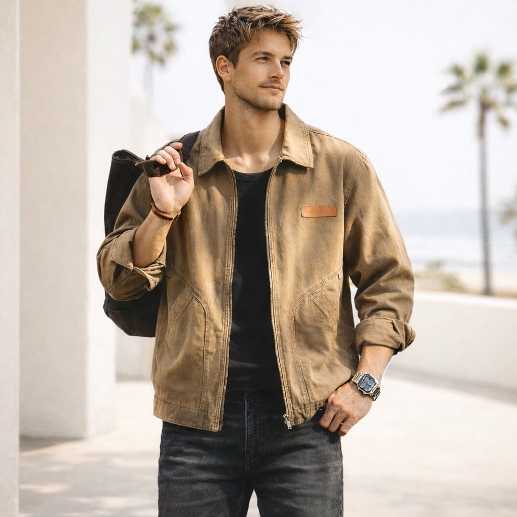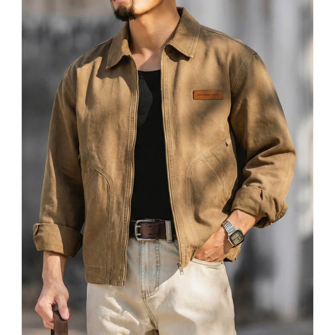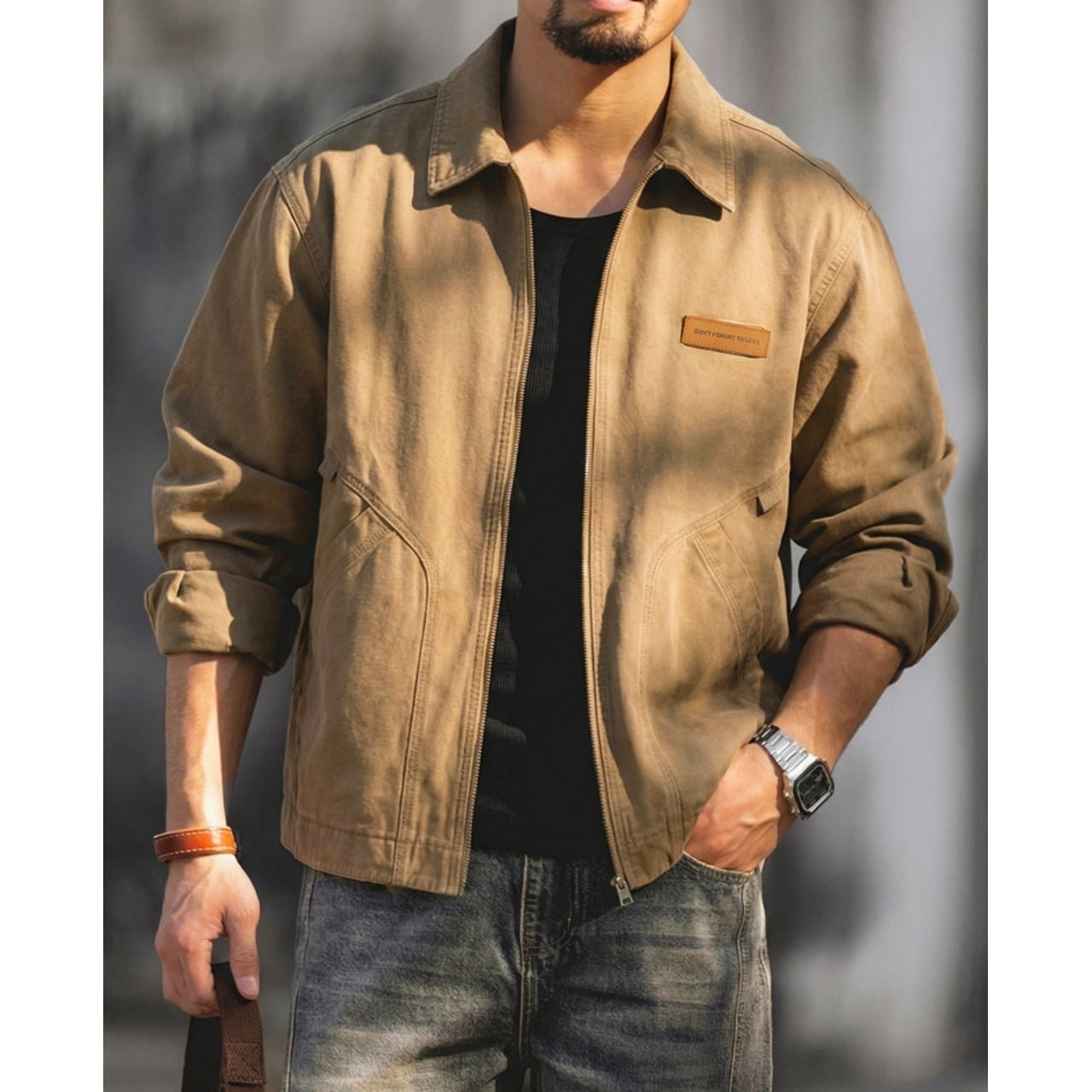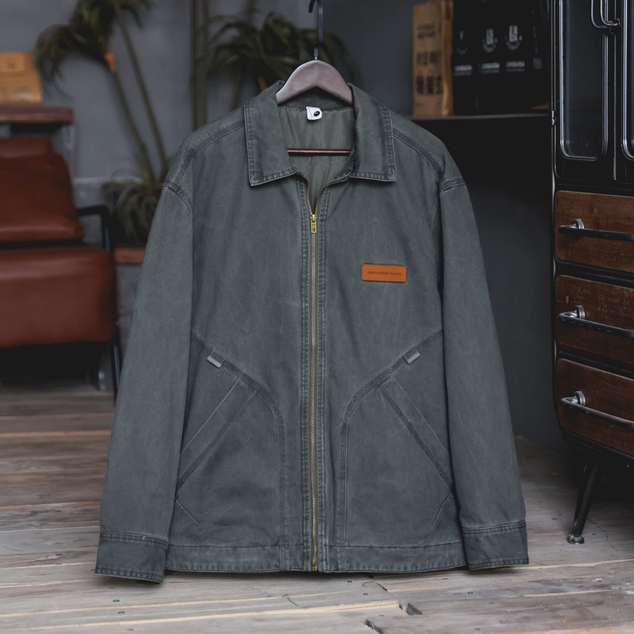 胸元のパッチと特徴的なポケットのステッチが目を引くジャケットです。