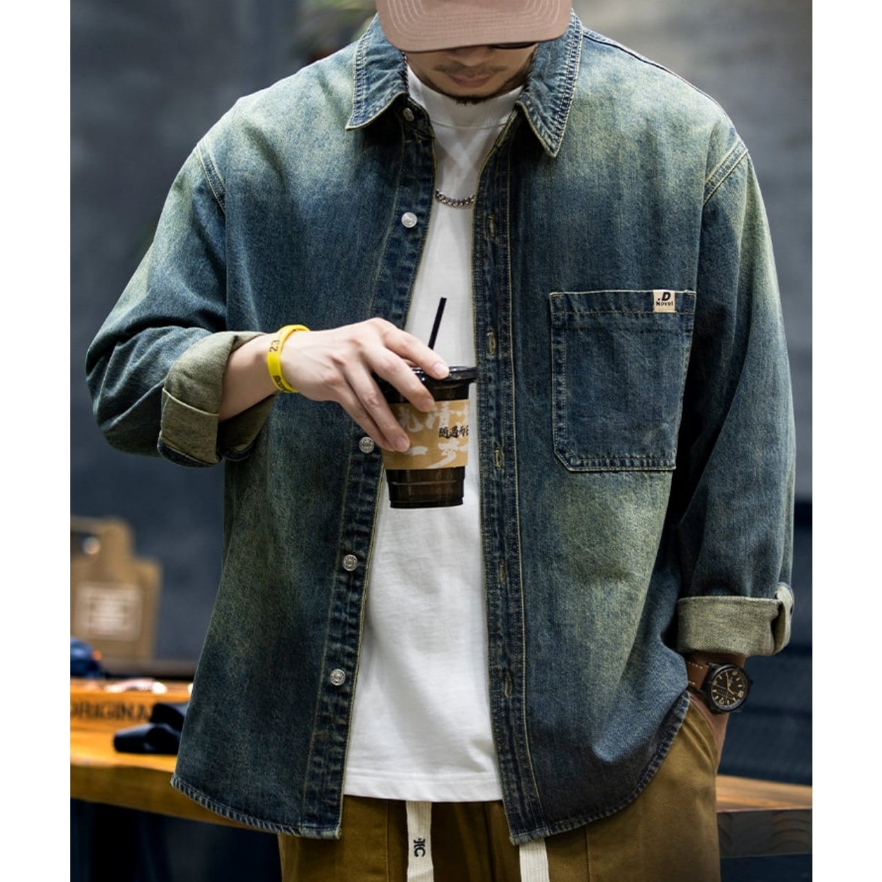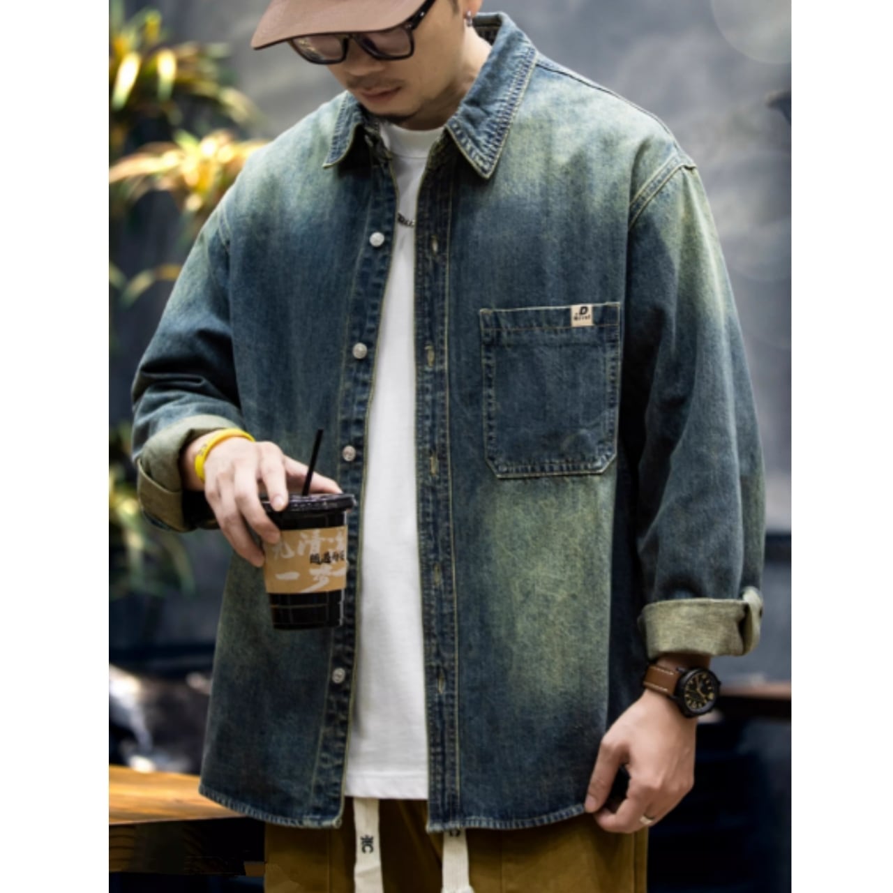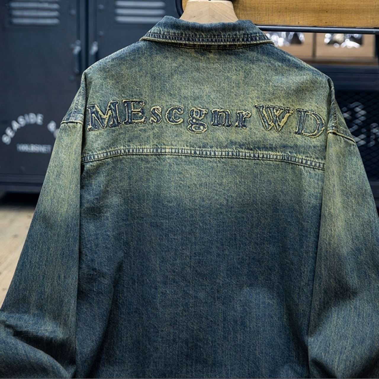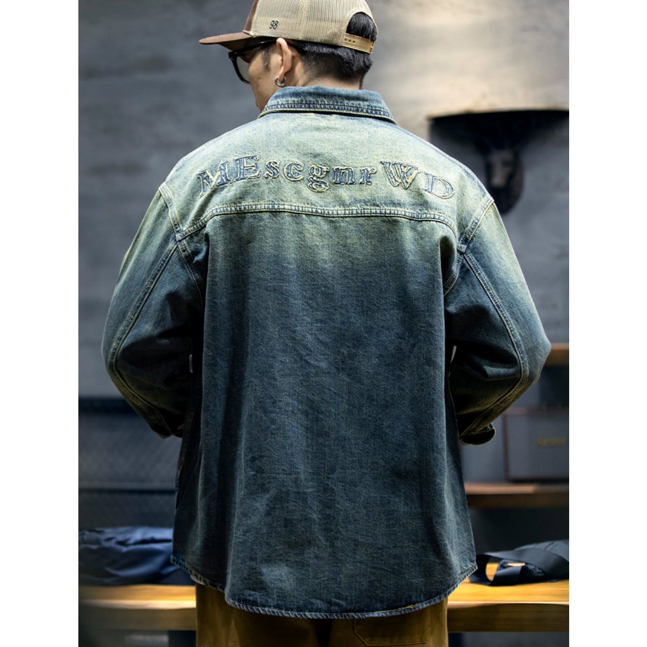 ヴィンテージ感のある風合いと、背面に施された大きなロゴ刺繍が目を引く一枚です。