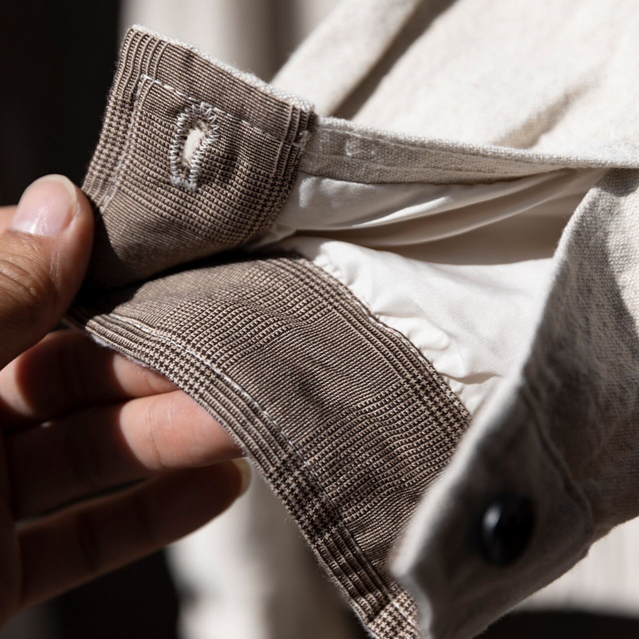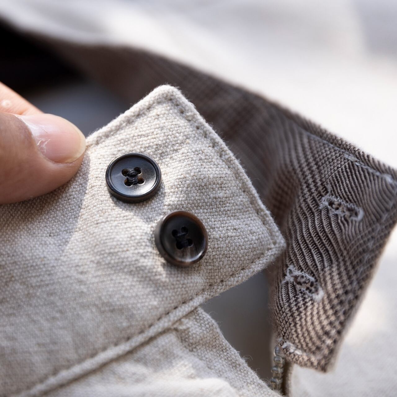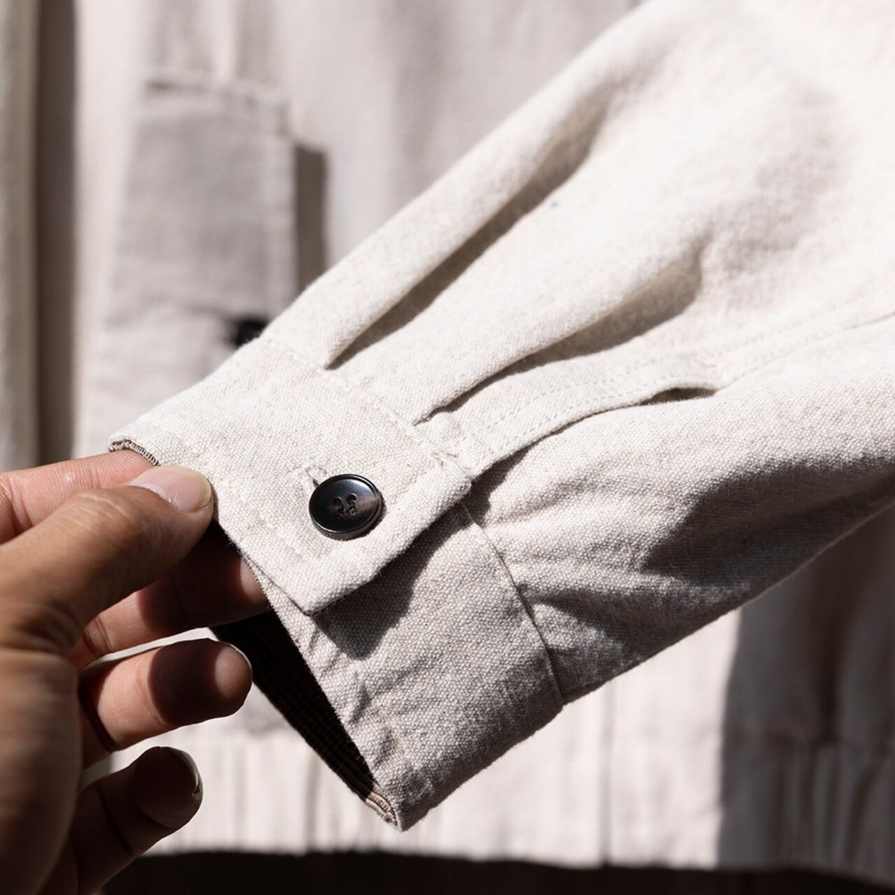 ゆったりとしたシルエットに、裾のゴムやボタン付きのポケットが落ち着いた印象を与えます。