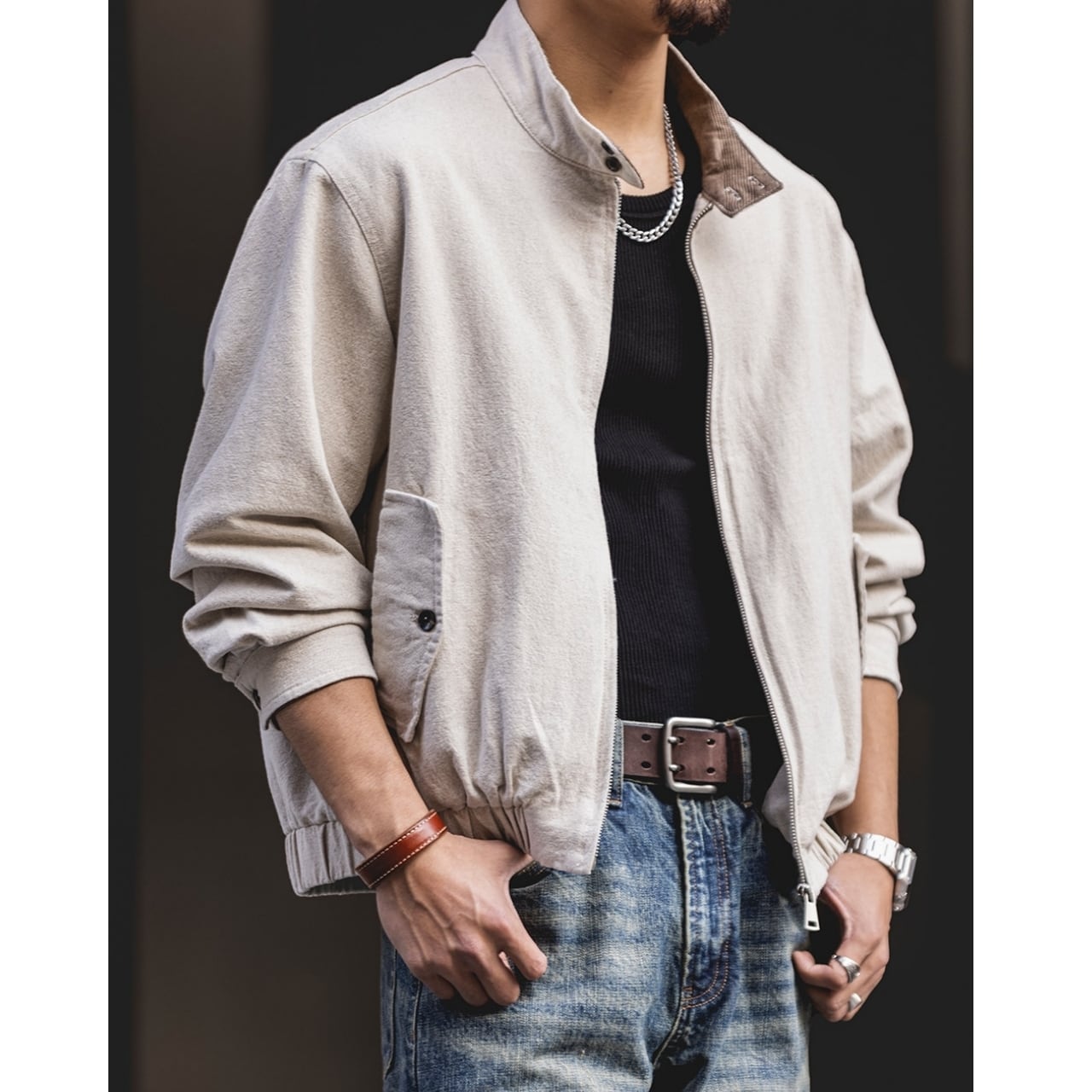 首元にアクセントを添える、立ち襟デザインのジャケットです。