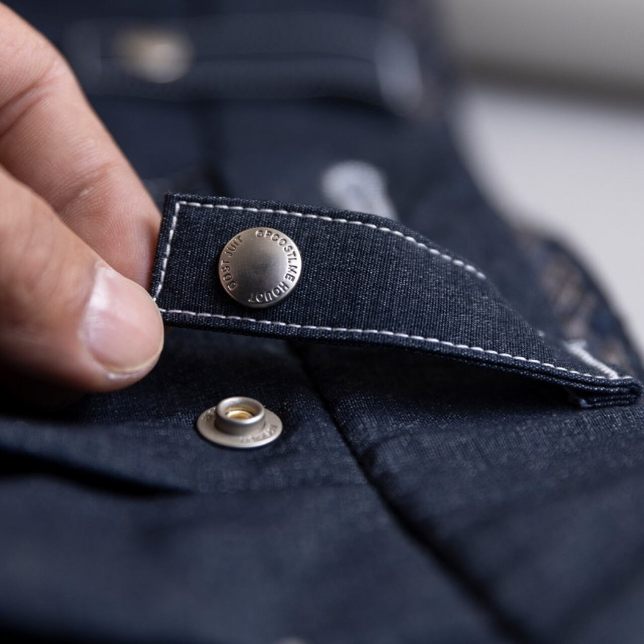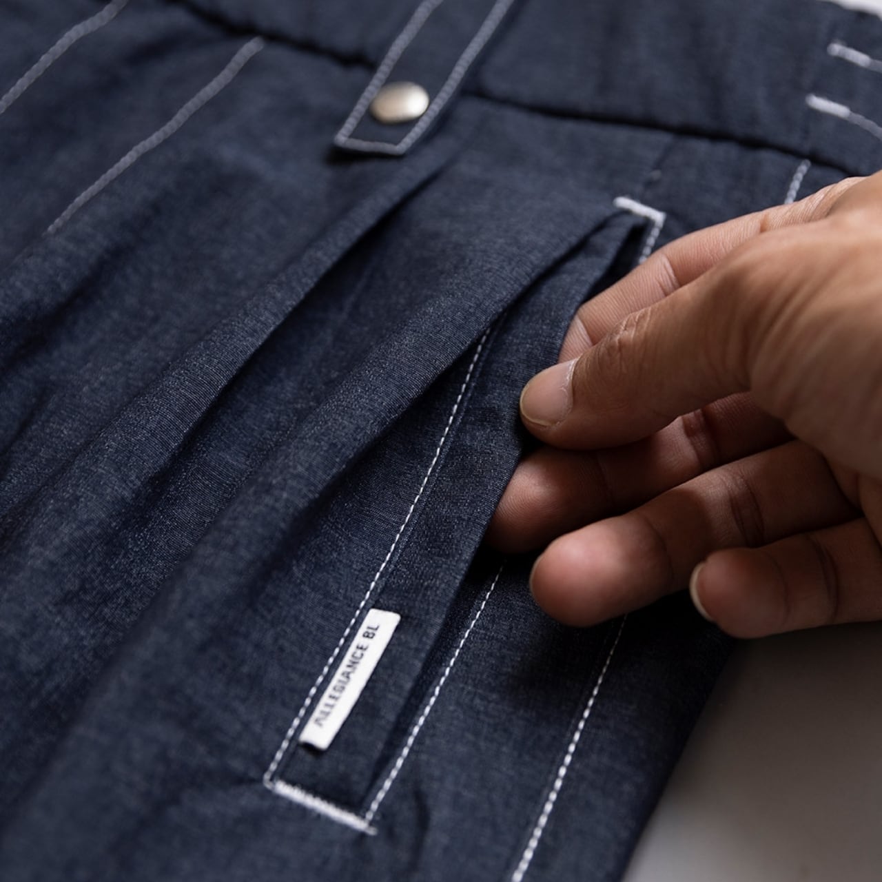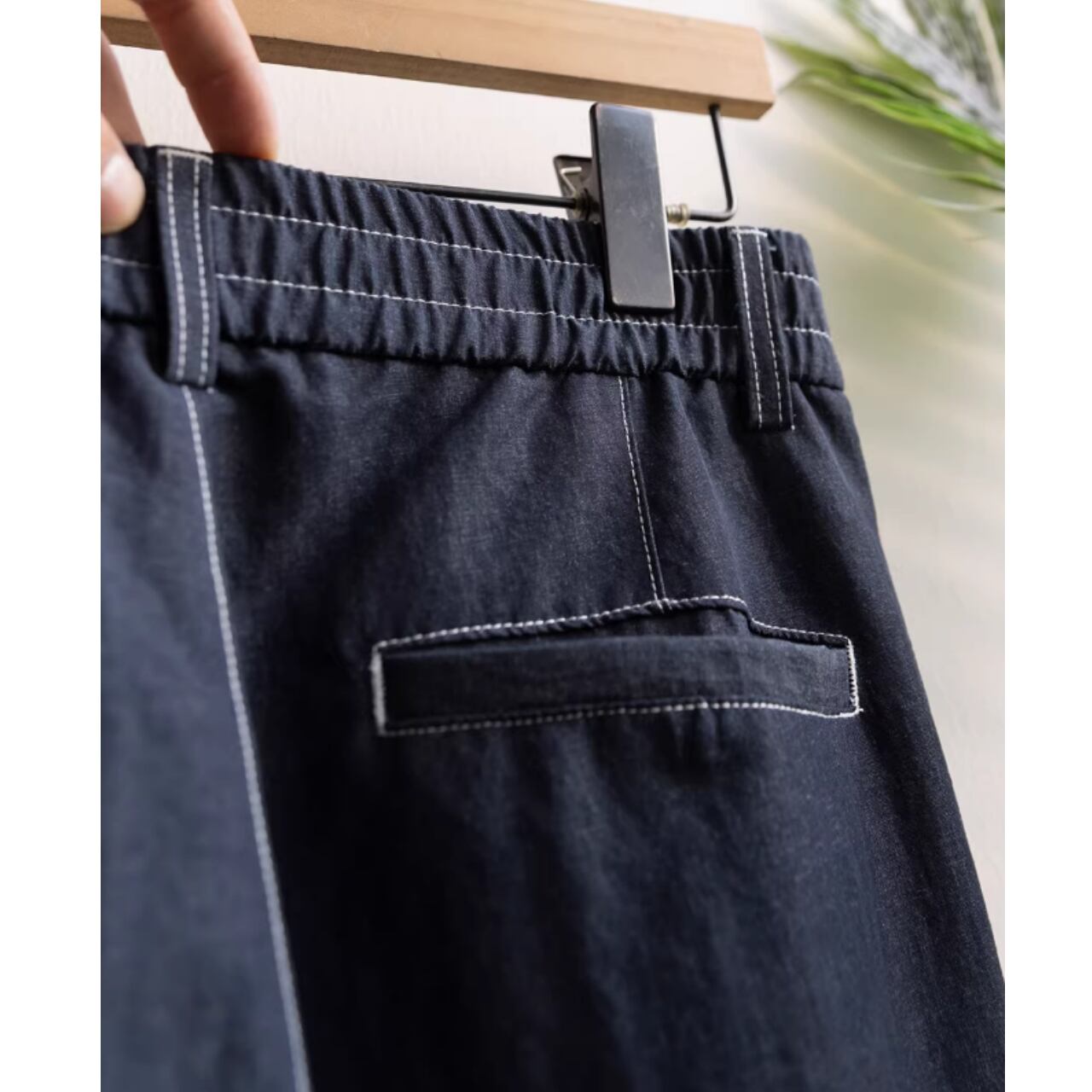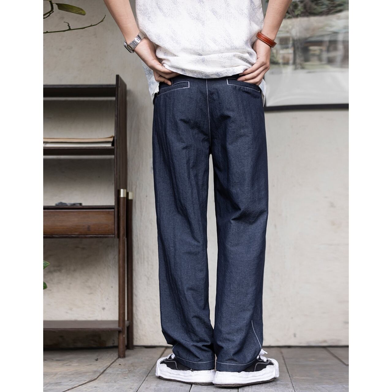 ゆったりとしたワイドシルエットに、白いステッチがさりげないアクセントを添える一着です。