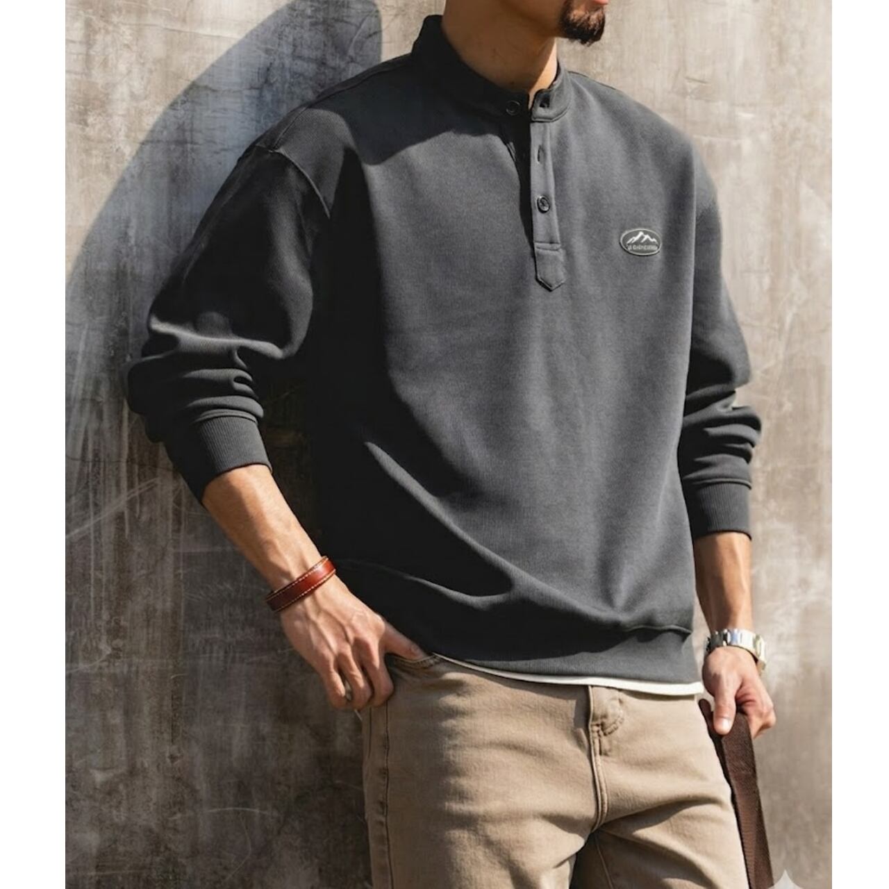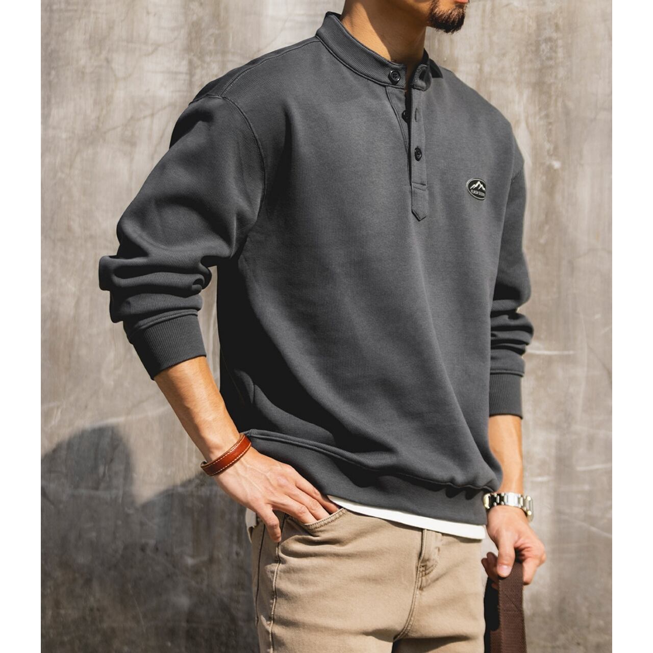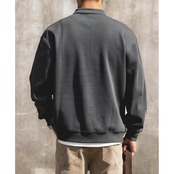 胸元の山モチーフのワッペンが目を引く、ヘンリーネックのスウェットです。