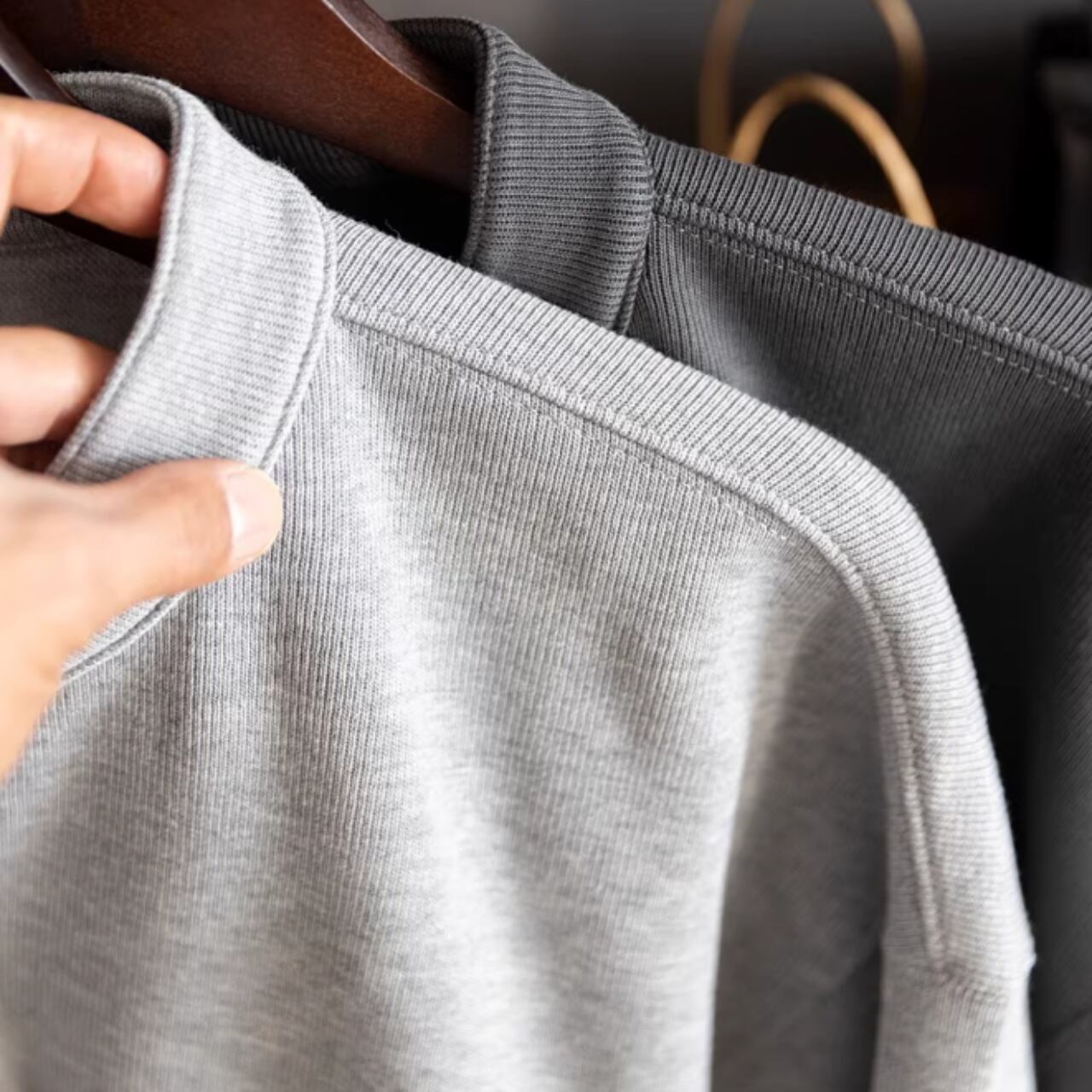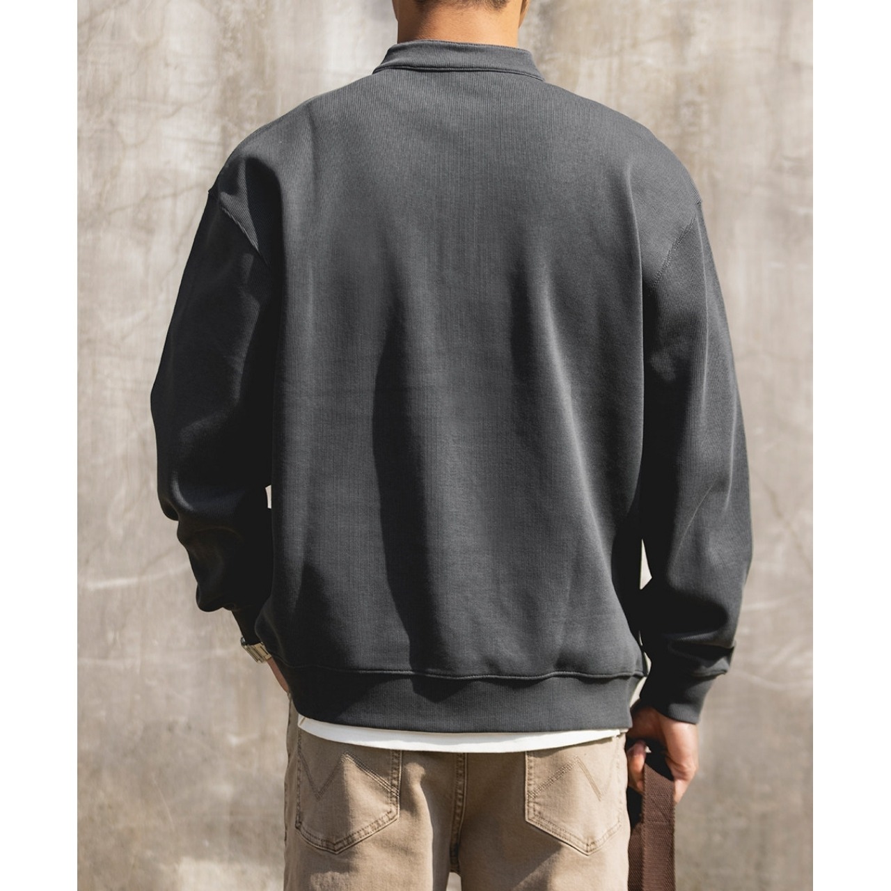 首元のボタンがアクセントになり、一枚でも重ね着でも幅広いコーディネートに馴染みます。