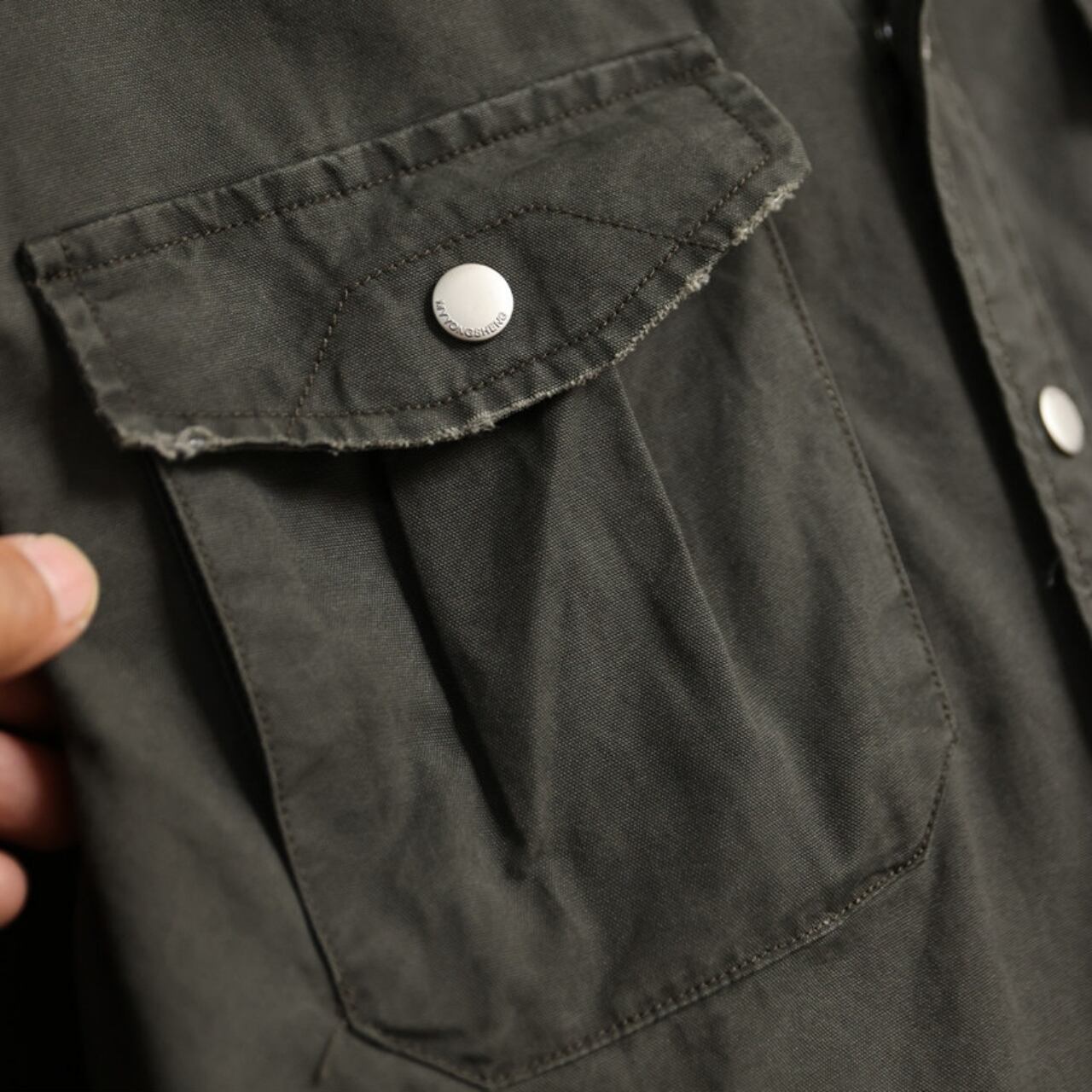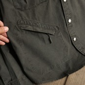 大きな胸ポケットと斜めのジップが目を引く、存在感のある一着です。