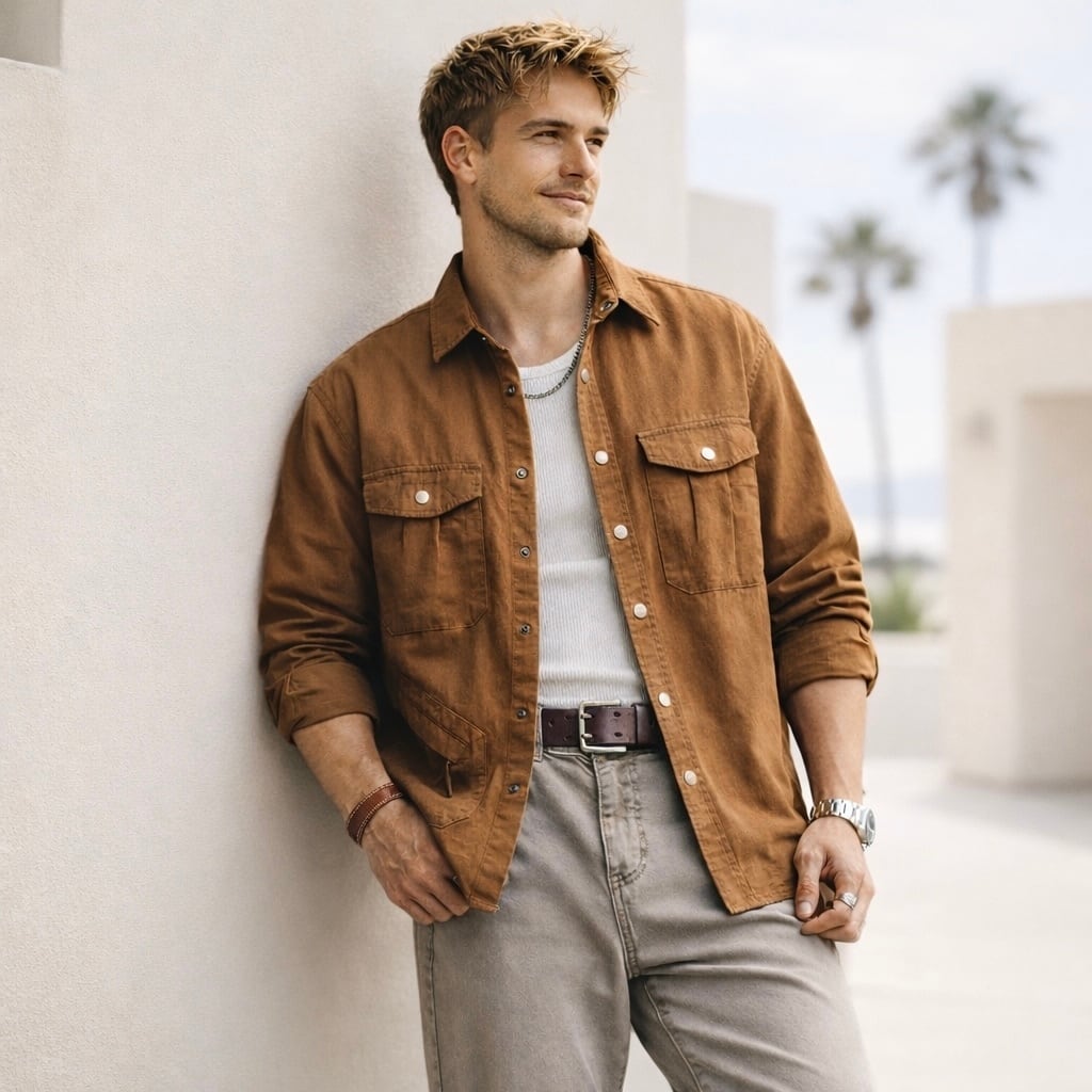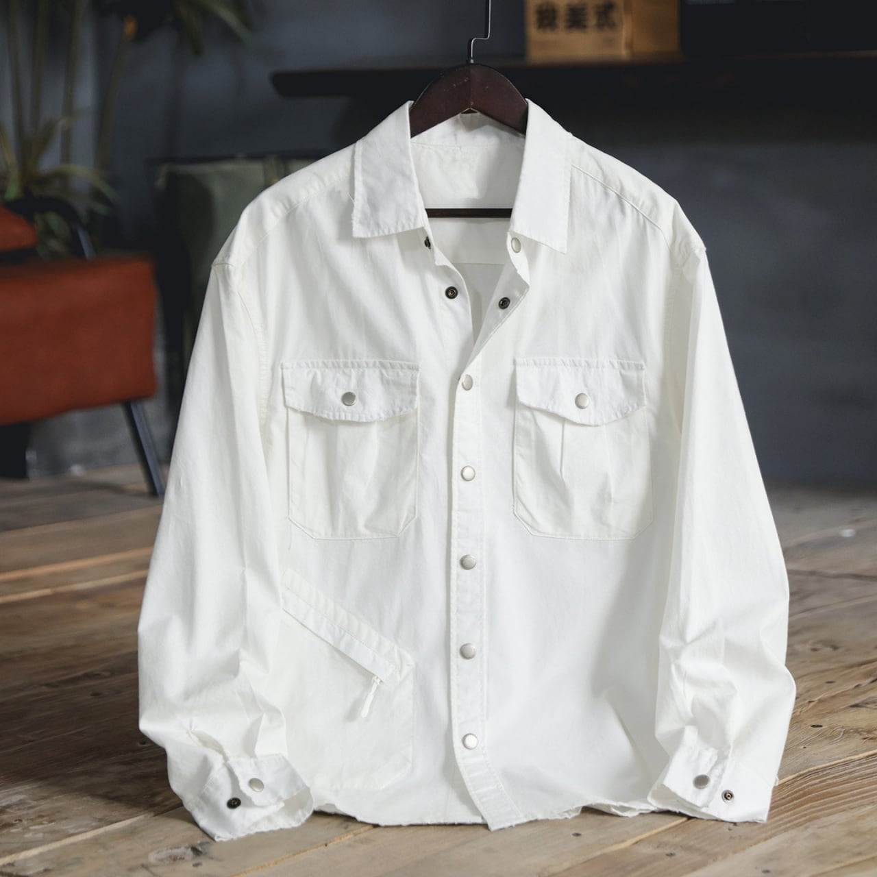 大きな胸ポケットが目を引く、ゆったりとしたシルエットのシャツです。