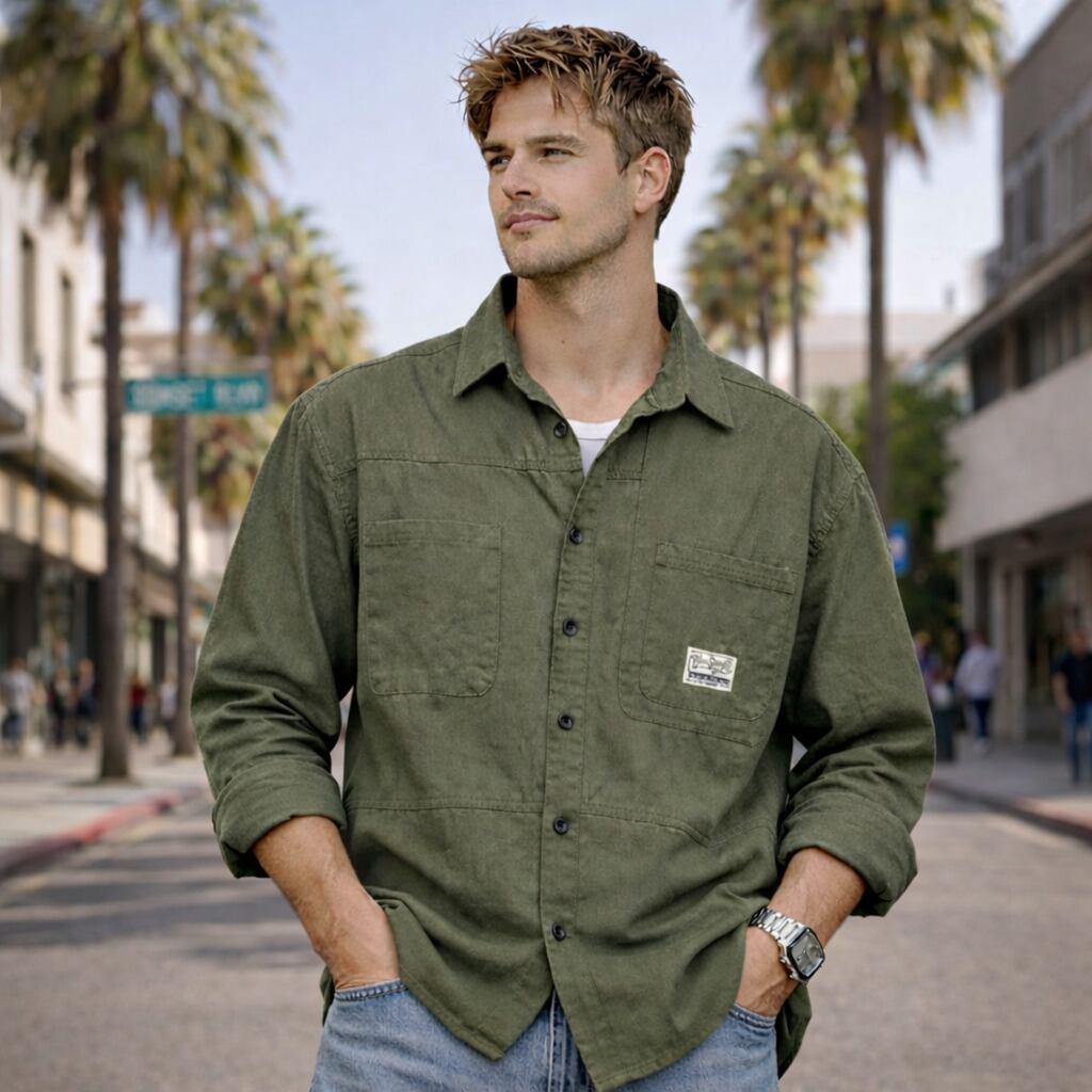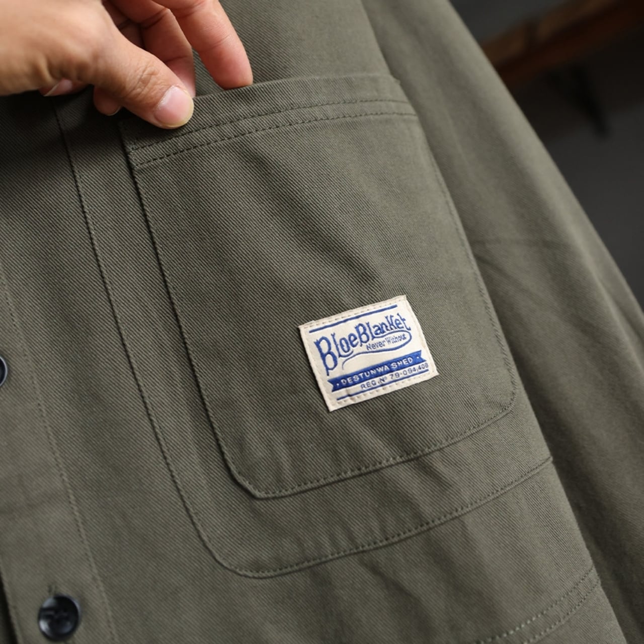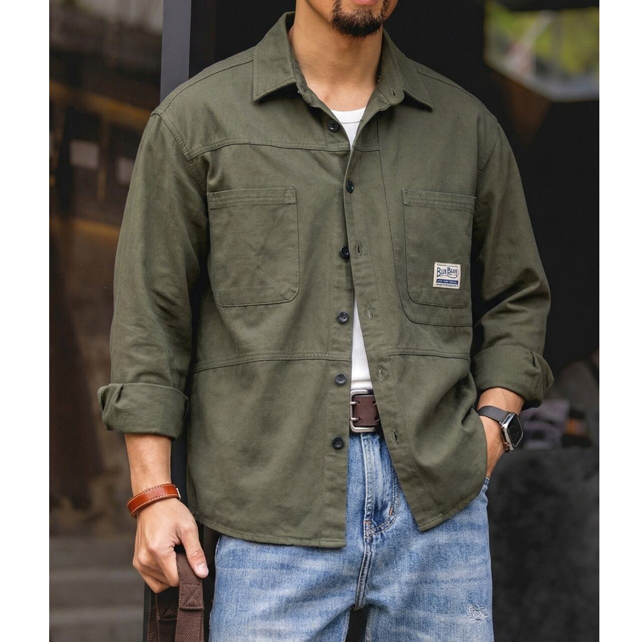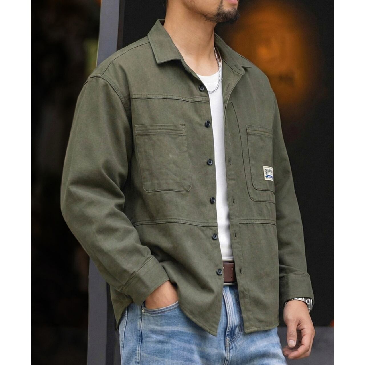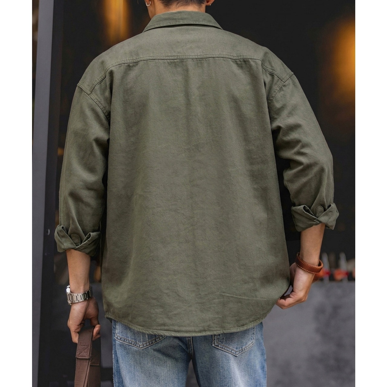 胸元の大きなポケットと切り替えデザインが目を引く、存在感のあるシャツ。