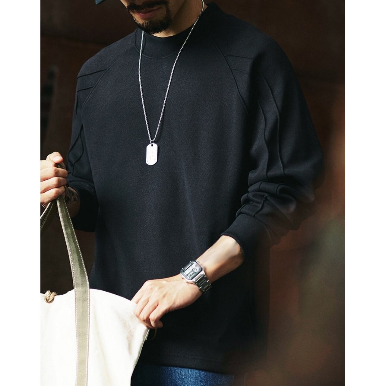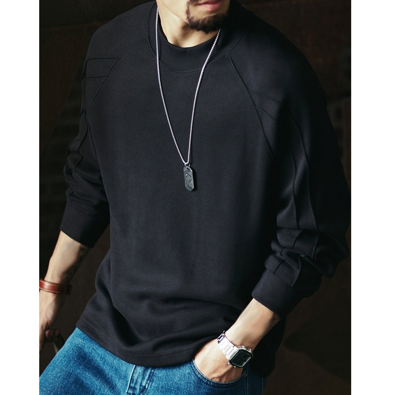 肩から袖にかけての立体的なラインが特徴的なロンT。