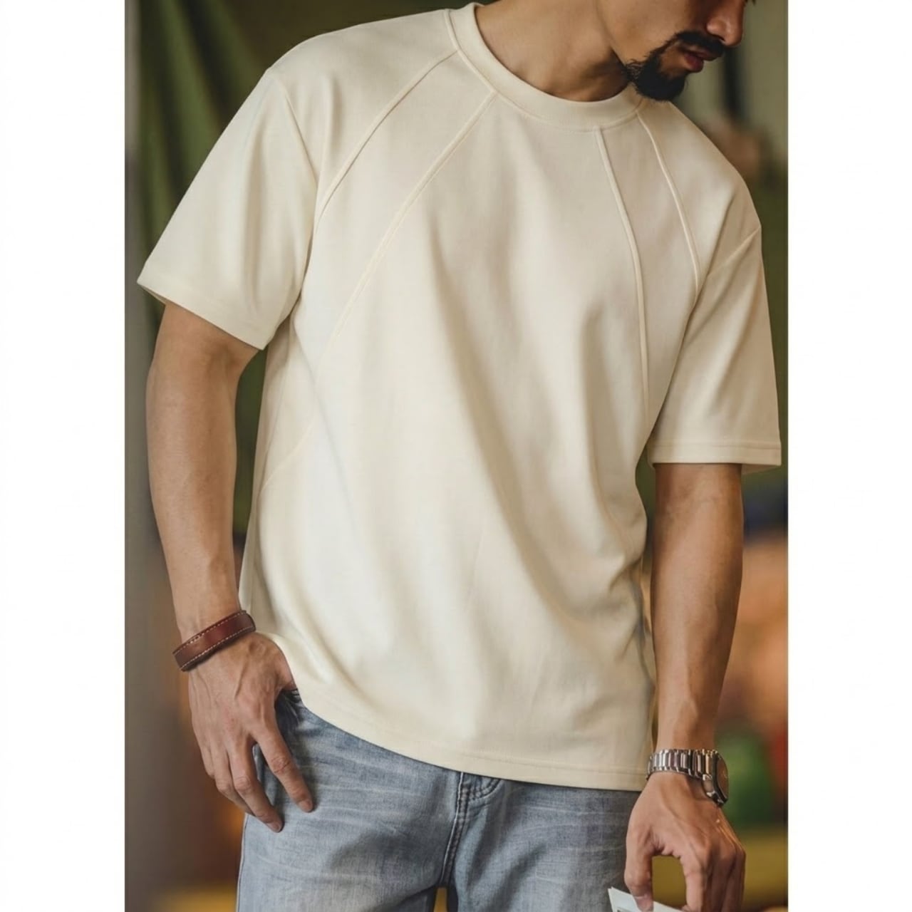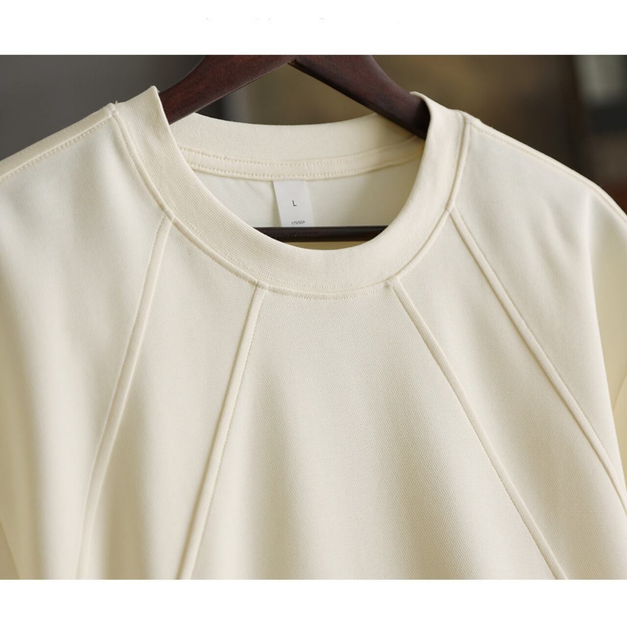肩から身頃にかけて入った斜めのラインが目を引くTシャツです。
