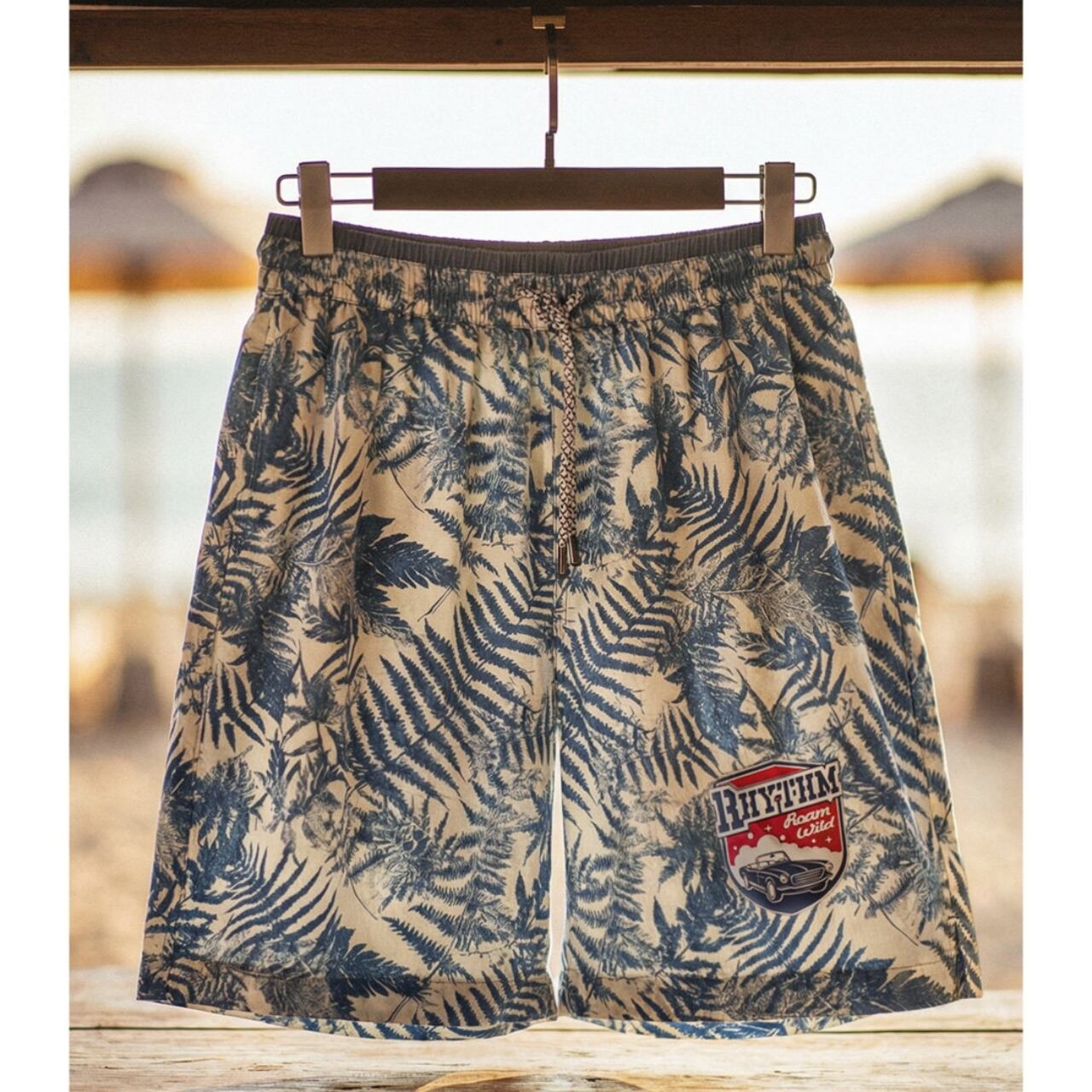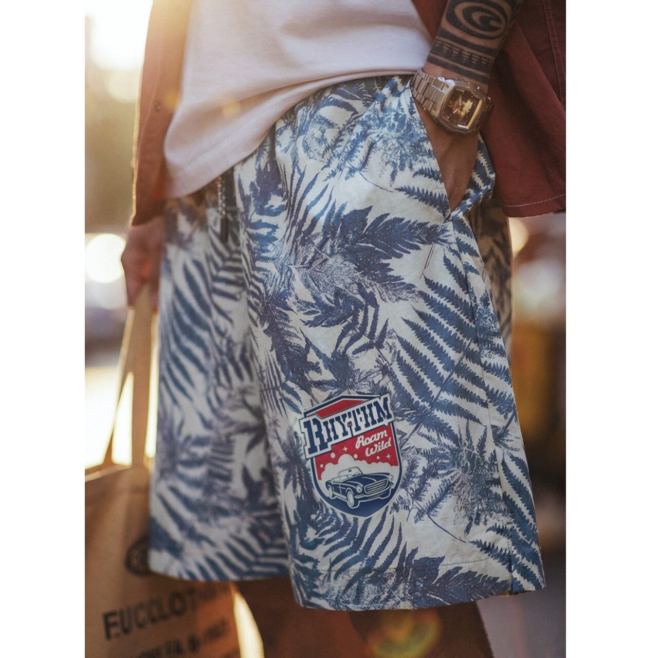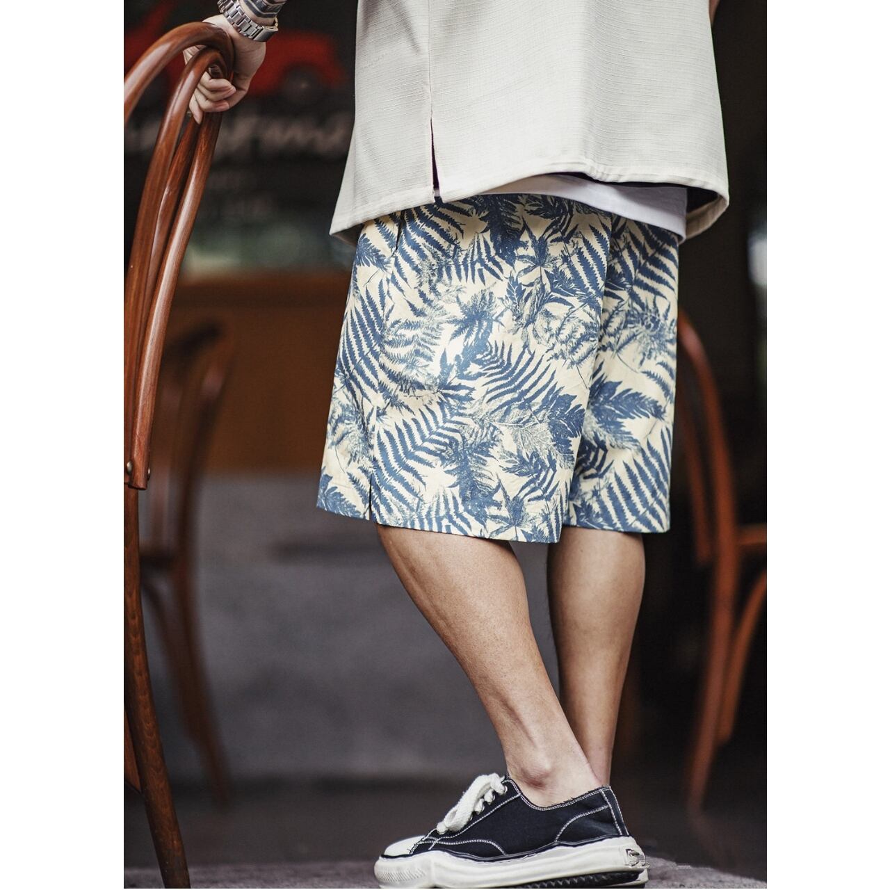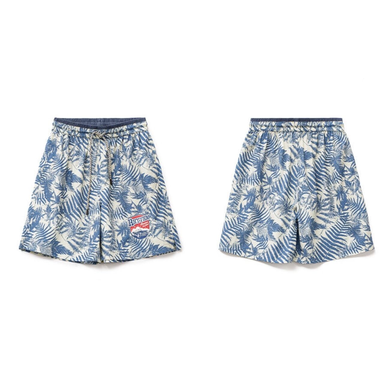 全体に広がる大きな葉の模様と、裾のロゴワッペンが印象的なハーフパンツです。