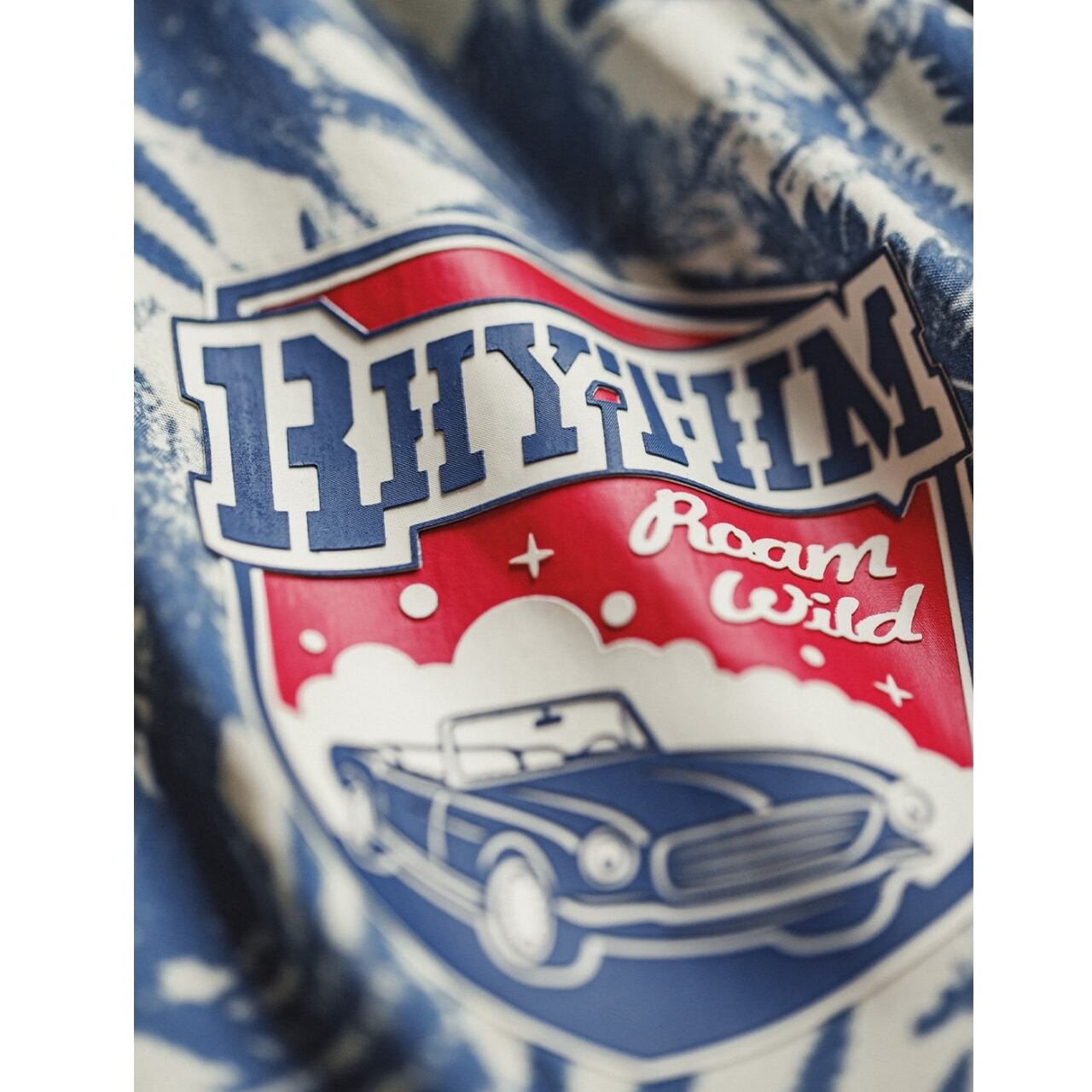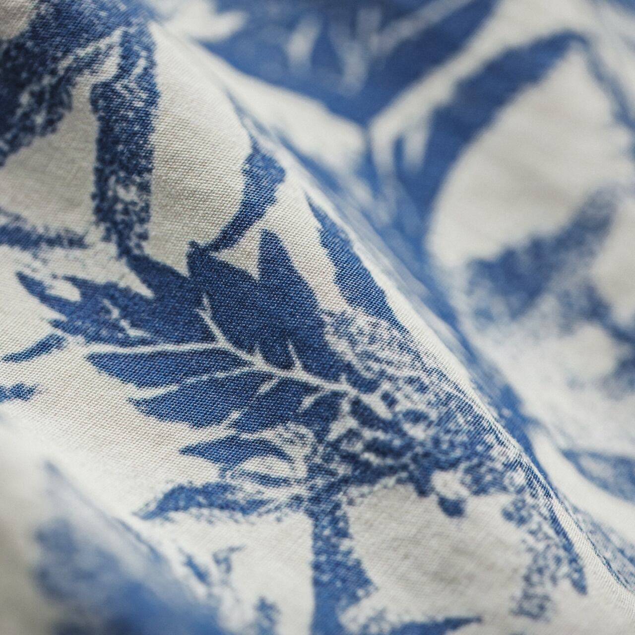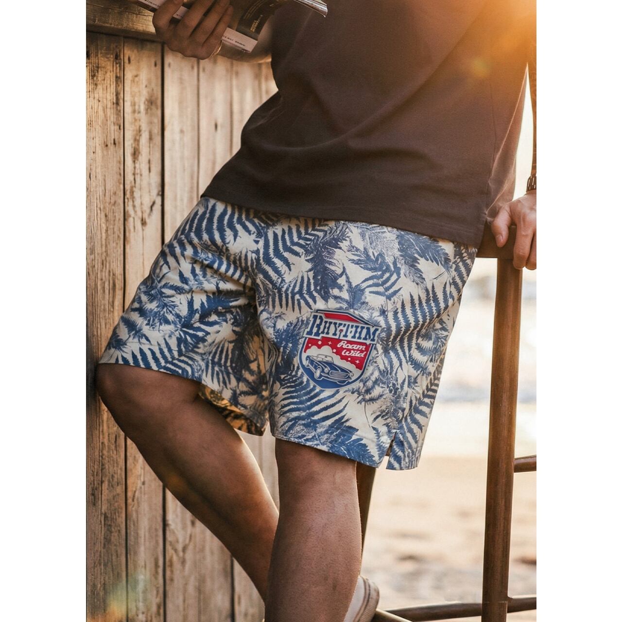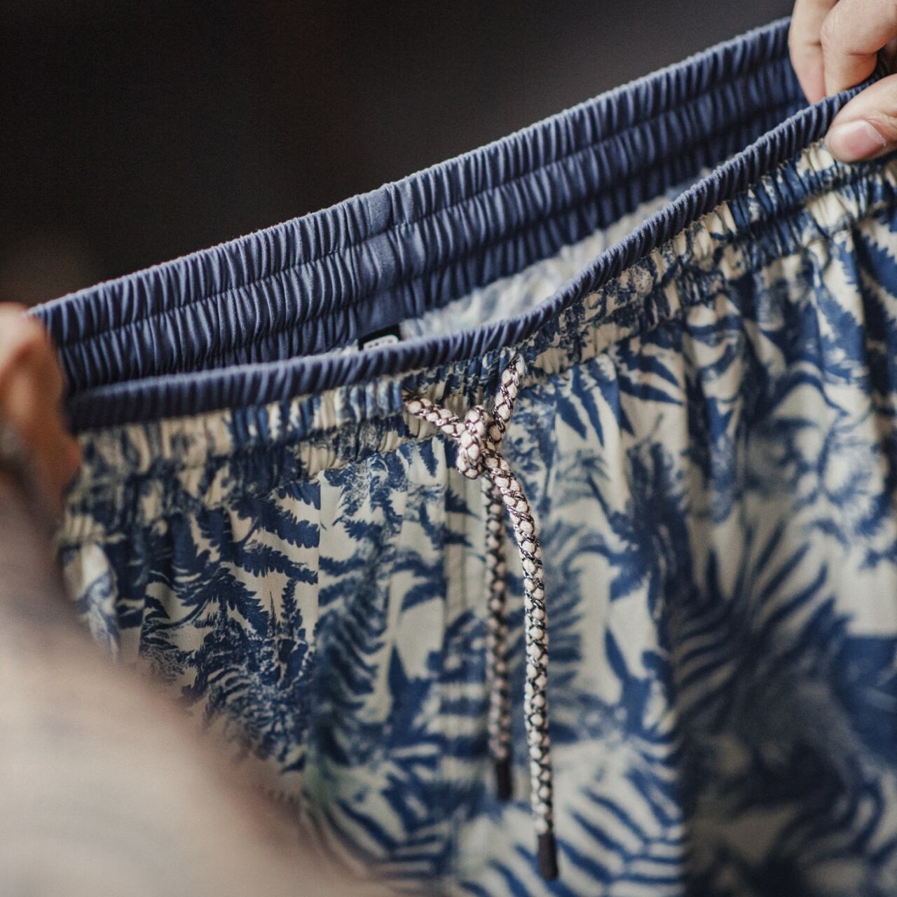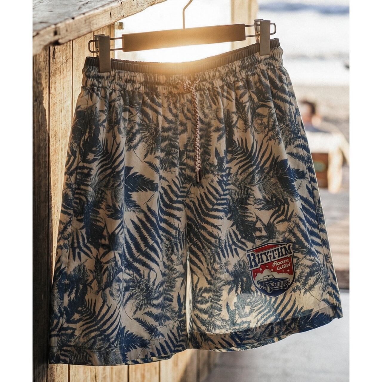 全体に広がる大きな葉の模様と、裾のロゴワッペンが印象的なハーフパンツです。