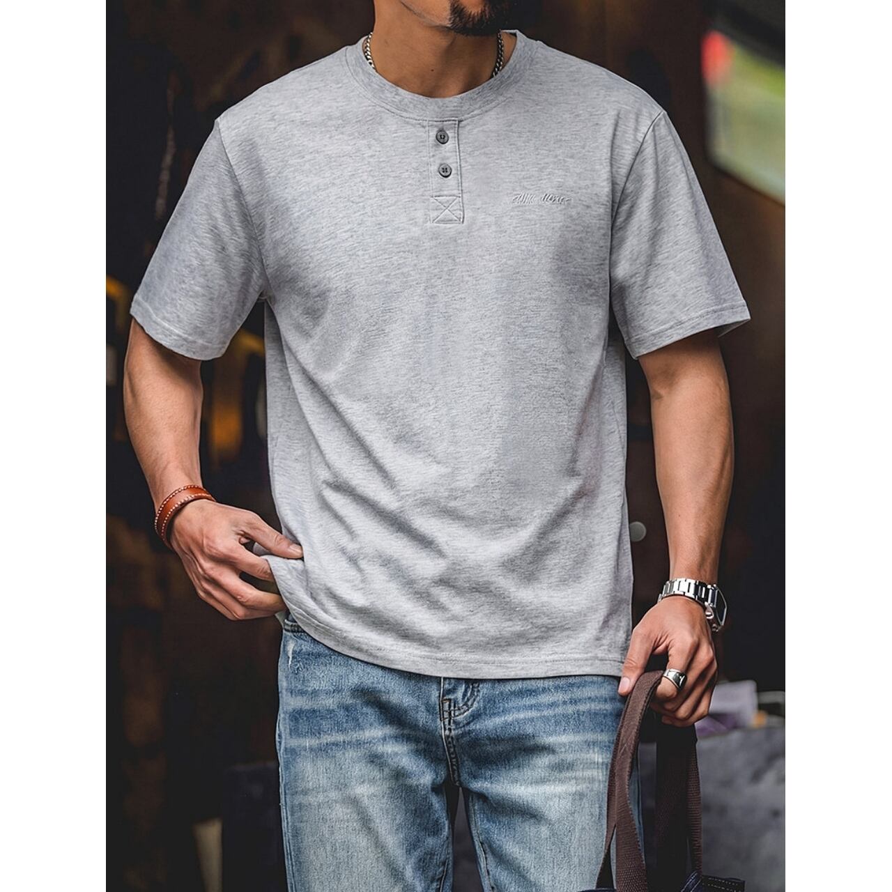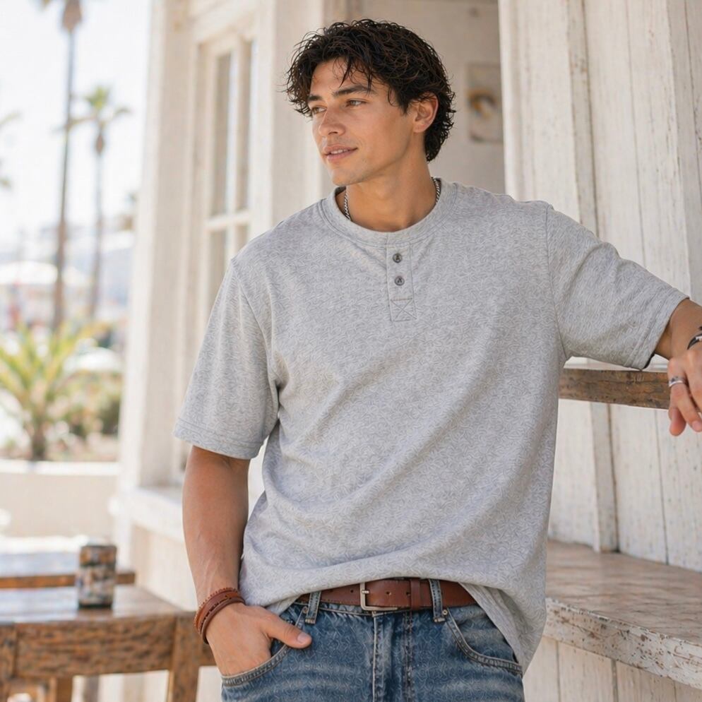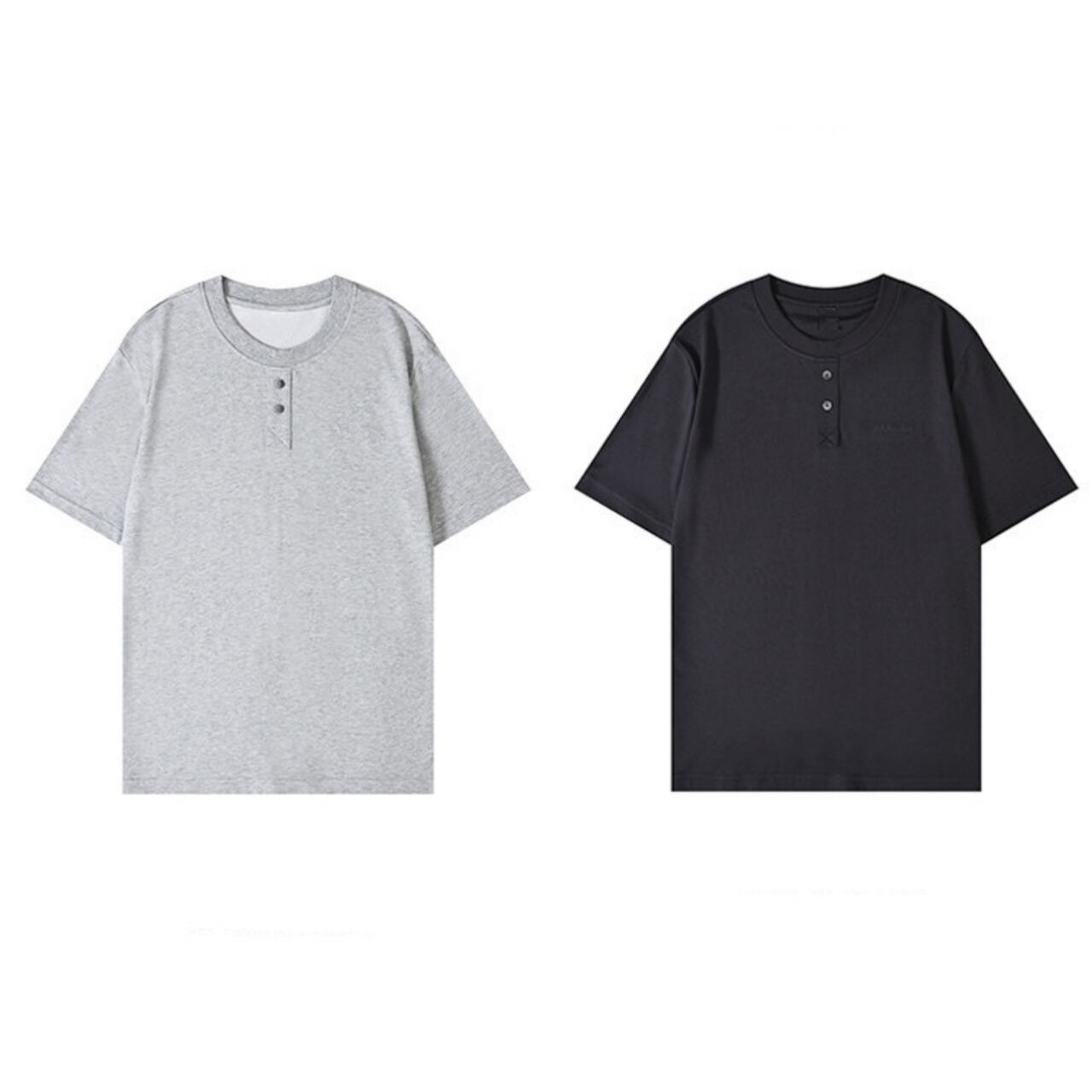 首元のボタンがアクセントになった、ヘンリーネックデザインのTシャツです。